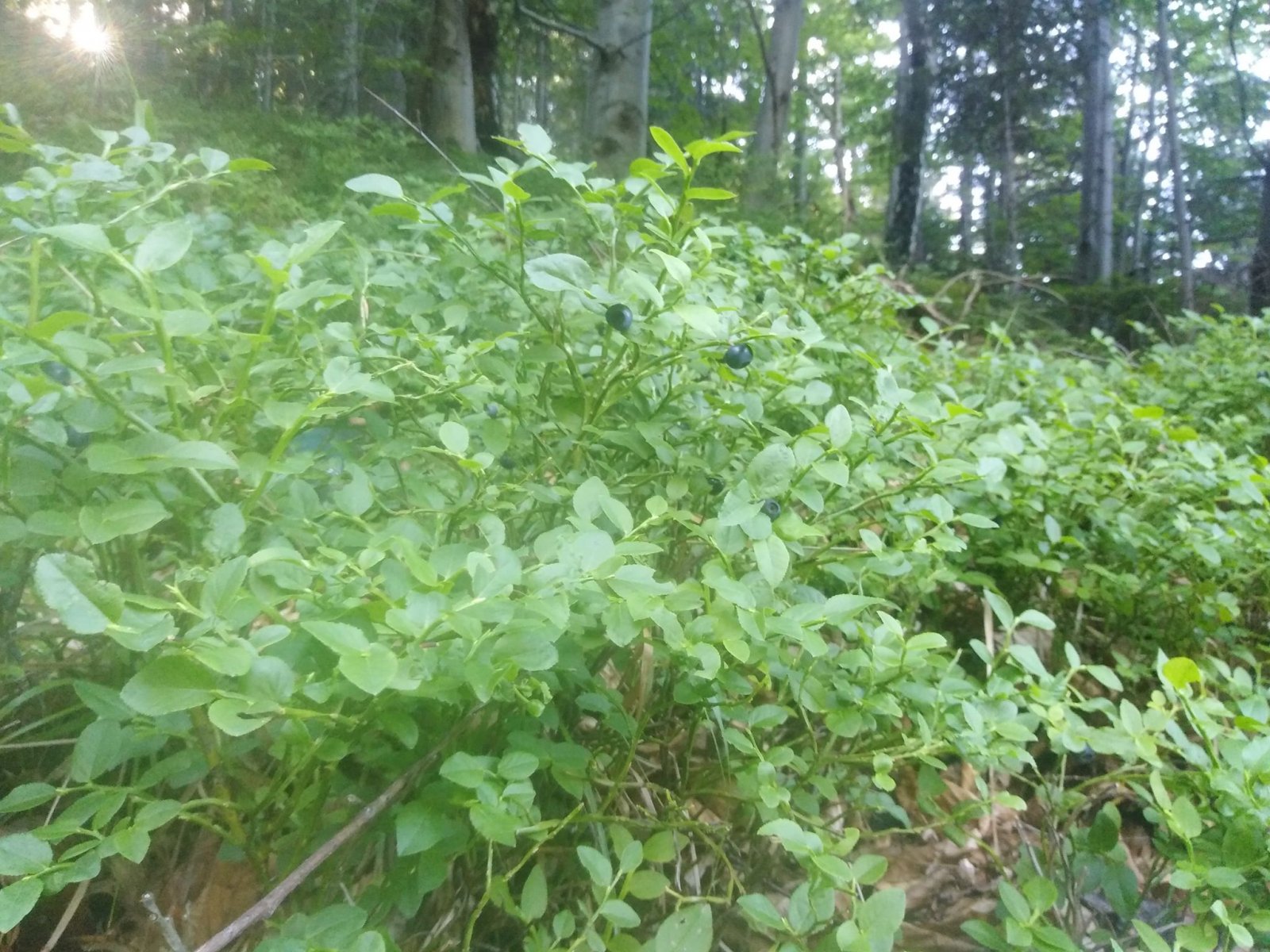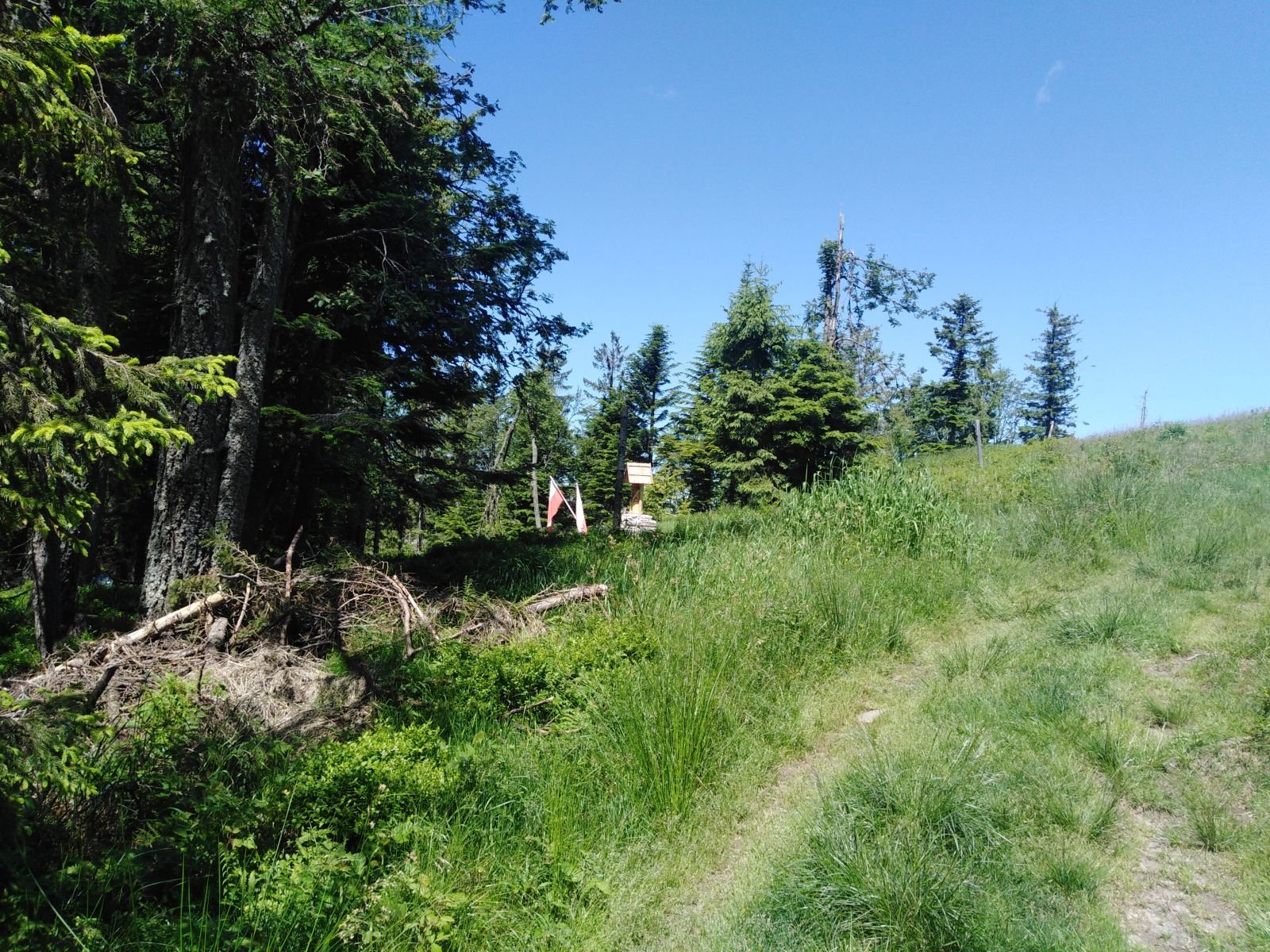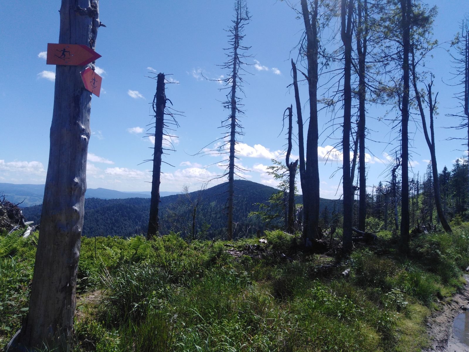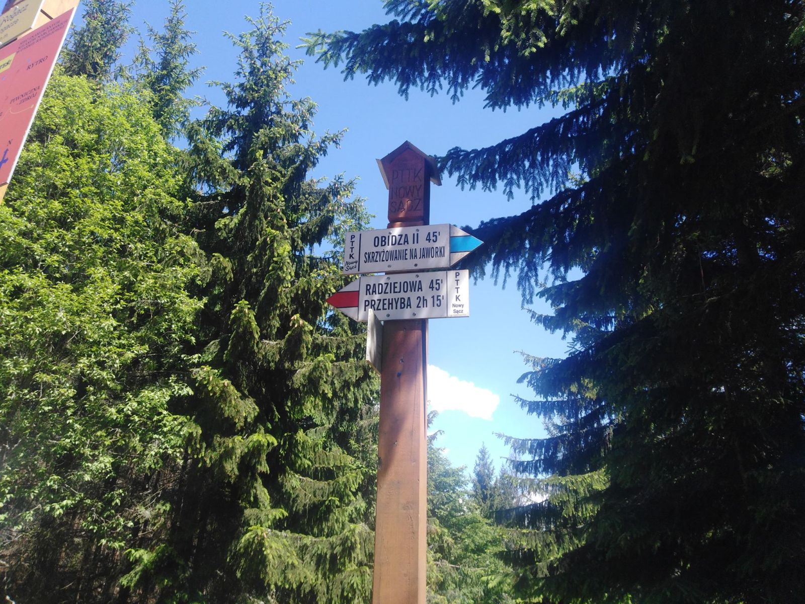 Lipcową wakacyjną wyprawę do Jaworek rozpoczeliśmy jak zwykle w Obidzy. Jak na turystów amatorów przystało wybraliśmy dzień w którym pogoda była pewna, bo nie lubimy chodzić przy padającym deszczu - o tak wygodniej. Dojście na Przehybę zajęło nam 3,5 godziny ( opis szlaku na Przehybę - kliknij) Po ubiegłotygodniowych deszczach na szlaku było bardzo mokro, w niektórych miejscach ścieżką płynął potoczek. Im byliśmy wyżej tym mniej wody było pod nogami, a u góry suchutko. Co ciekawe w początkowej fazie wycieczki czyli na terenie Łazów udało nam się znaleźć parę grzybów, ale tylko dwie sztuki donieśliśmy na Przehybę, po drodze resztę pogubiliśmy ;) Także w Łazach pojawiły się pierwsze dojrzałe borówki:) Ze wszystkich tras jakie do tej pory udało nam się przejść, zielony szlak na Przehybę jest naprawdę ciekawy, choć mało popularny. Na Przehybie byliśmy około 10:30 , i o tej godzinie turystów można było policzyć na palcach jednej dłoni a było ich pięcioro;) Do momentu skrzyżowania szlaków na Wielkim Rogaczu (zdjęcie poniżej) szliśmy taką samą trasą jak tą do Młodowa (kliknij) Na Przehybie dość mocno wiało i jak na tą wysokość i godzinę było też naprawdę ciepło.