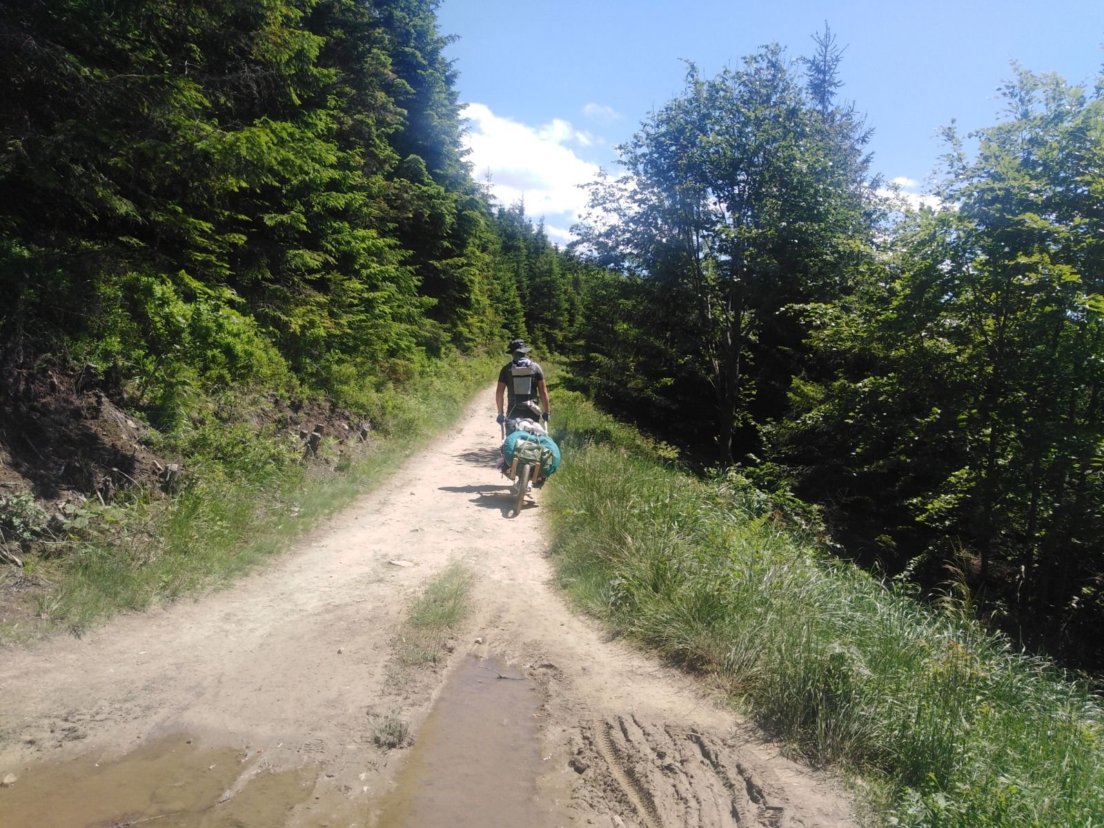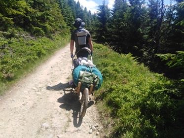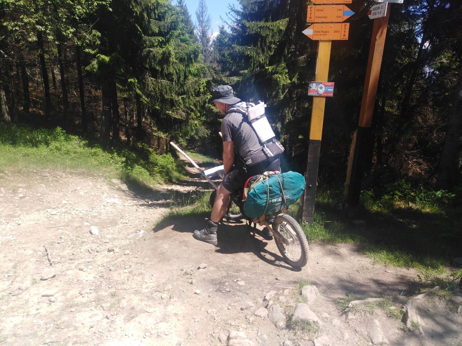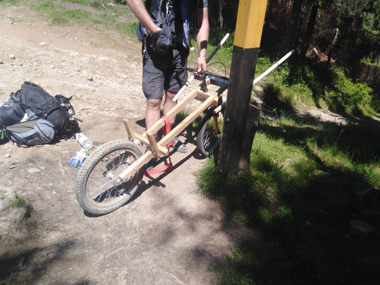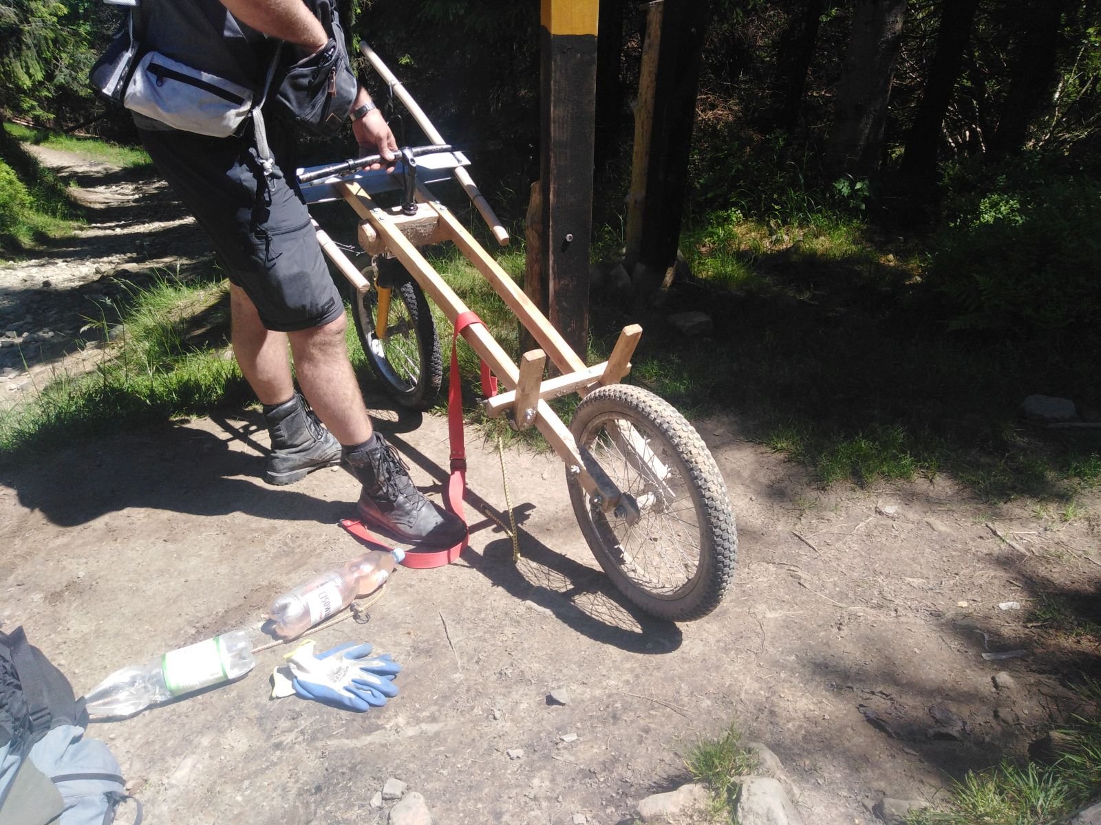 Turysta kierował się tak jak my poprzednio na Rytro-Młodów, i jak wspomniał planował trochę pomóc sobie;) zjeżdżając ile się da na swoim prototypie, który zamienił z wózka na nazwijmy to rower. Konstrukcja z hamulcami na przodzie, choć jak przyznał na następny rok musi wnieść sporo poprawek do tego pojazdu np. nie zawsze da się go zatrzymać:) Wspomniał, że z tym sprzętem najtrudniej szło mu się z Krościenka na Przehybę.
