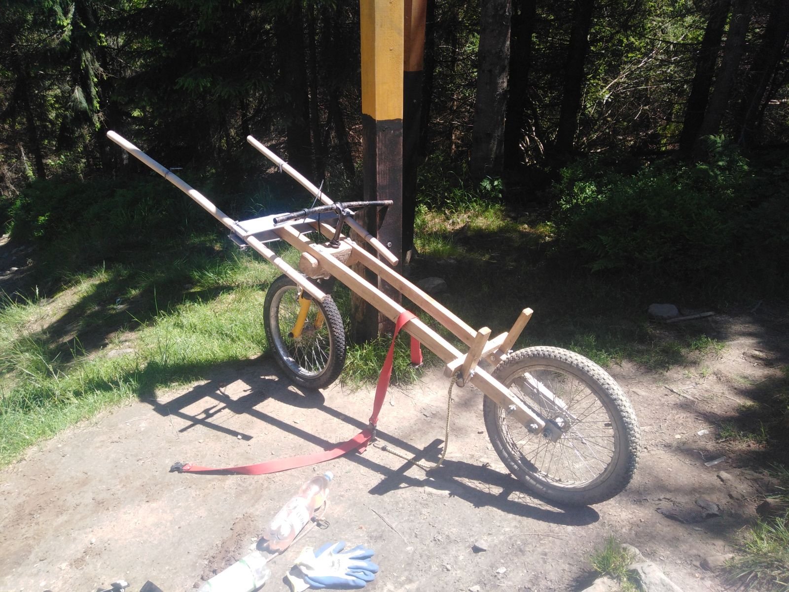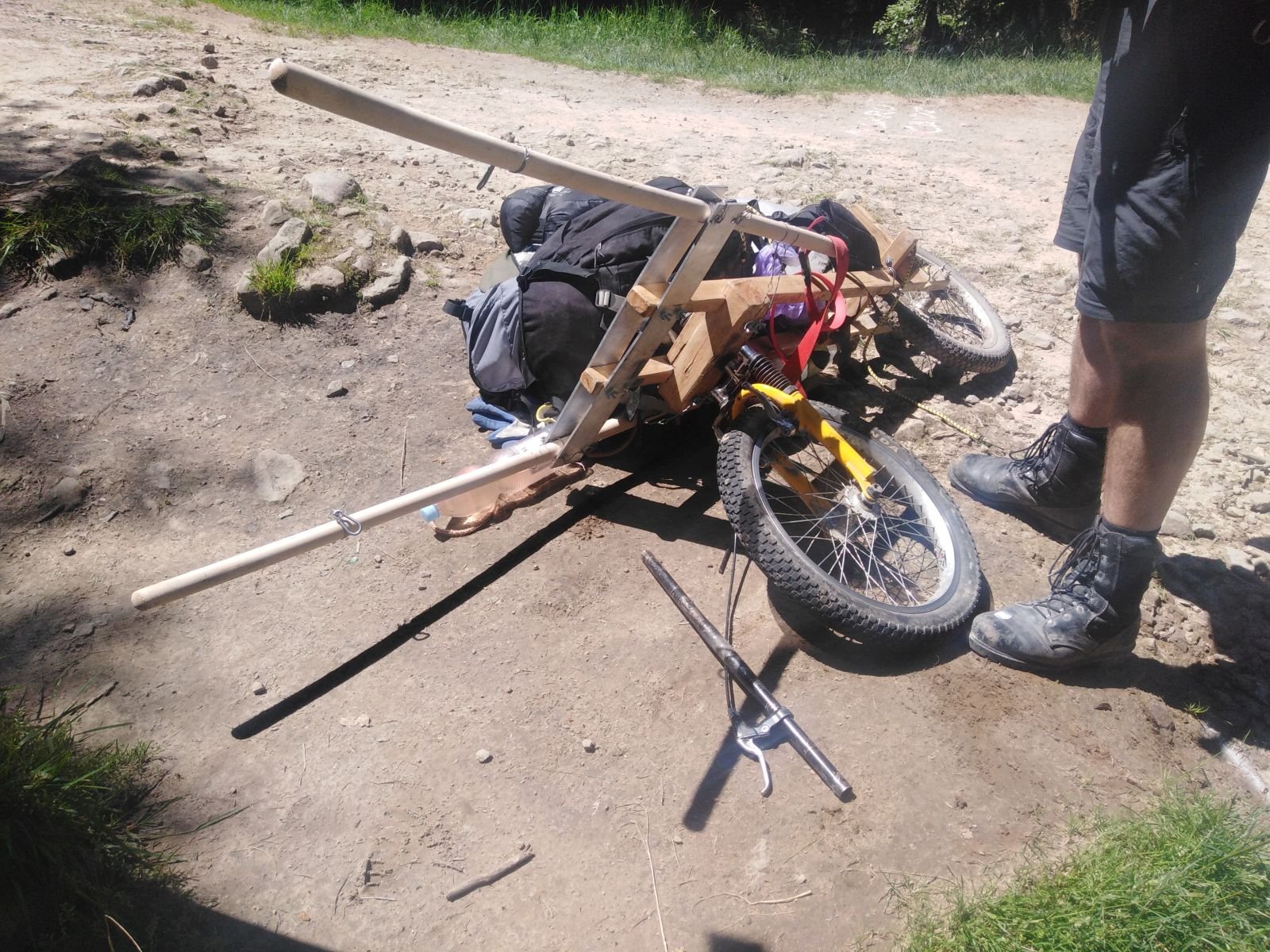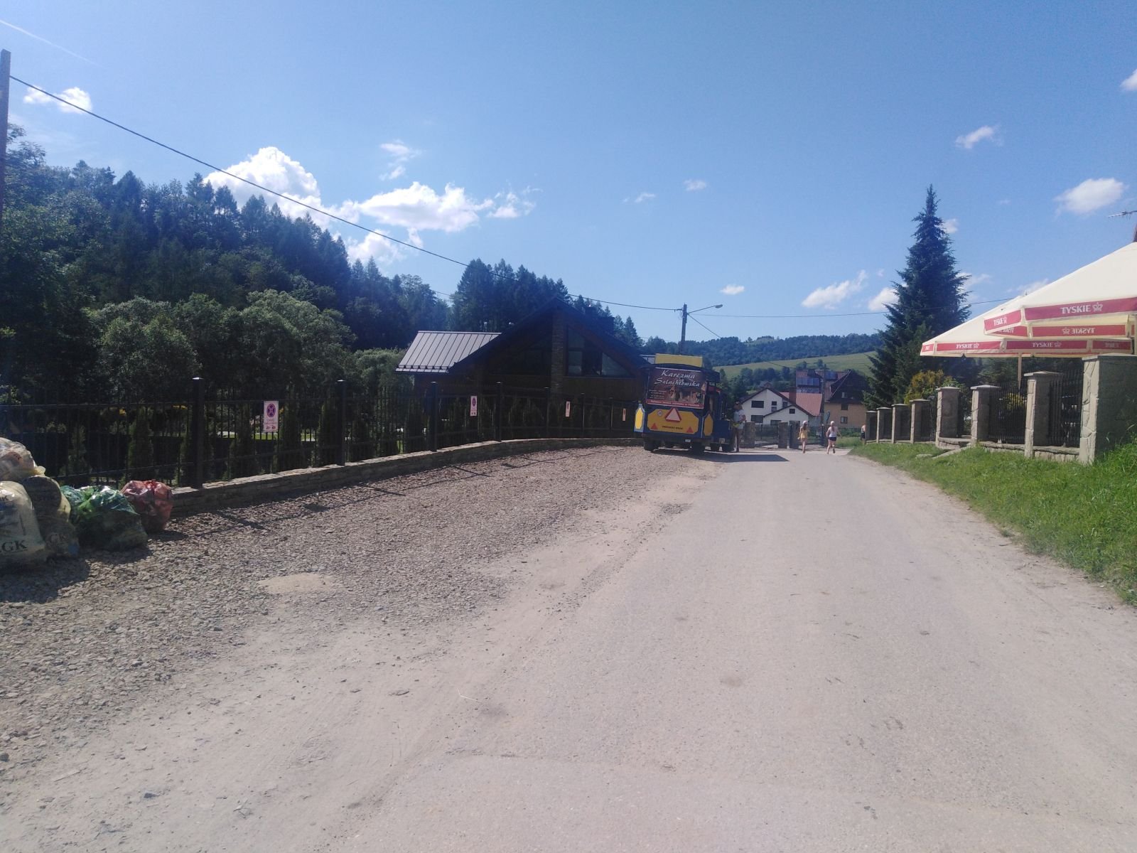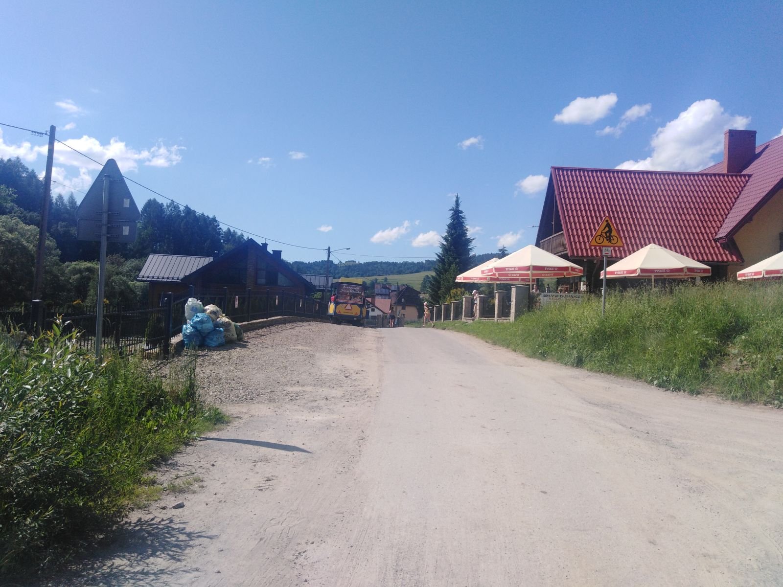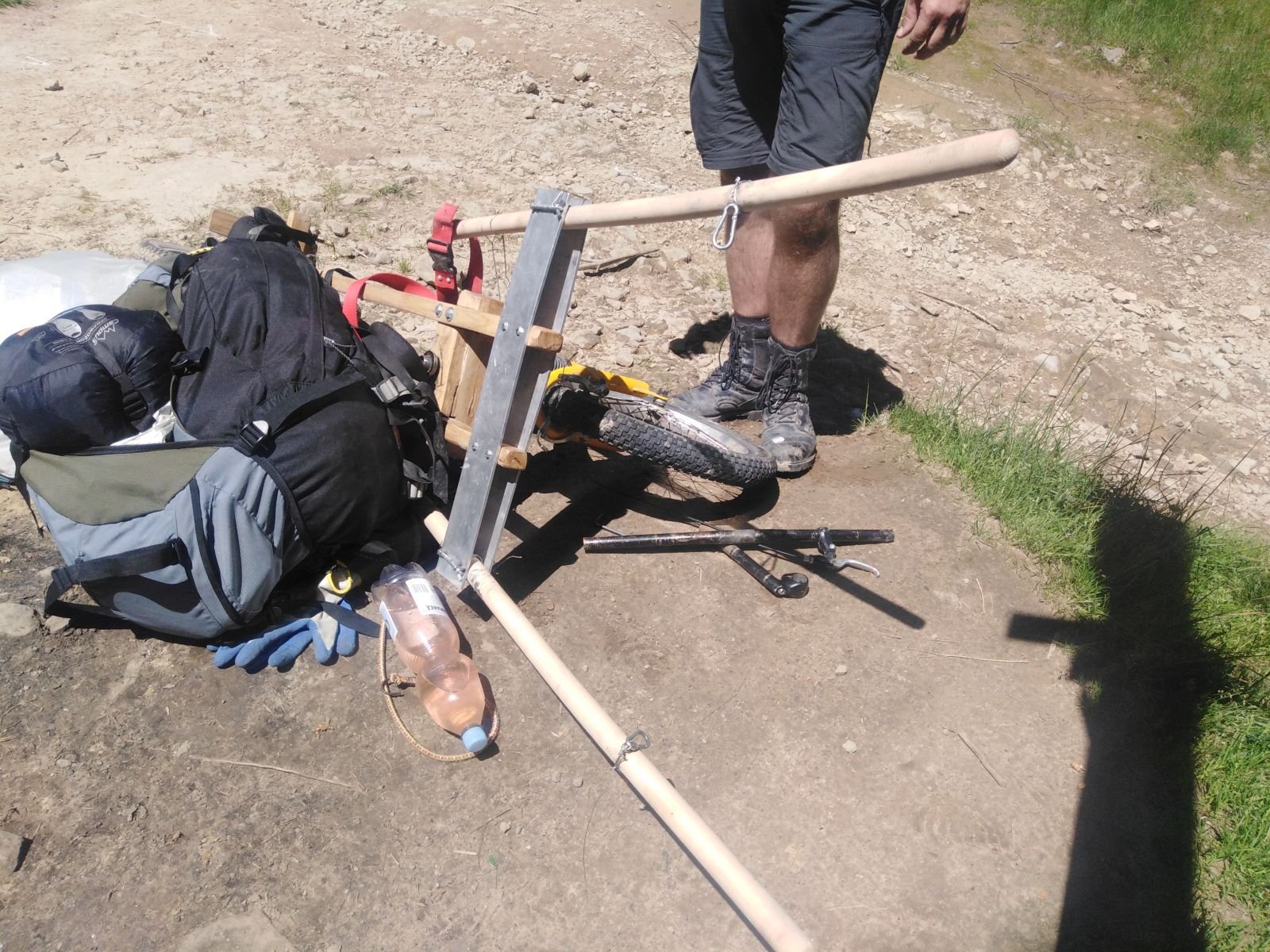 Turysta kierował się tak jak my poprzednio na Rytro-Młodów, i jak wspomniał planował trochę pomóc sobie;) zjeżdżając ile się da na swoim prototypie, który zamienił z wózka na nazwijmy to rower. Konstrukcja z hamulcami na przodzie, choć jak przyznał na następny rok musi wnieść sporo poprawek do tego pojazdu np. nie zawsze da się go zatrzymać:) Wspomniał, że z tym sprzętem najtrudniej szło mu się z Krościenka na Przehybę.