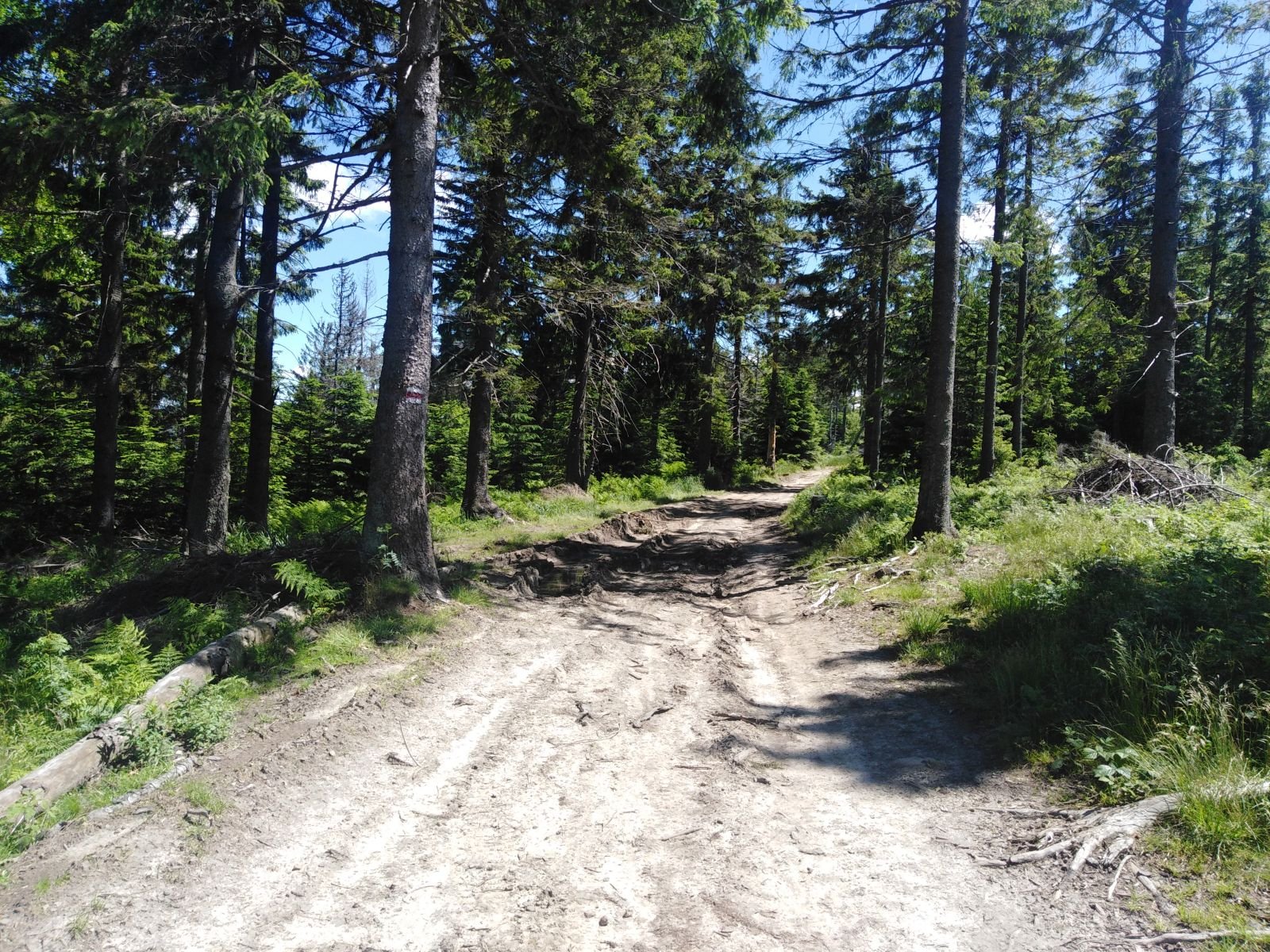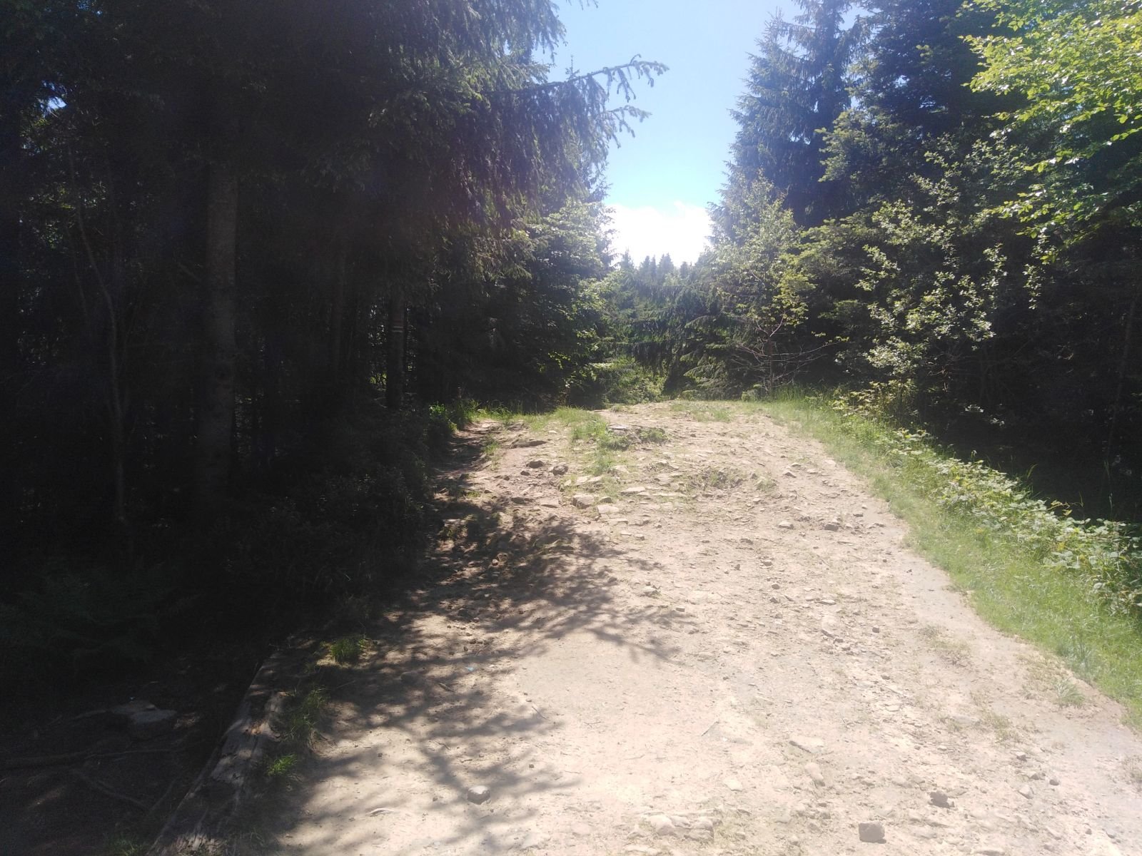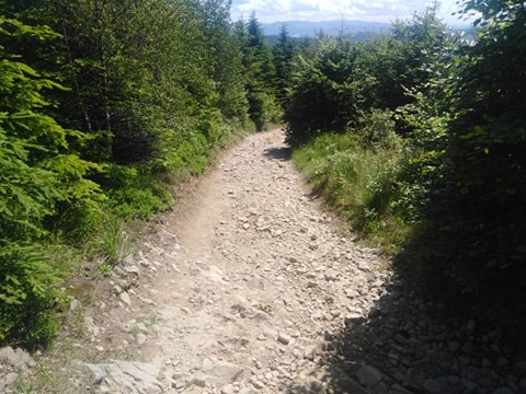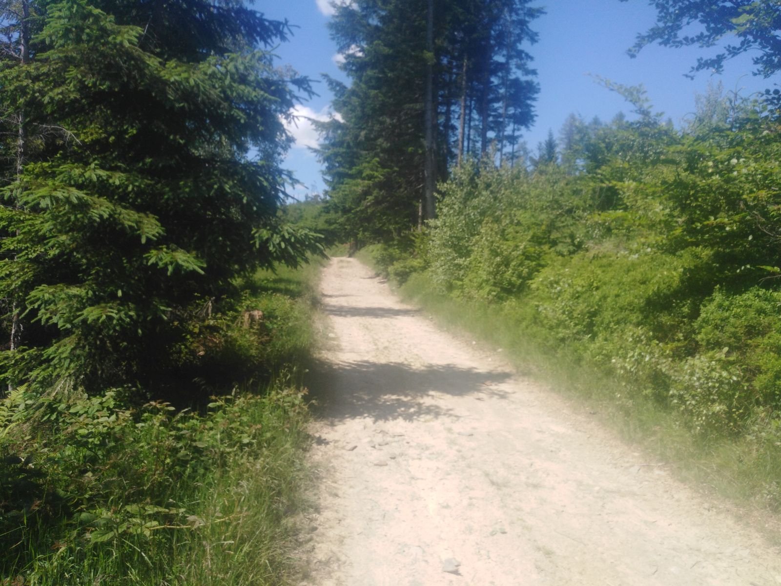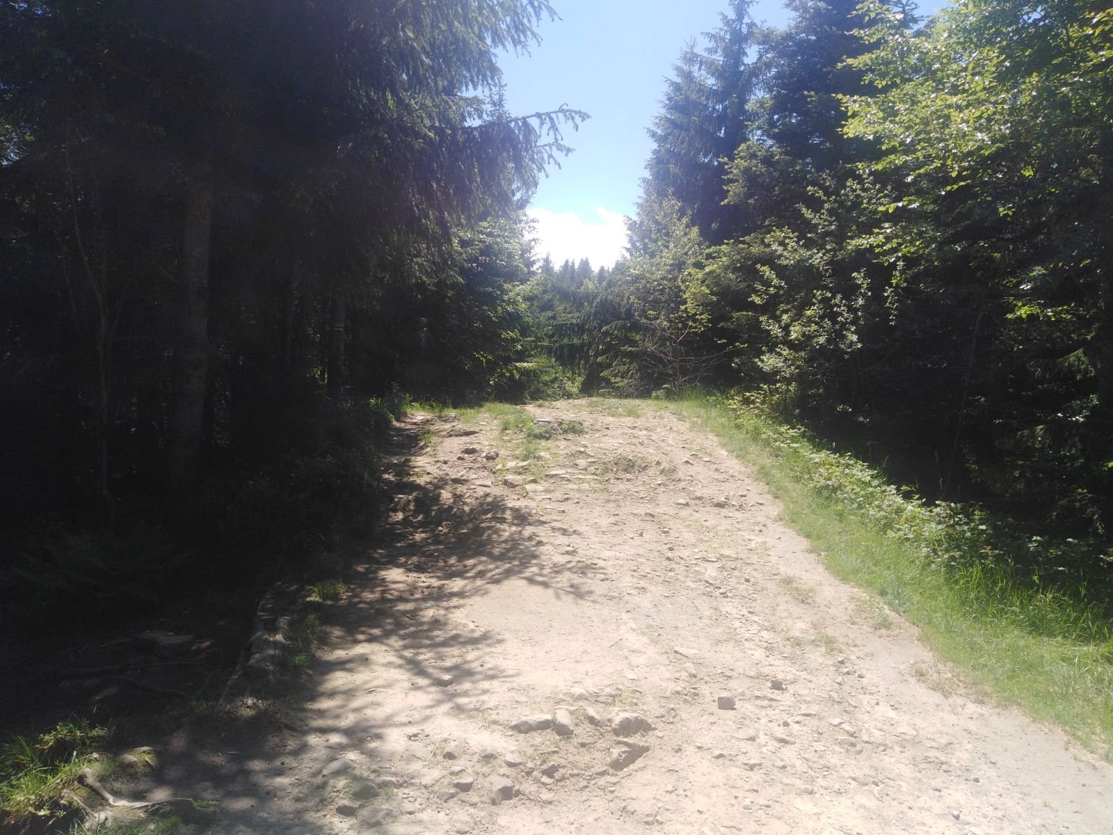Zejście na skrzyżowanie na Jaworki czyli na Litawcową 967 m n.p.m. dość strome, na drodze sporo kamyków po ostatnich opadach (zdjęcie poniżej). Spotykamy też coraz więcej turystów co ciekawe prawie każdy ze Śląska wypoczywający w naszych rejonach.