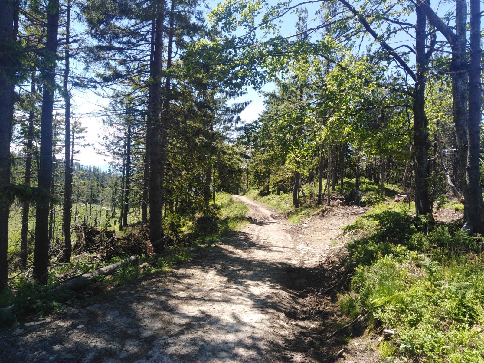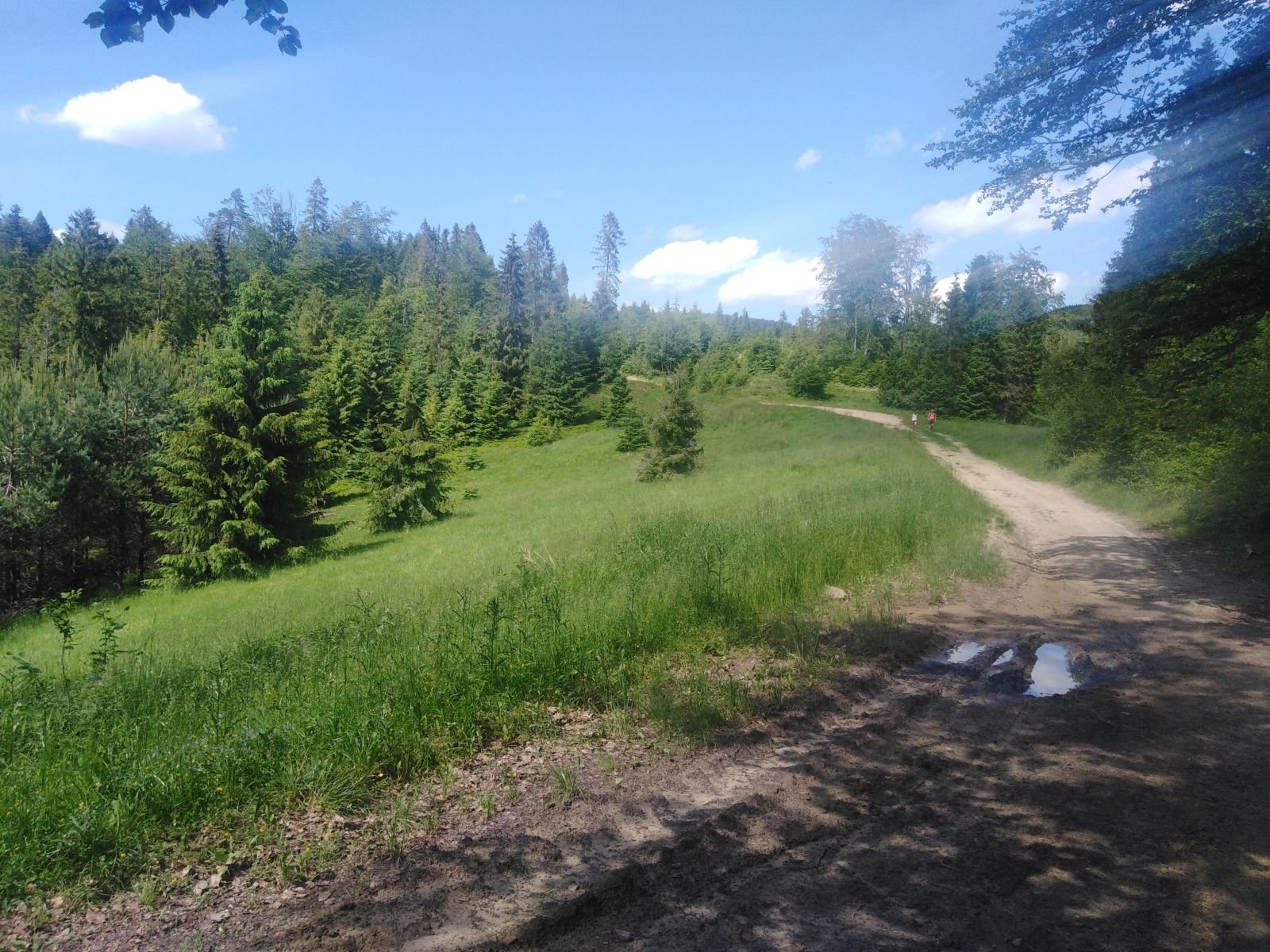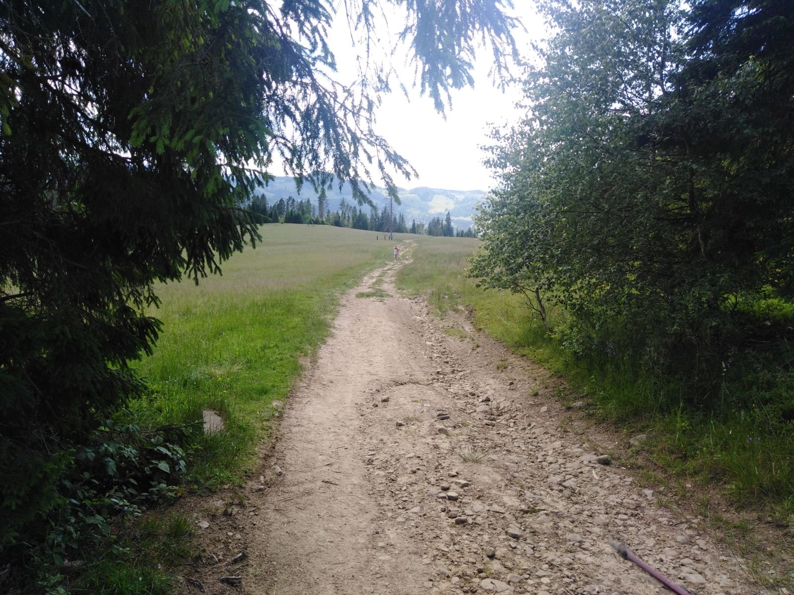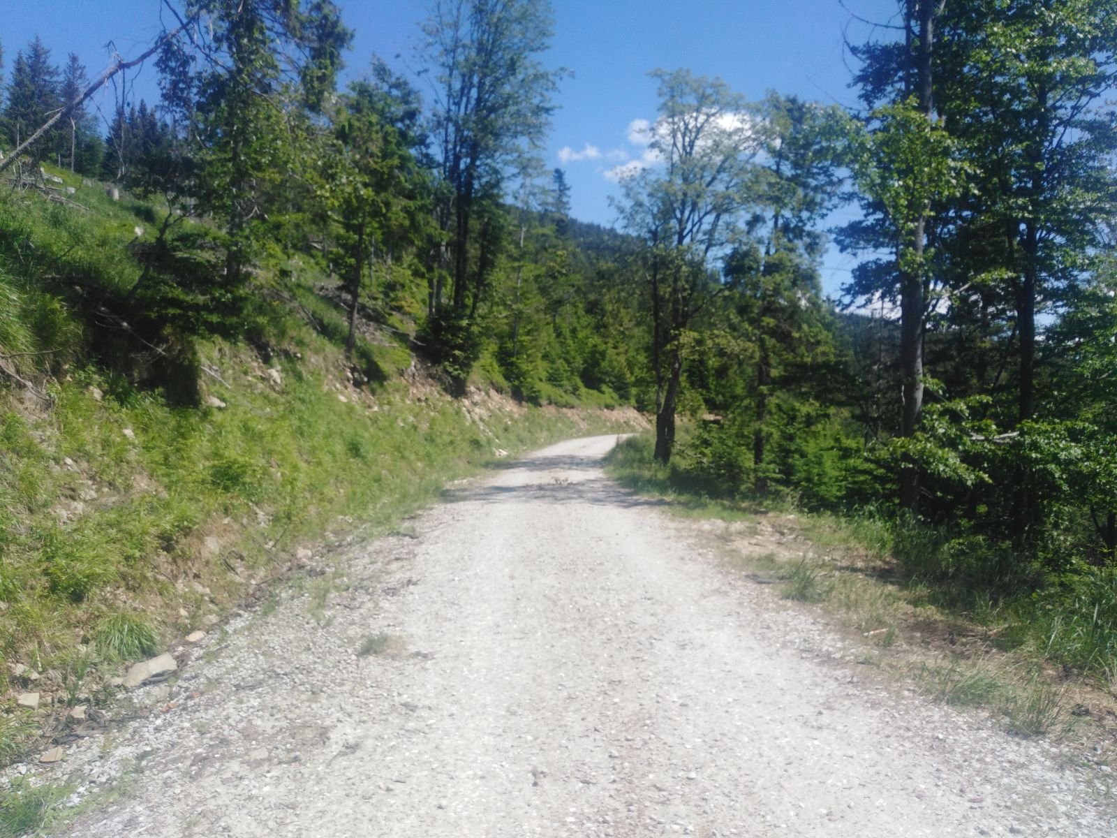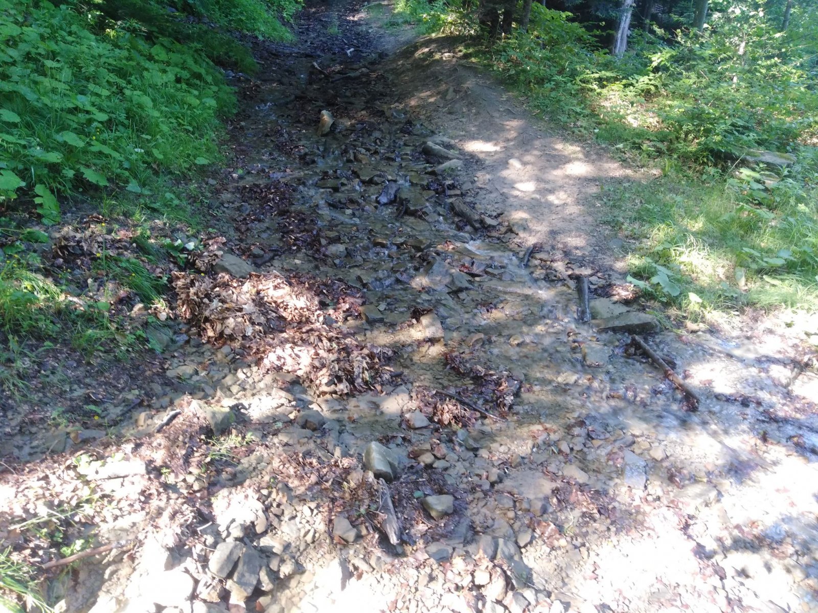 Zejście na skrzyżowanie na Jaworki czyli na Litawcową 967 m n.p.m. dość strome, na drodze sporo kamyków po ostatnich opadach (zdjęcie poniżej). Spotykamy też coraz więcej turystów co ciekawe prawie każdy ze Śląska wypoczywający w naszych rejonach.