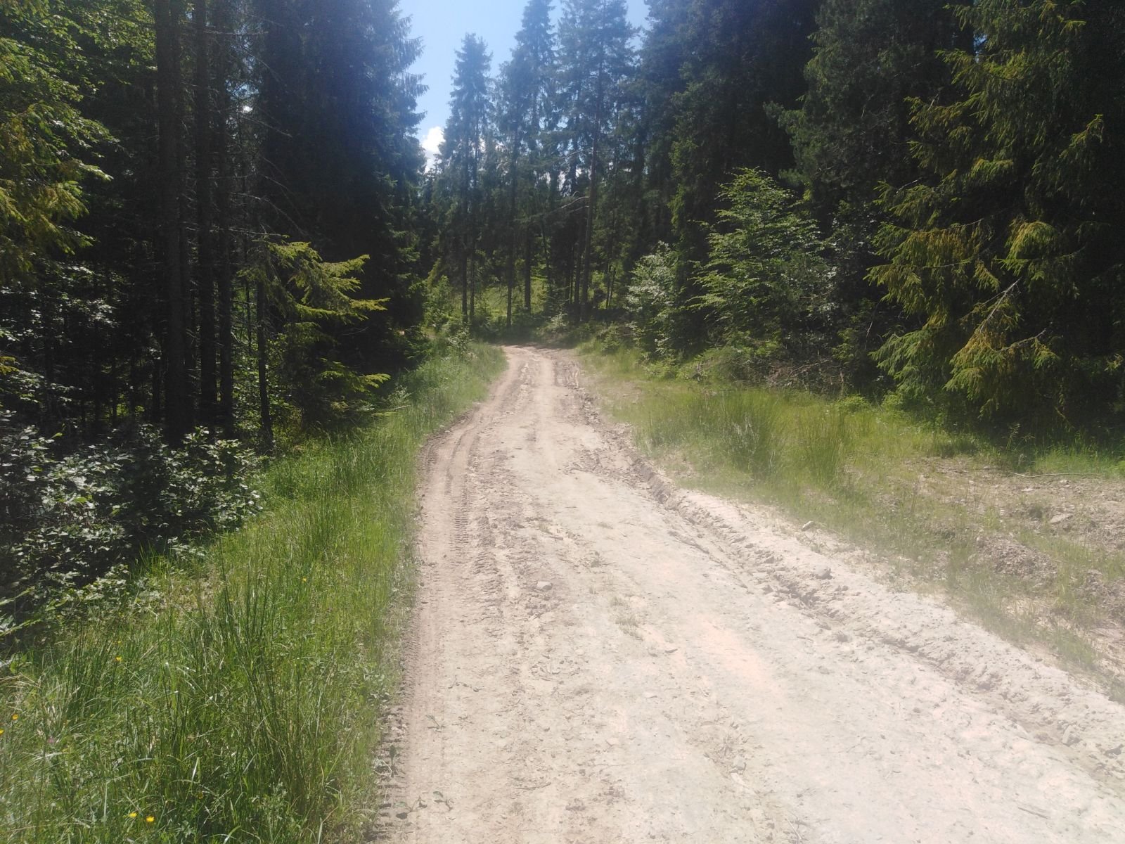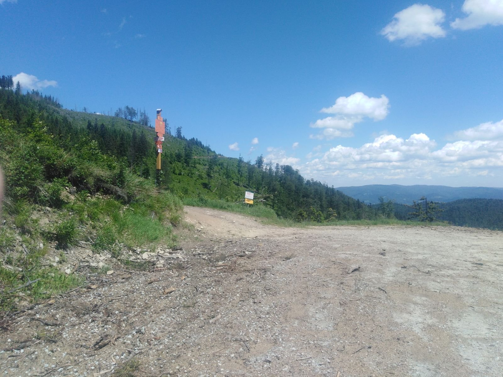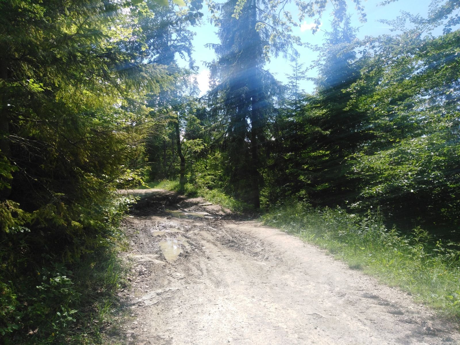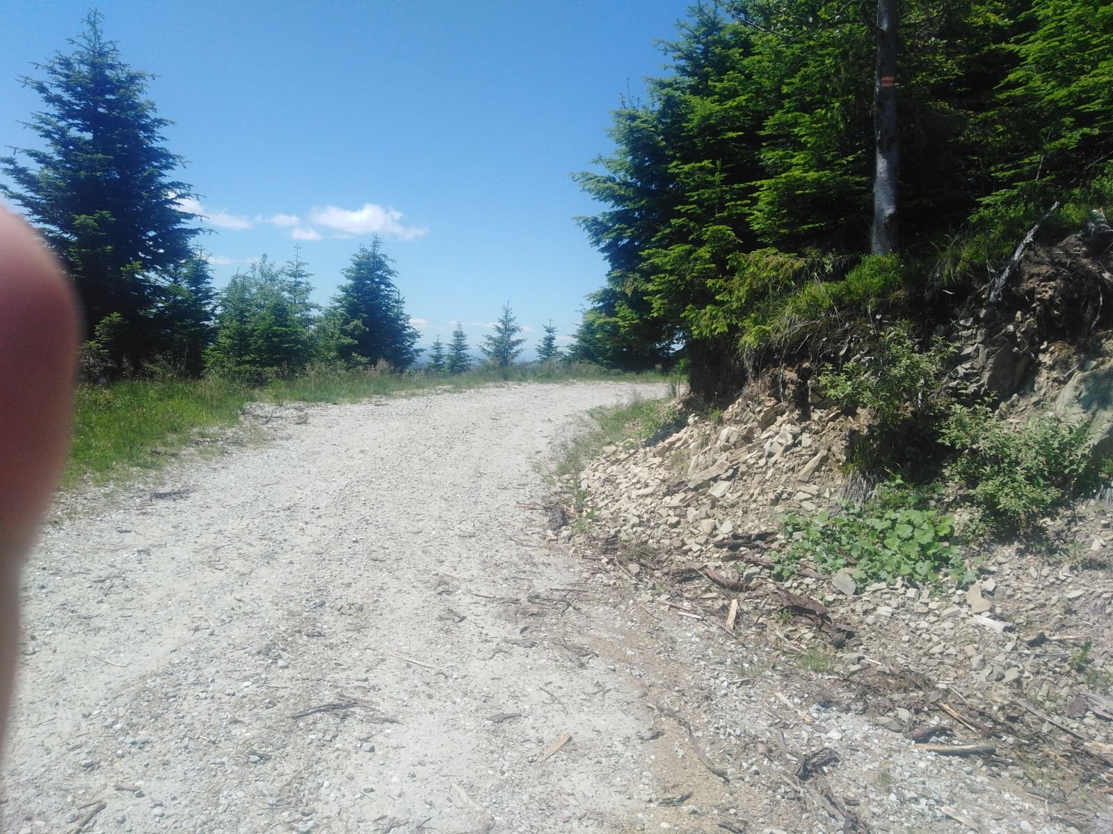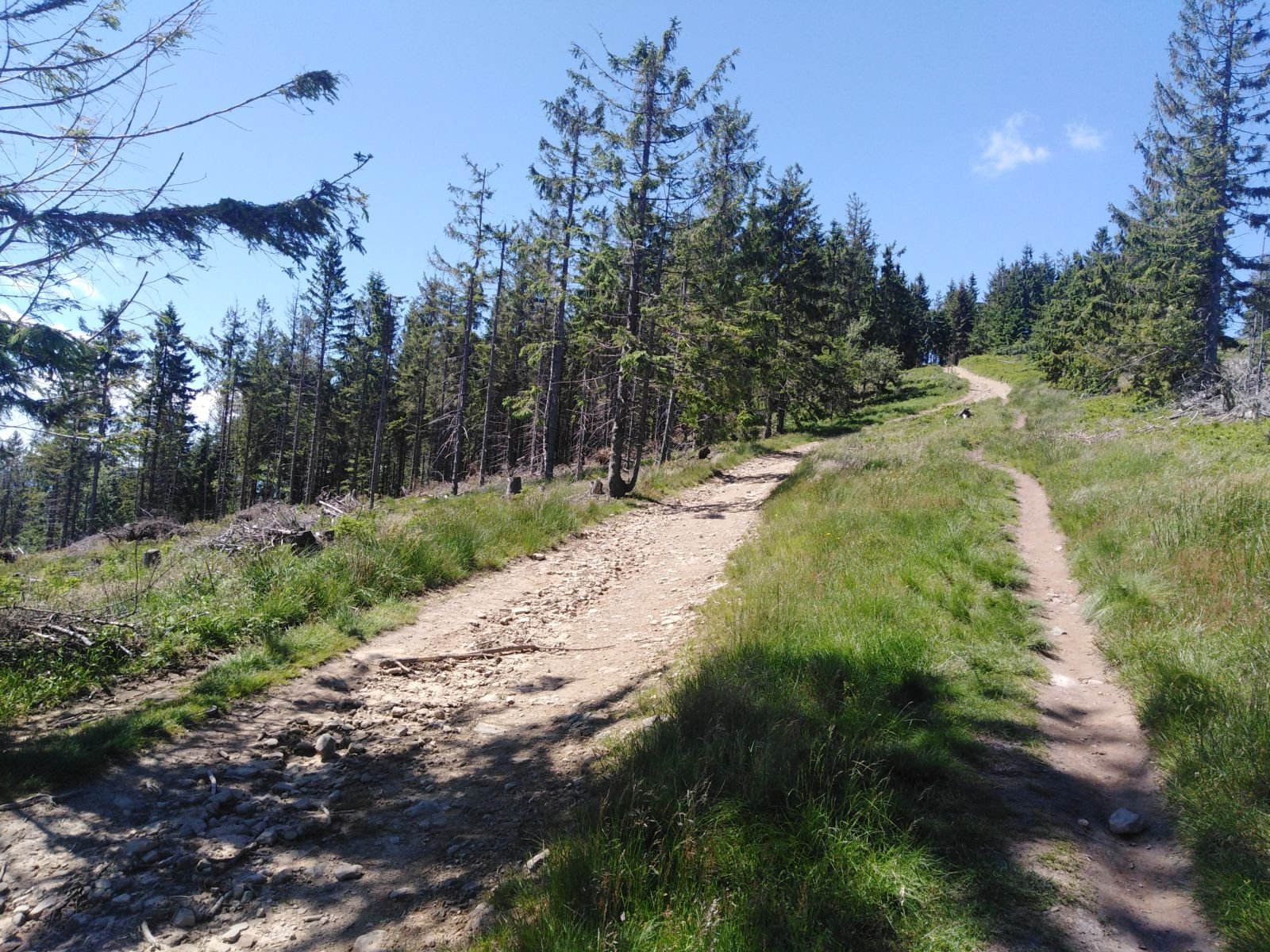 Zejście na skrzyżowanie na Jaworki czyli na Litawcową 967 m n.p.m. dość strome, na drodze sporo kamyków po ostatnich opadach (zdjęcie poniżej). Spotykamy też coraz więcej turystów co ciekawe prawie każdy ze Śląska wypoczywający w naszych rejonach.