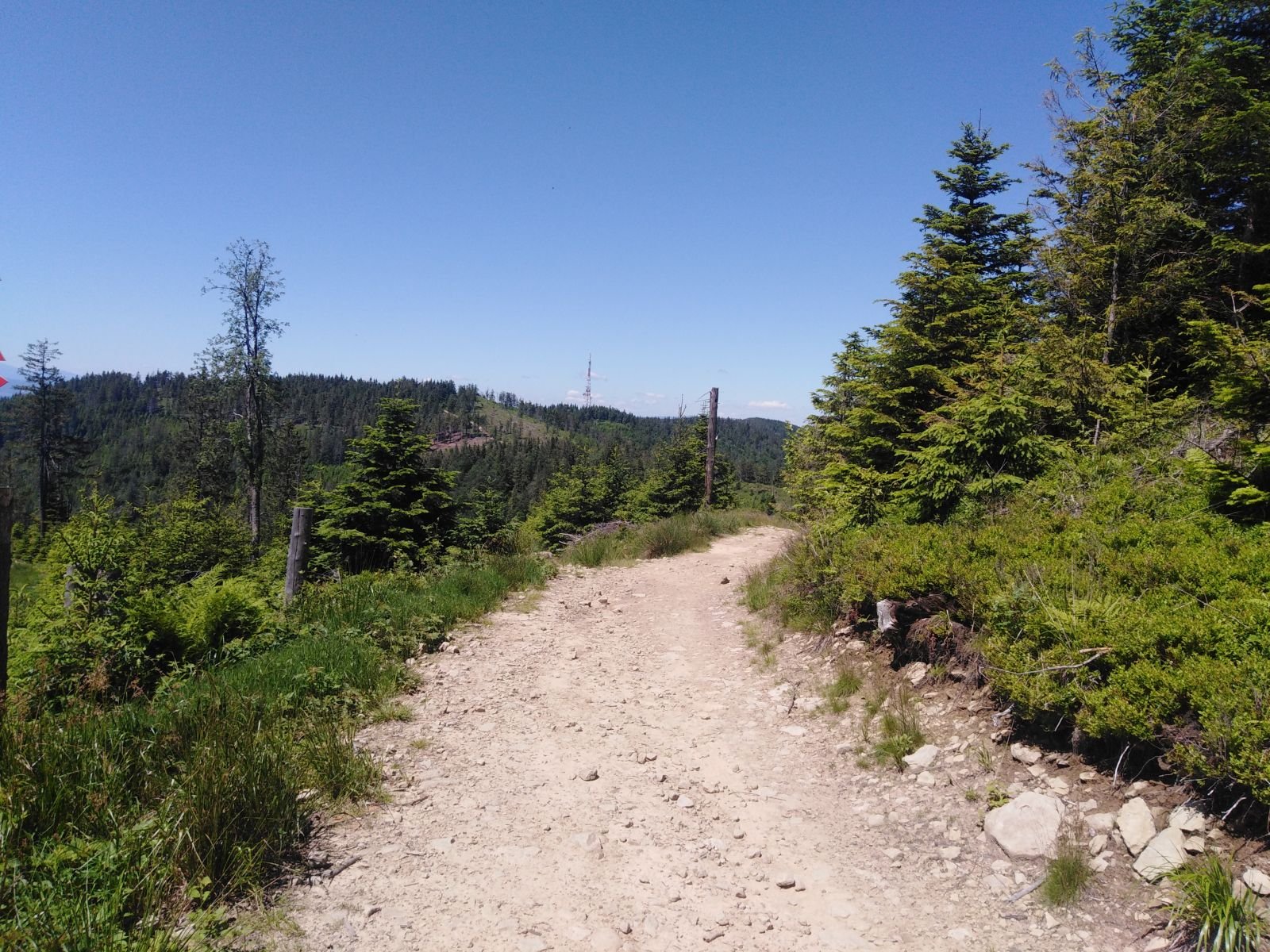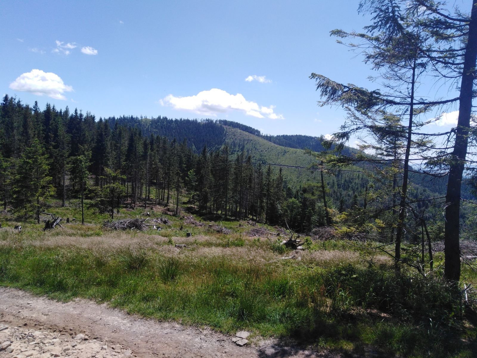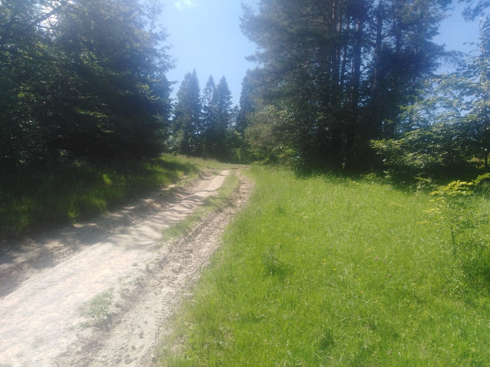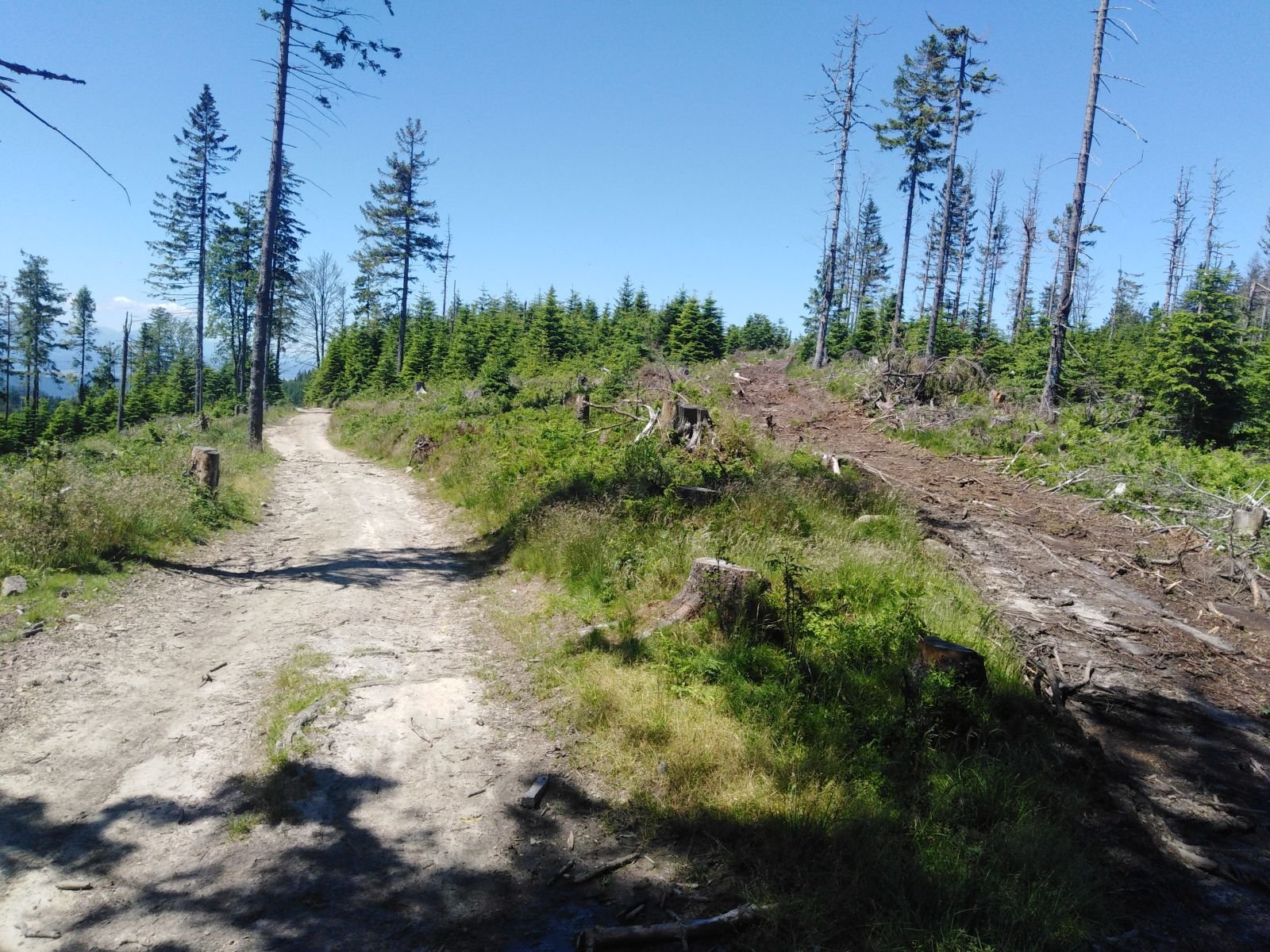 Zejście na skrzyżowanie na Jaworki czyli na Litawcową 967 m n.p.m. dość strome, na drodze sporo kamyków po ostatnich opadach (zdjęcie poniżej). Spotykamy też coraz więcej turystów co ciekawe prawie każdy ze Śląska wypoczywający w naszych rejonach.