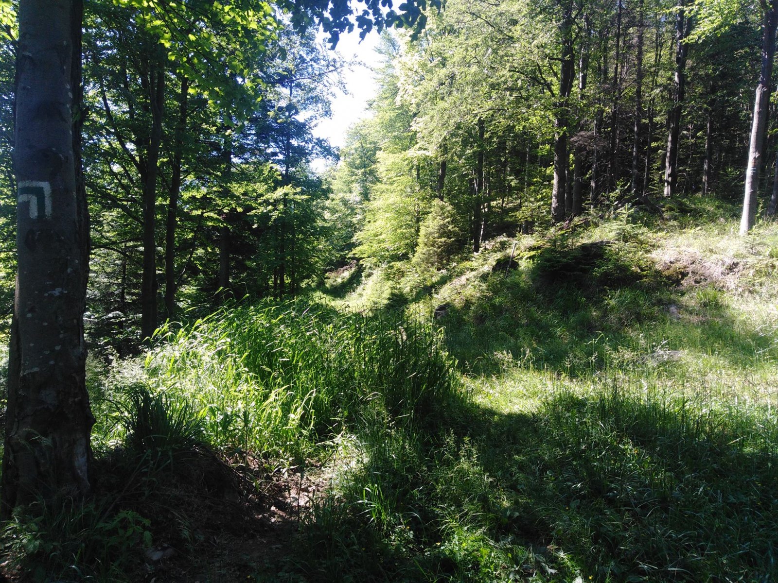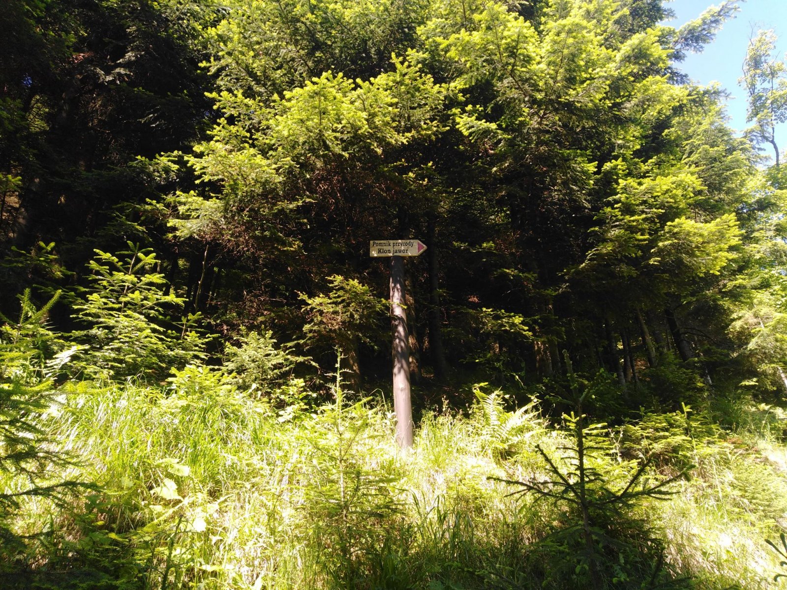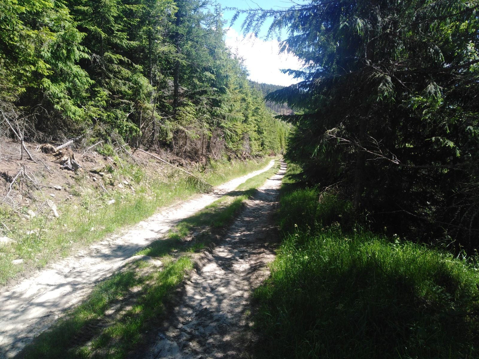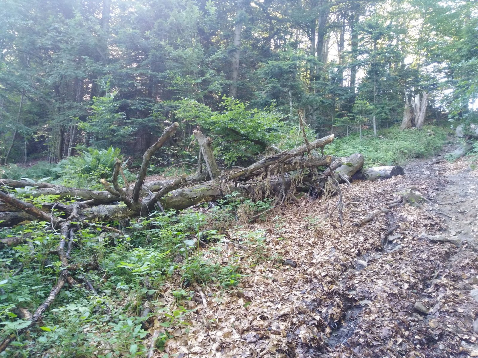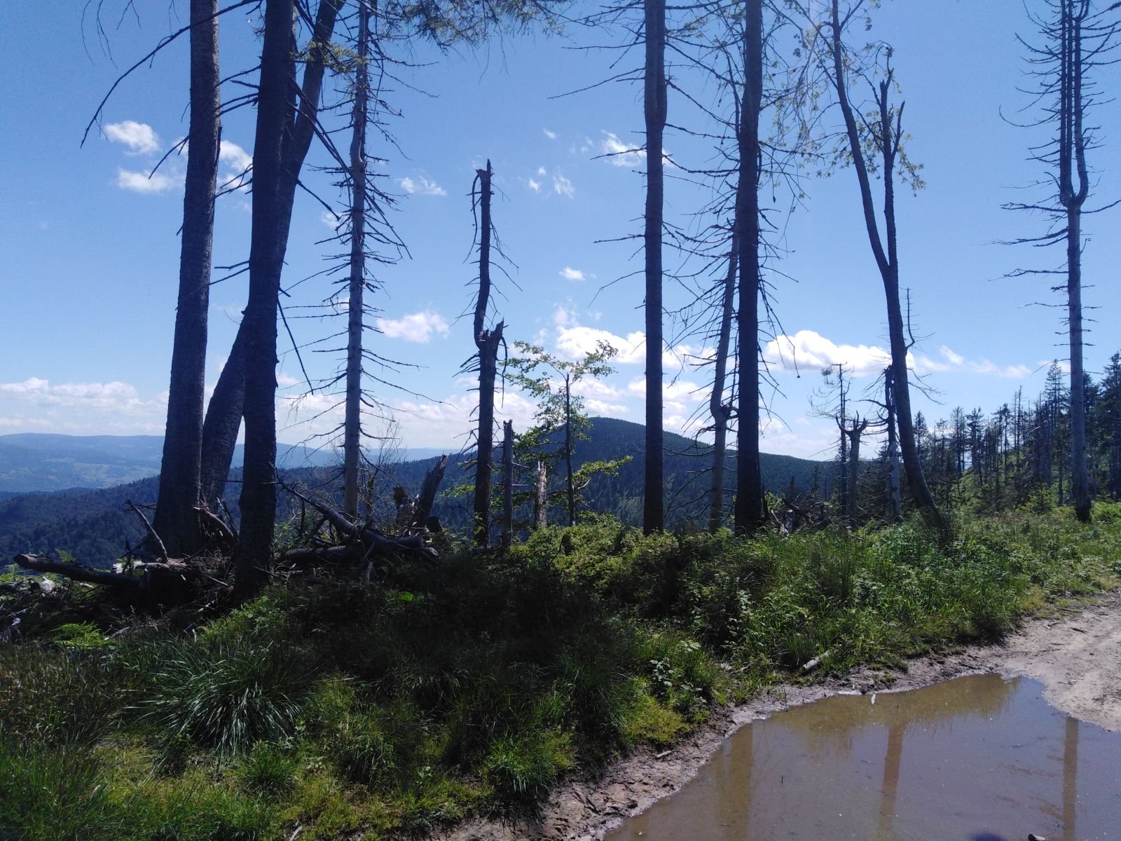 Zejście na skrzyżowanie na Jaworki czyli na Litawcową 967 m n.p.m. dość strome, na drodze sporo kamyków po ostatnich opadach (zdjęcie poniżej). Spotykamy też coraz więcej turystów co ciekawe prawie każdy ze Śląska wypoczywający w naszych rejonach.