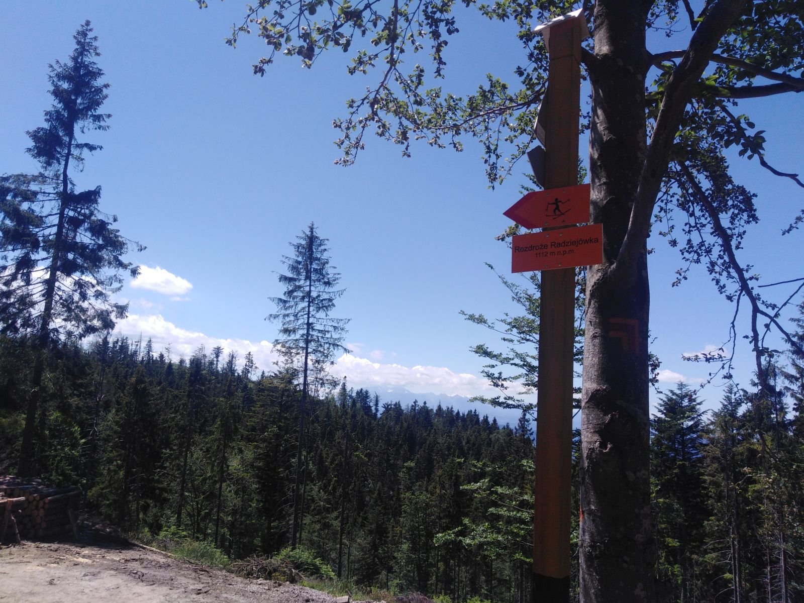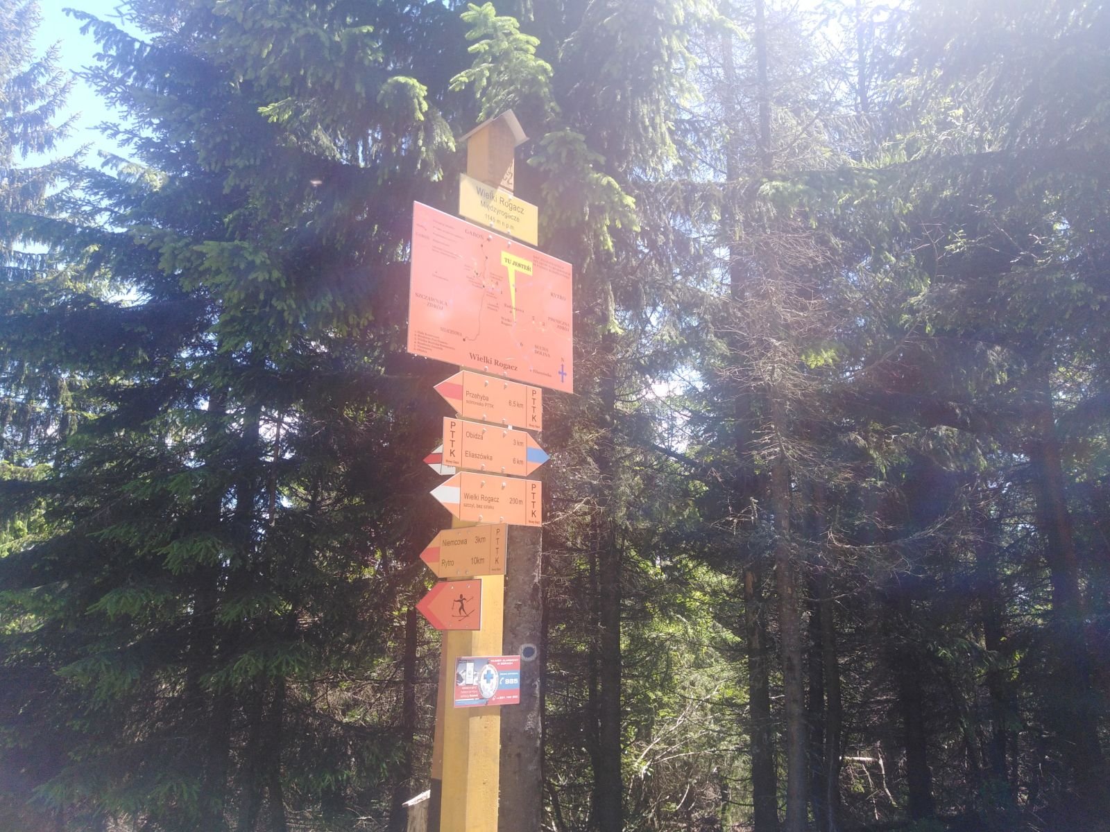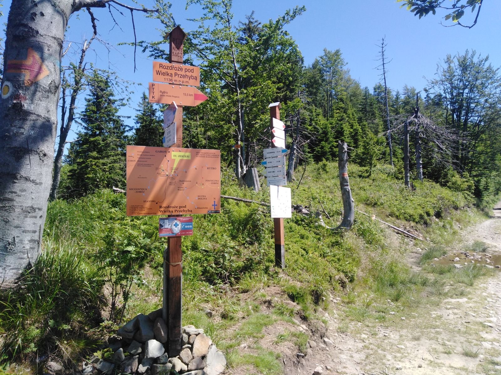 Na Wielkim Rogaczu wybieramy niebieski szlak - skrzyżowanie na Jaworki (zdjęcie powyżej). Była jeszcze jedna zmiana polegała na tym, że nie wychodziliśmy na Radziejową, lecz kierowaliśmy się wygodnym szerokim obejściem :) po takich deszczach ostre zejście z Radziejowej mogło zbyt dużo czasu i sił nam zająć. (Długa Przełęcz poniżej na zdjęciu)