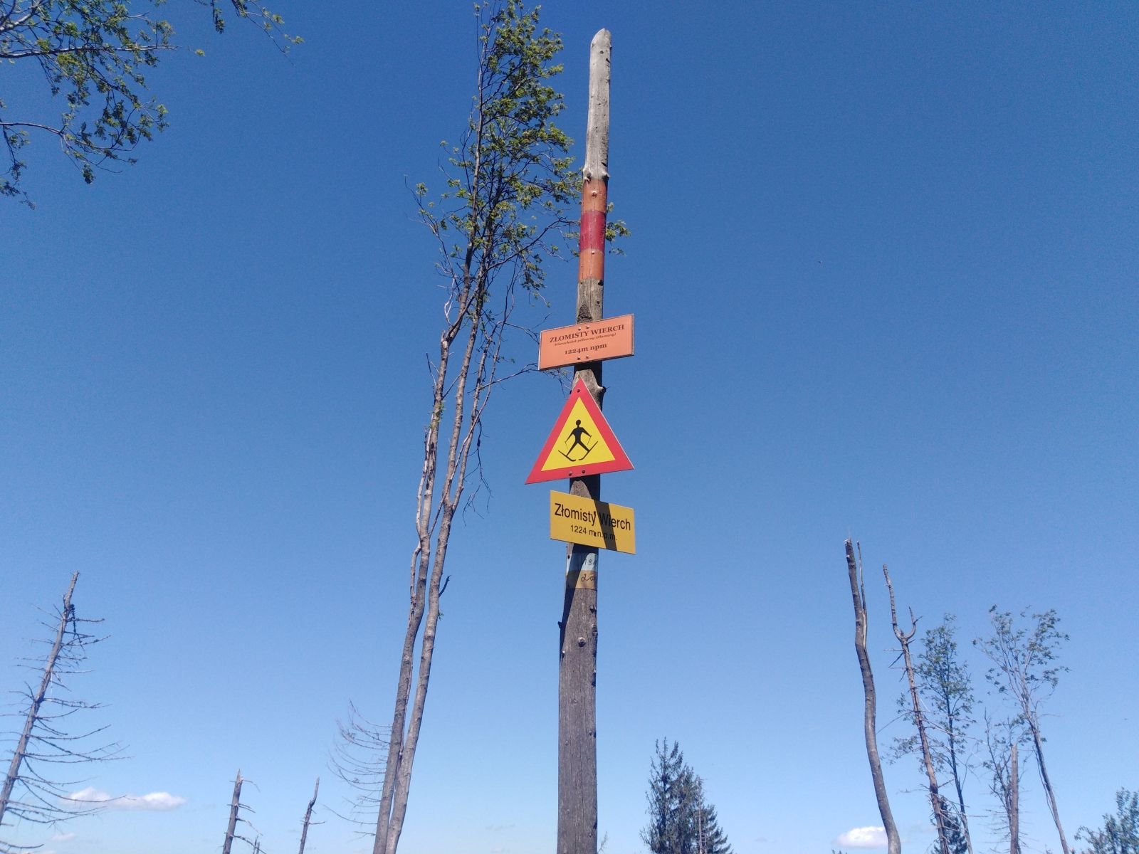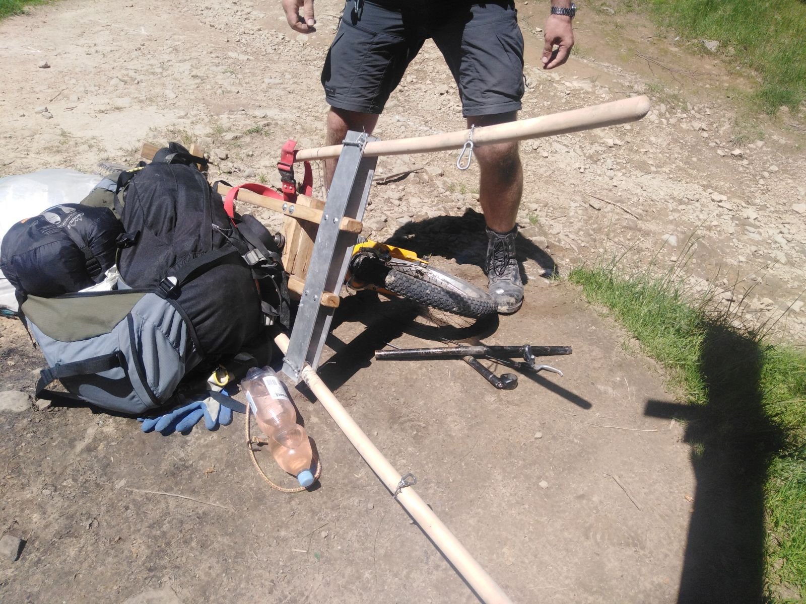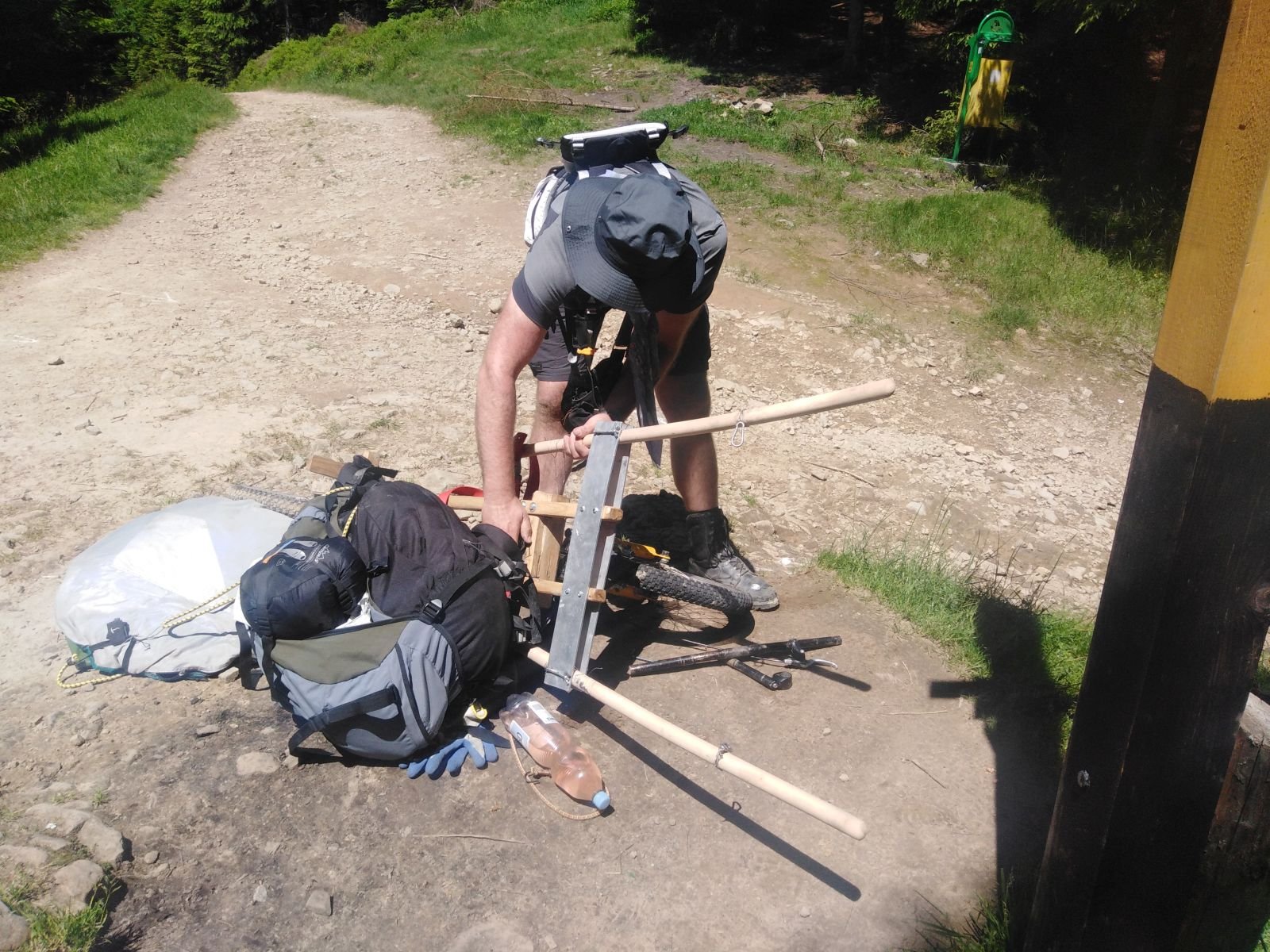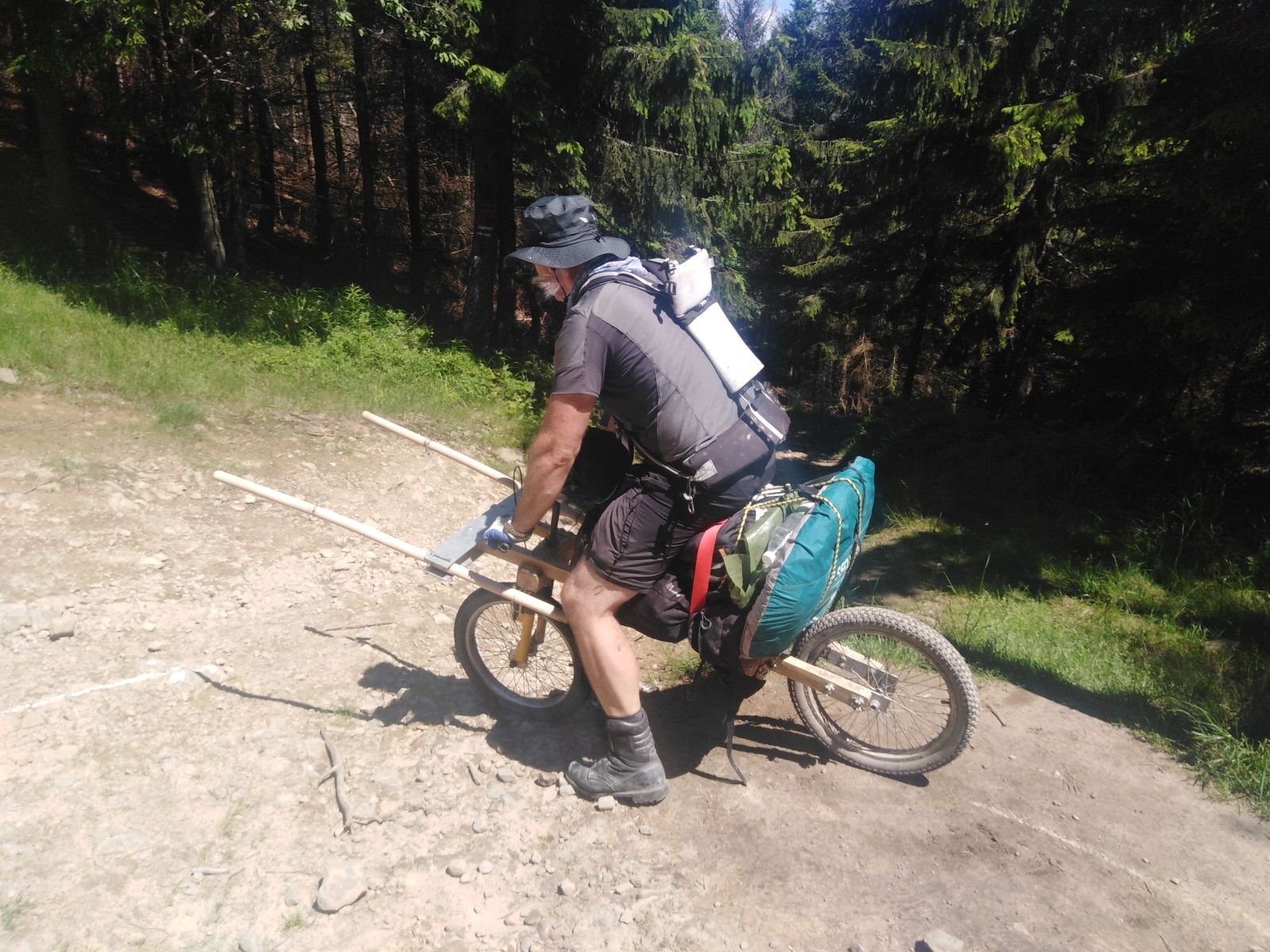 Na tym wspomnianym Wielkim Rogaczu spotkaliśmy turystę, który od ponad tygodnia podąża Głównym Szlakiem Beskidzkim (kliknij) i ciągnął na pierwszy rzut oka jakiś wózek.