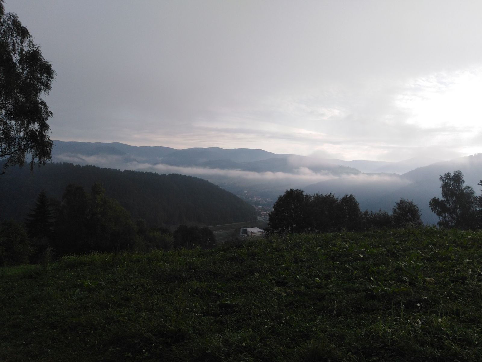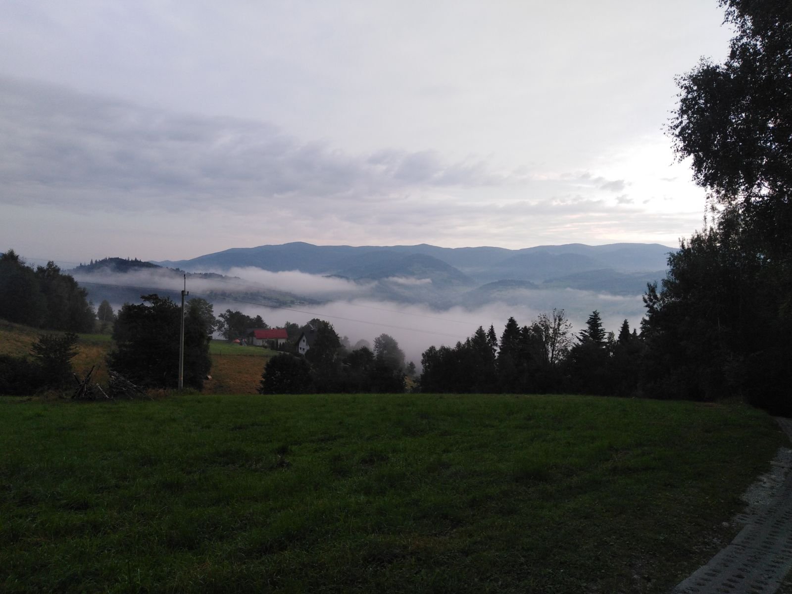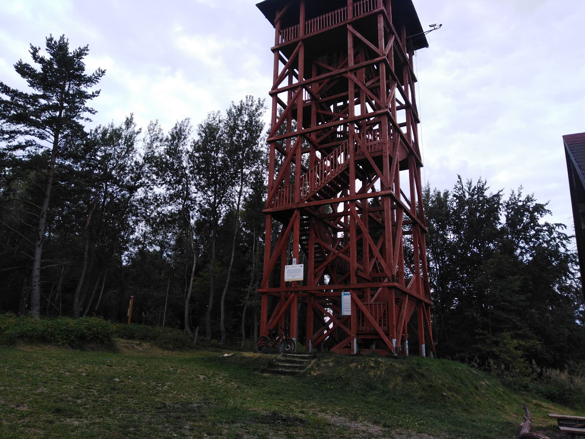 Przed nami pierwsza wieża widokowa na Buczniku na wysokości 669 metrów. Niestety wieża znajduje się w obrębie prywatnej posiadłości. Z tej wysokości Piwniczna była przykryta poranną chmurką.