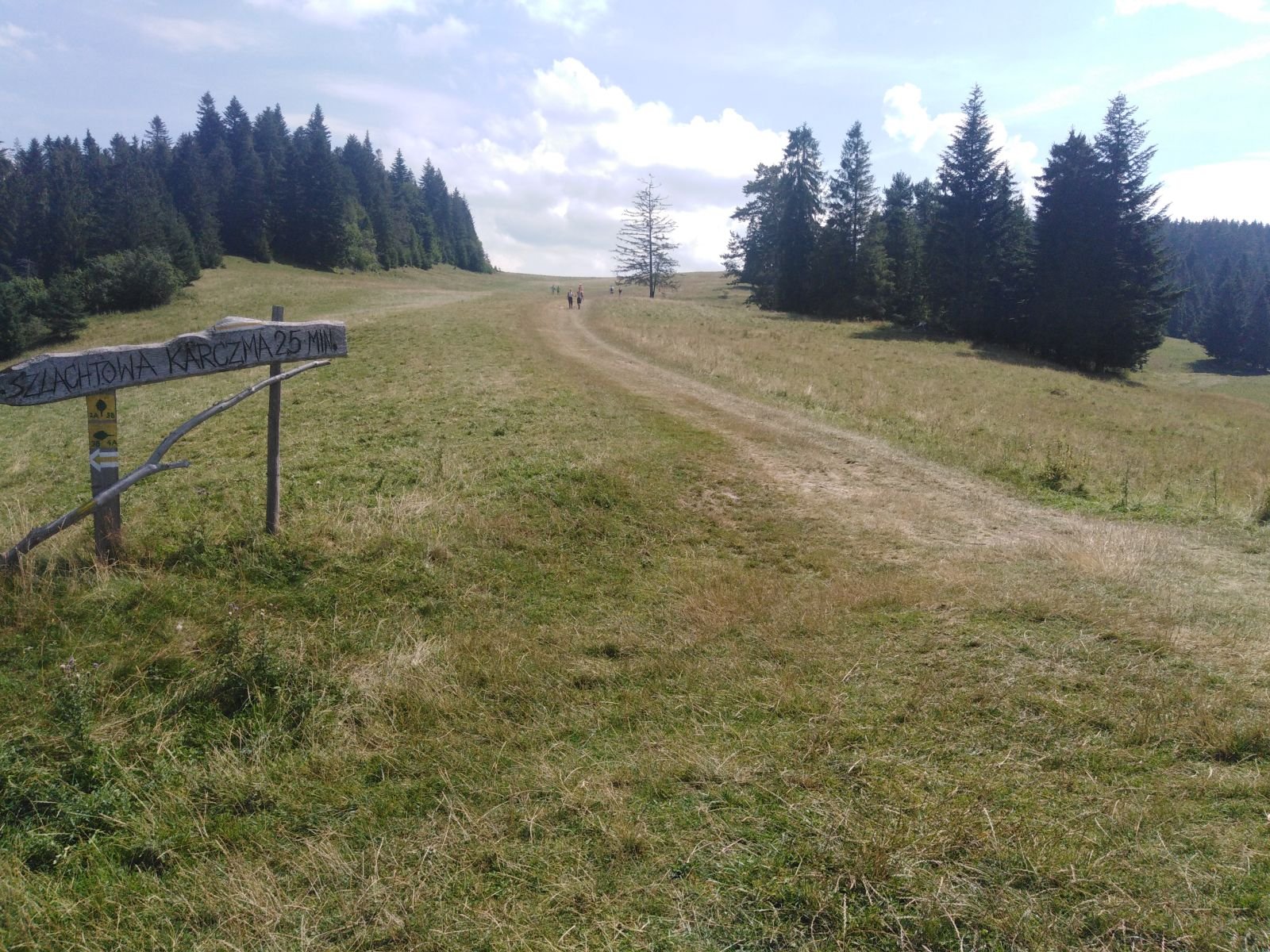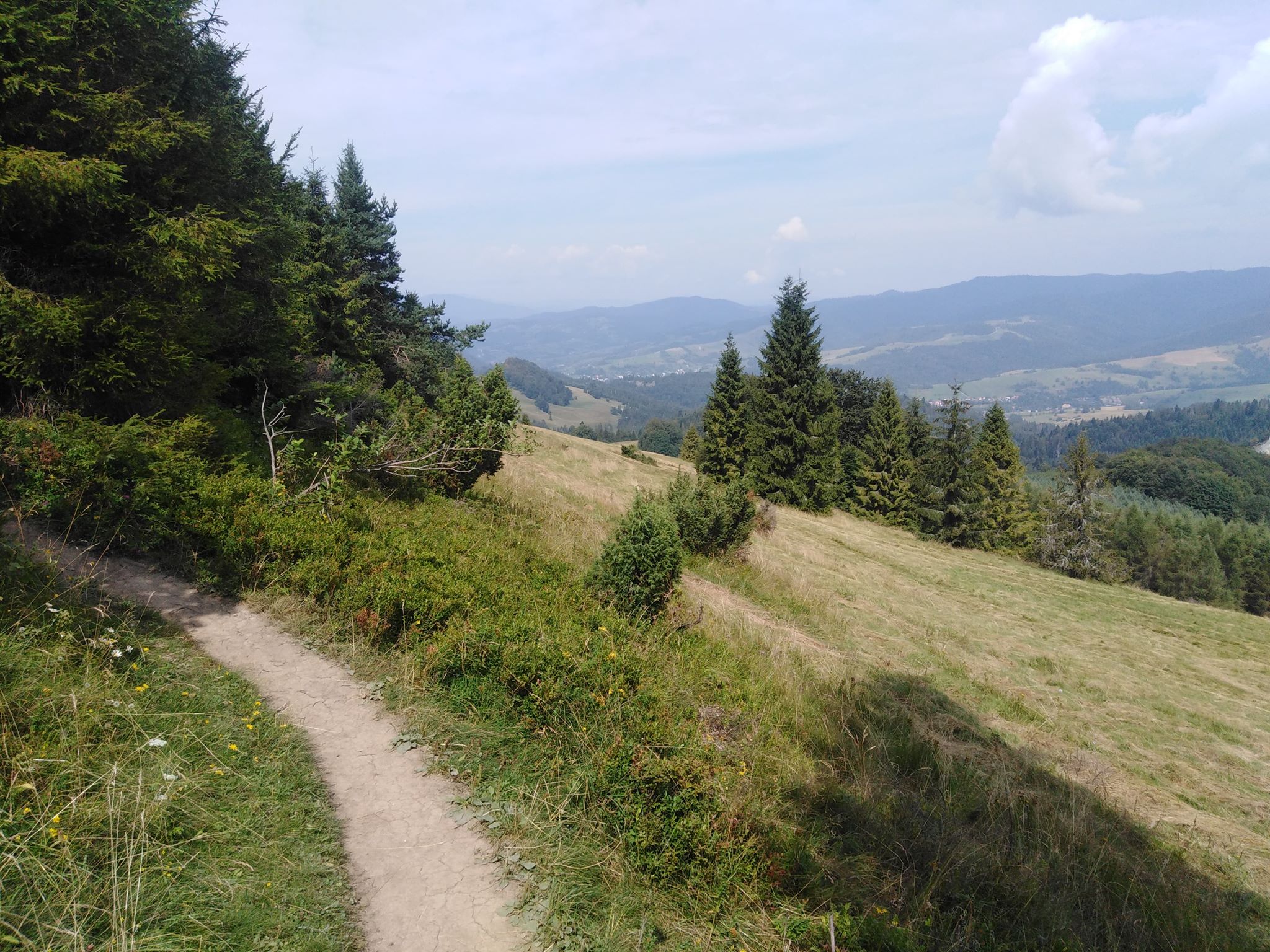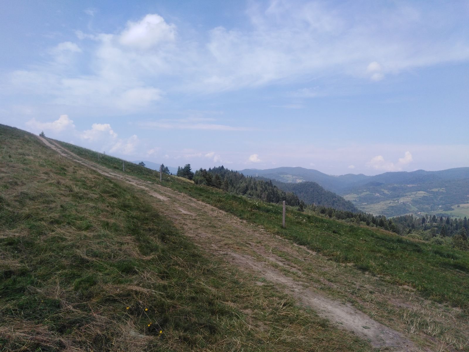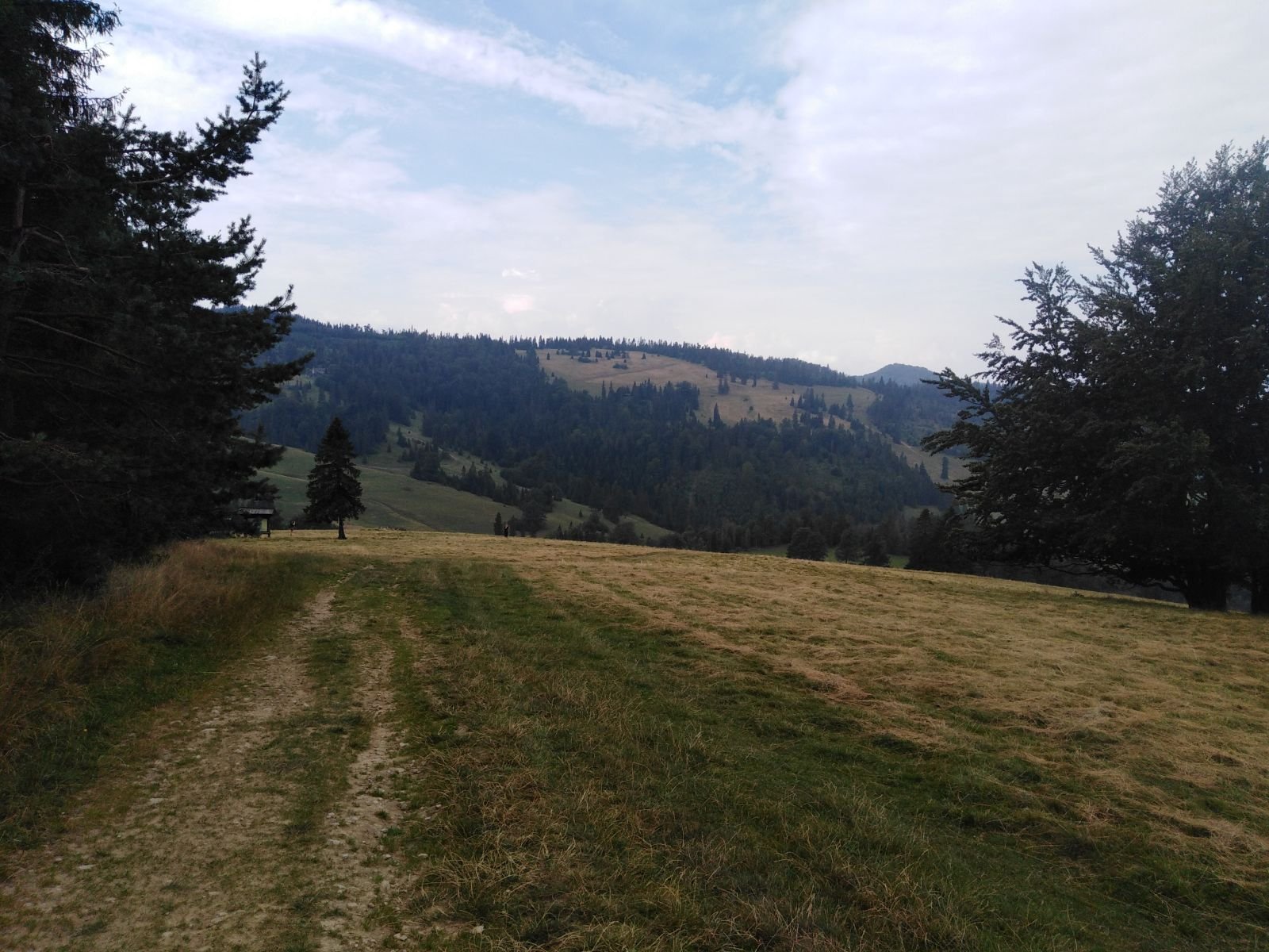 Dojście na Wysoką to duże halę, przyjemna ścieżka z widokiem na Pieniny. Na szlaku pojawia się coraz więcej turystów, nie brakuje tych poruszających się rowerem.