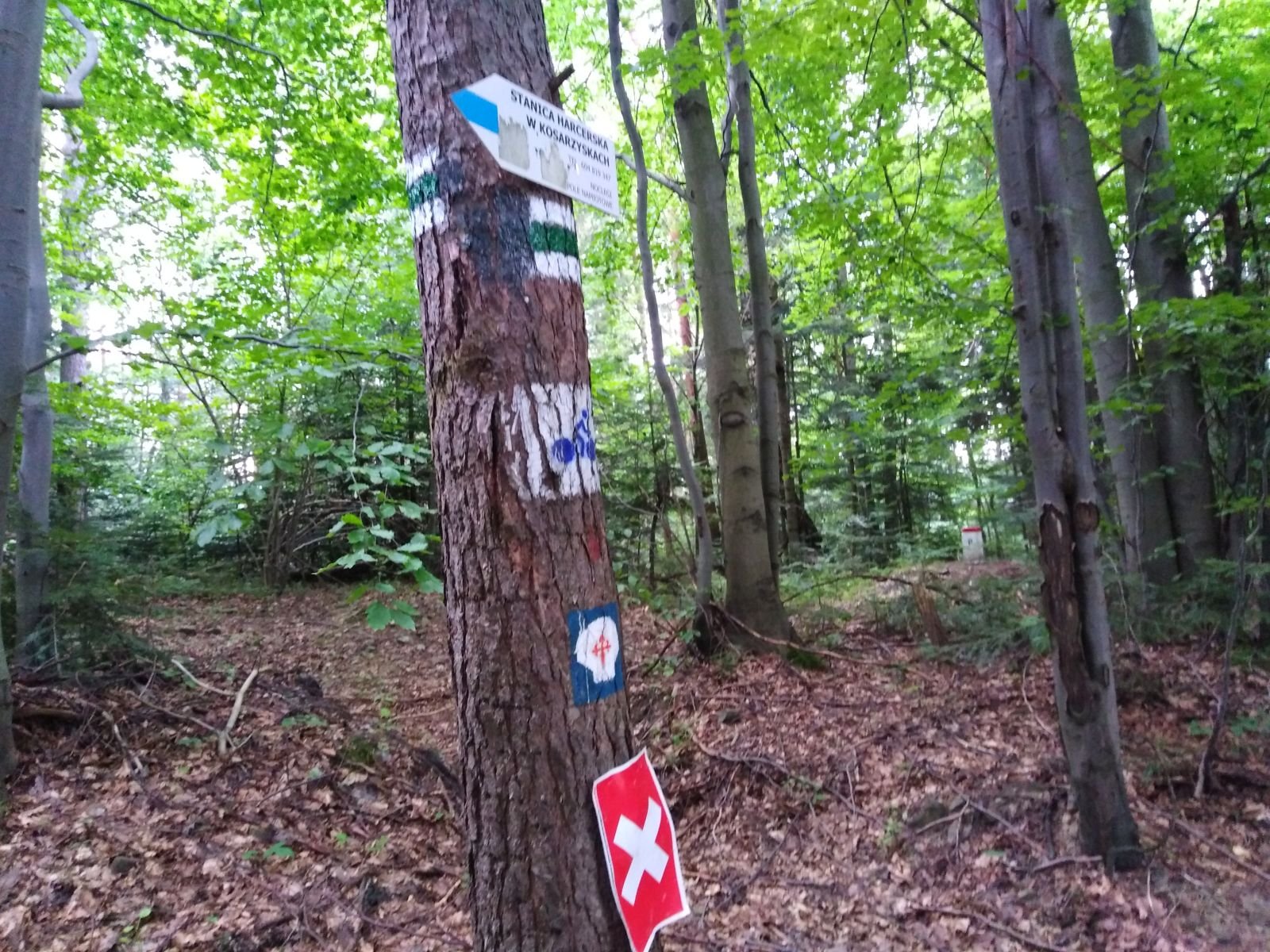 Początek wyprawy tak jak wspomnieliśmy to Obidza ścieżka rowerowa Vello Dunajec do Starego Sącza, rowerem - szybciutko na rozgrzewkę. W Starym Sączu zatrzymaliśmy się na uroczym rynku, było troszkę czasu pociąg do Piwnicznej Zdrój miał planowo odjechać o 6:38. Tak też było i o 7:01 byliśmy już na Stacji docelowej (rowerek został w Starym Sączu, mieliśmy gdzie go zostawić) Zielony szlak ma swój początek tuż przy dworcu, gdzie jak widać na poniższym zdjęciu startujemy tu także czerwonym i niebieskim szlakiem. Tym razem zanotowaliśmy postęp, bo pomyliliśmy trasę tylko jeden raz:) tuż na początku na przed Piwowarówką. Tempo marszu można powiedzieć było zabójcze, wszystko przez ograniczony czas i popołudniowe obowiązki:)