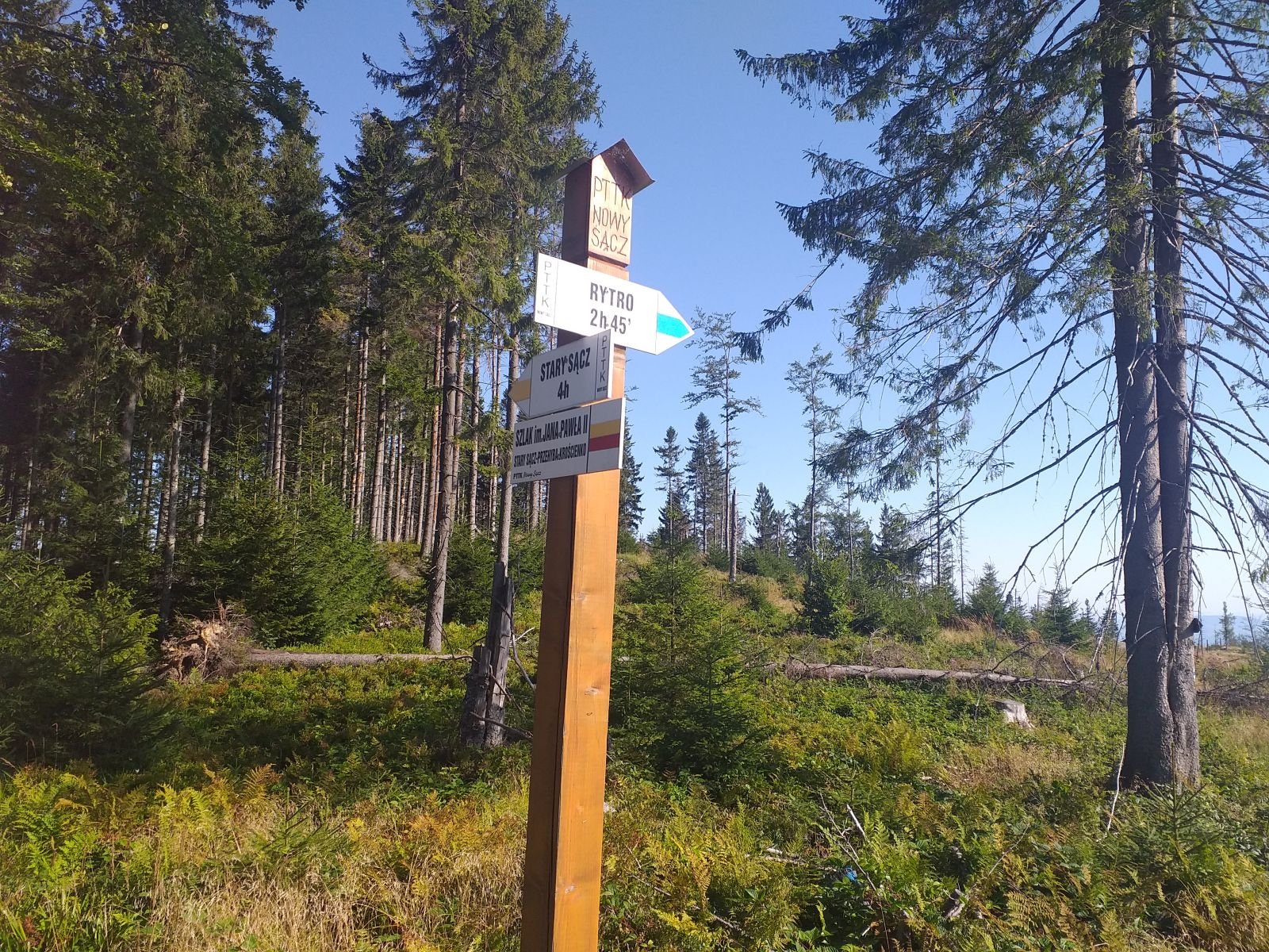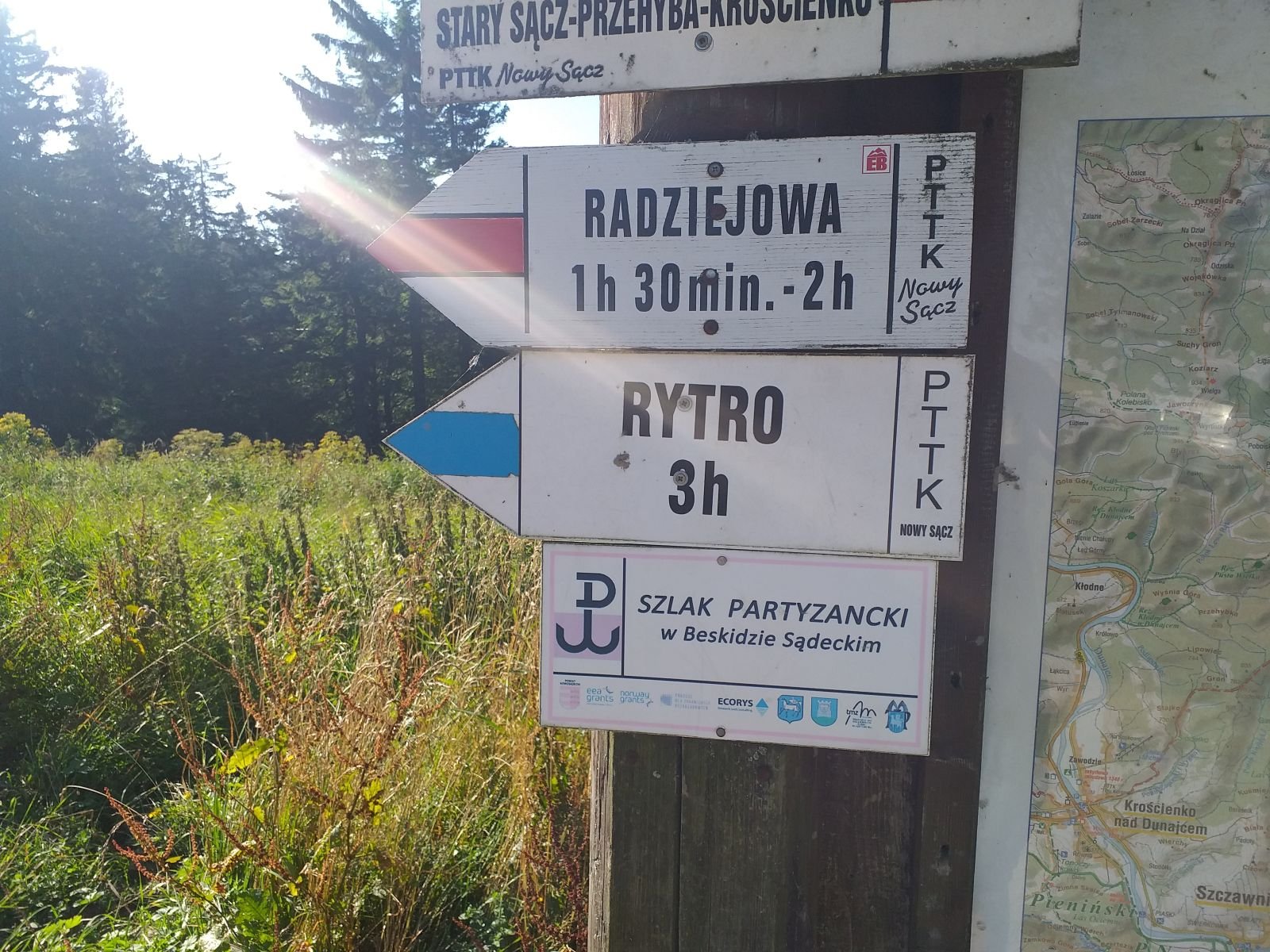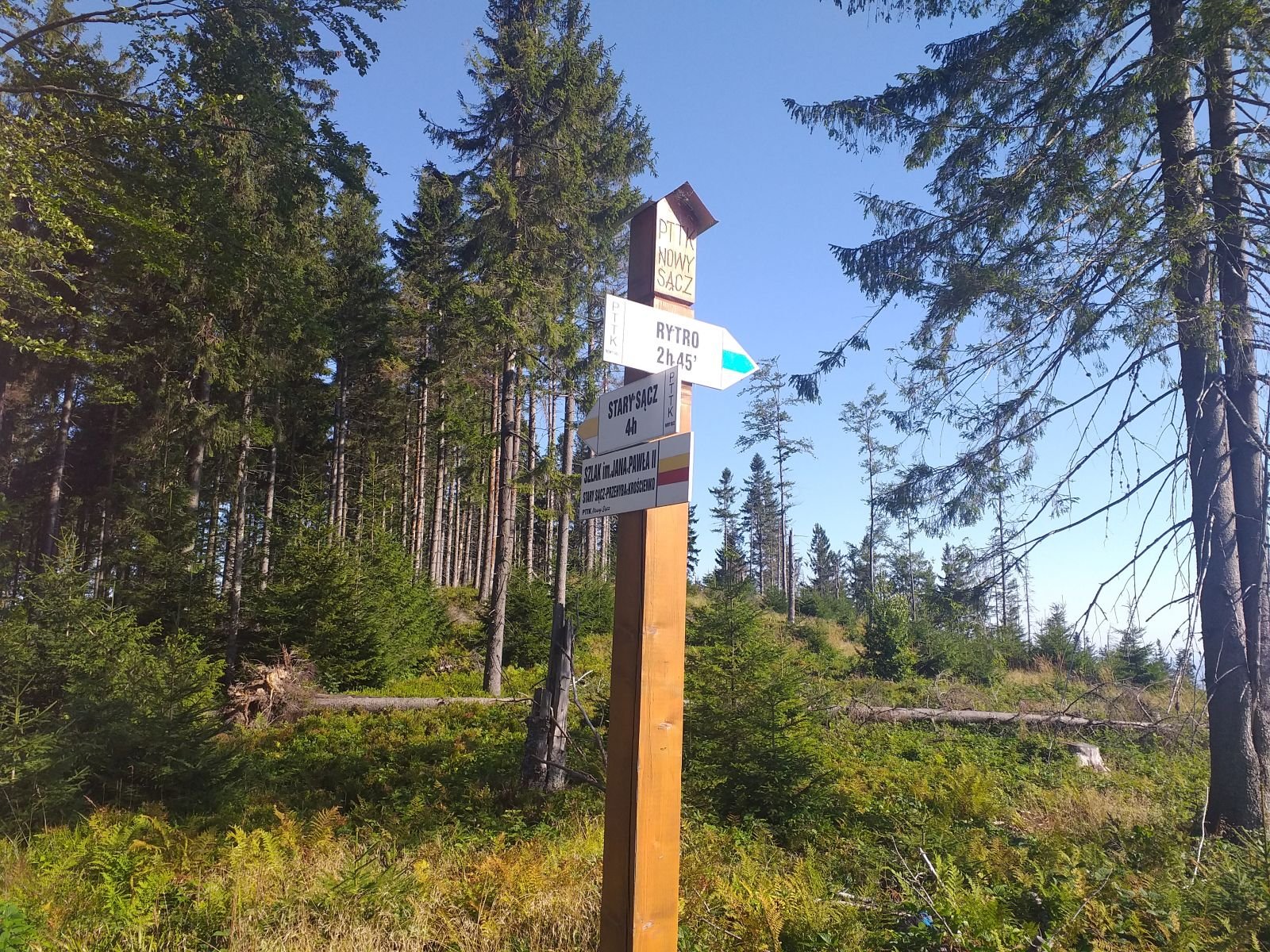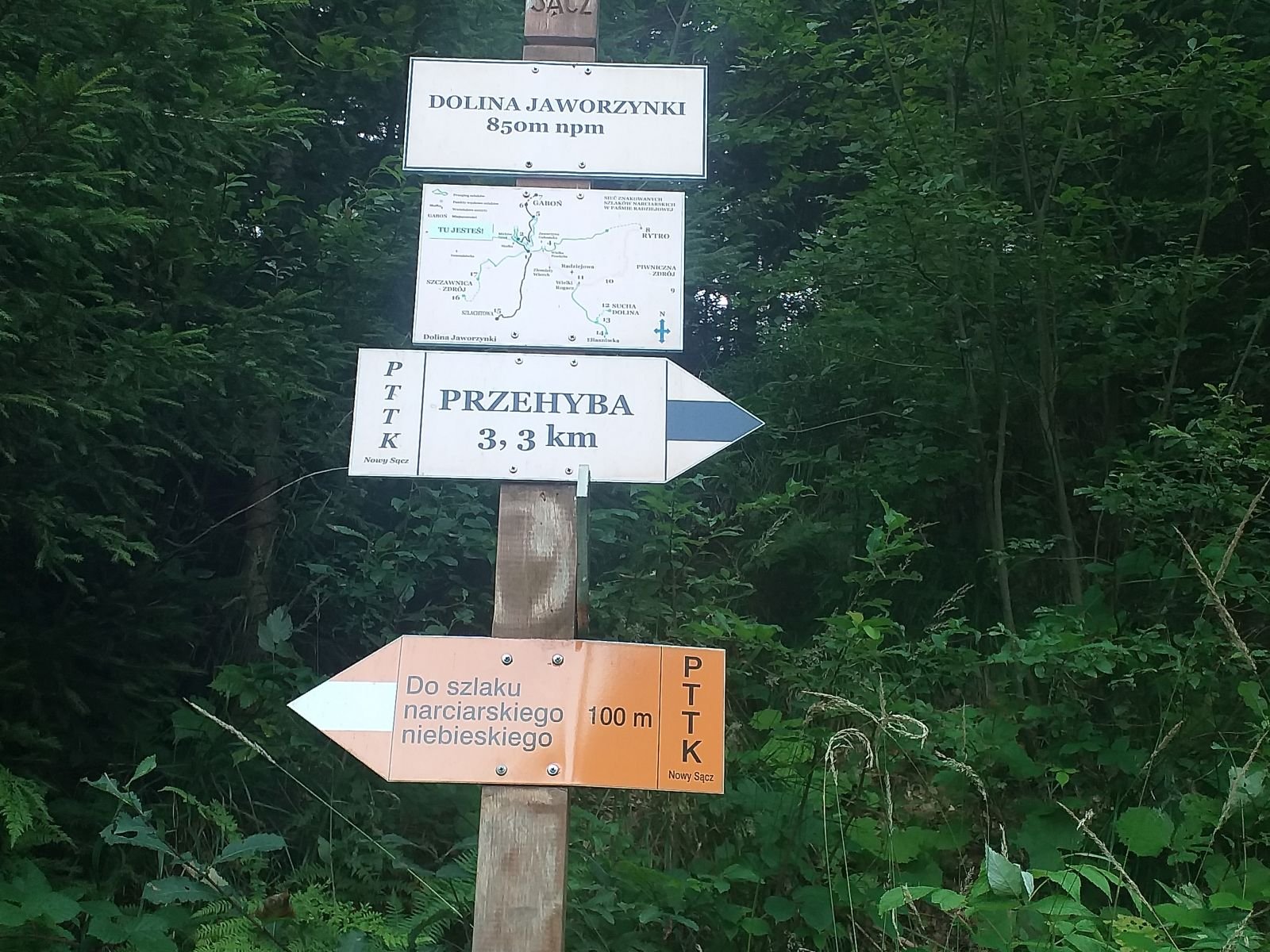 Dobrze oznaczony skręt na Rytro, na wprost dojdziemy zielonym szlakiem do Barcic.