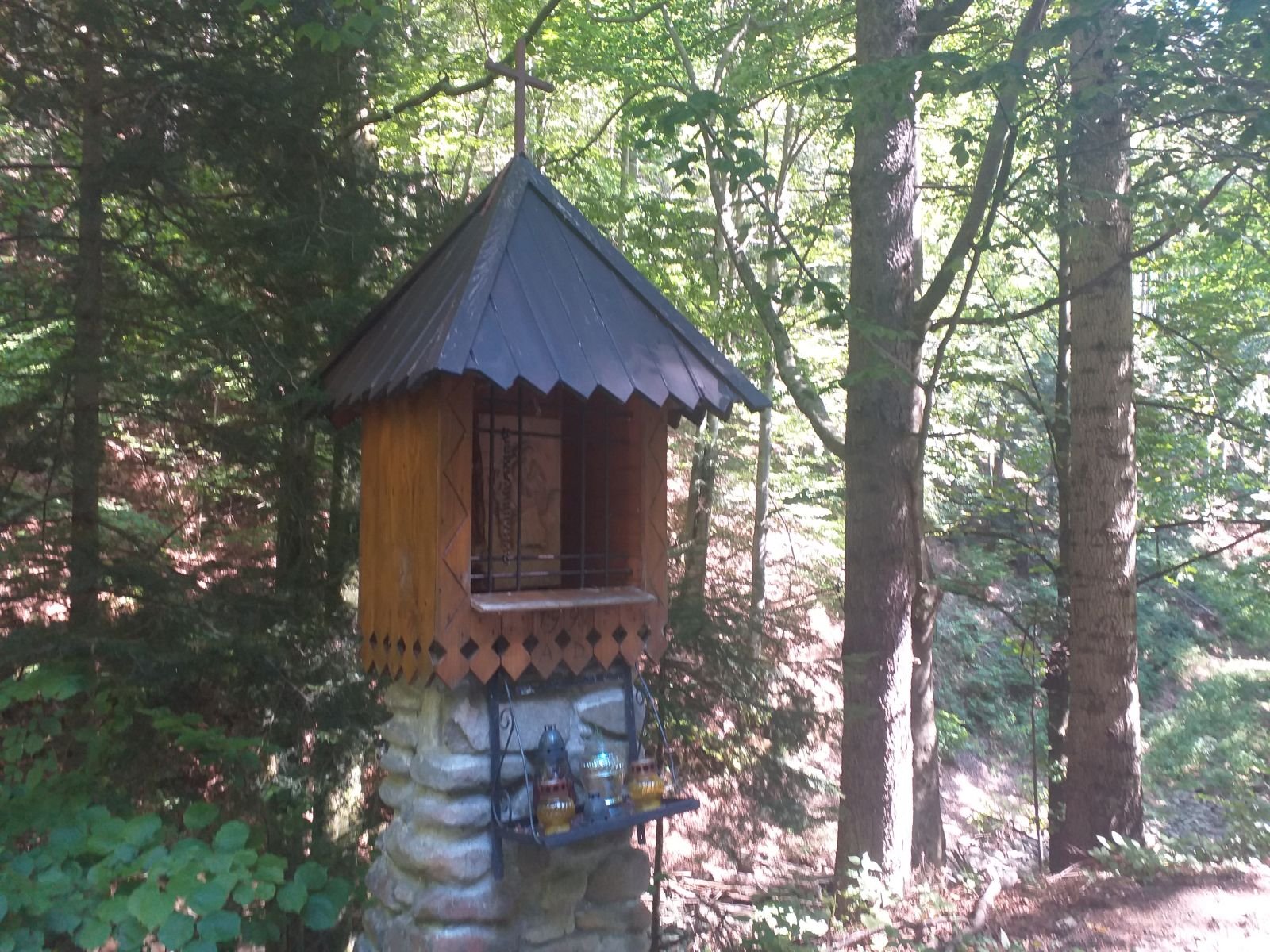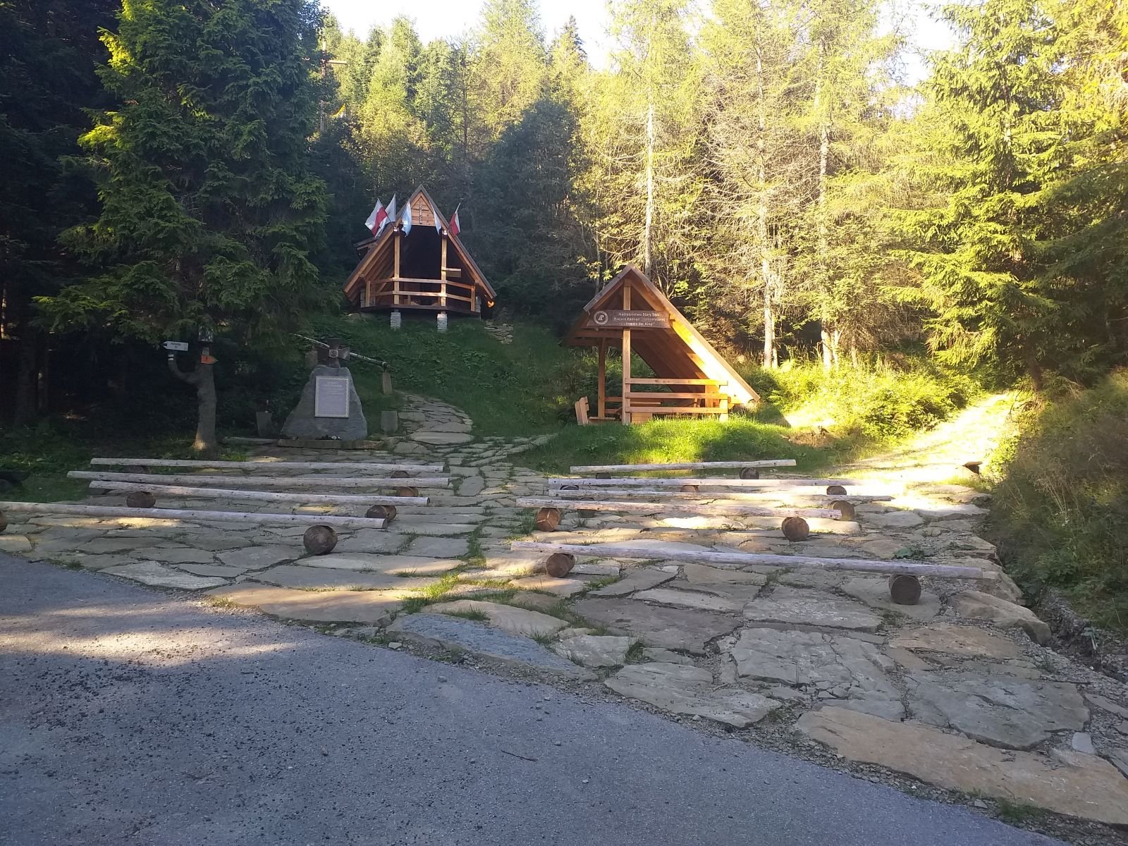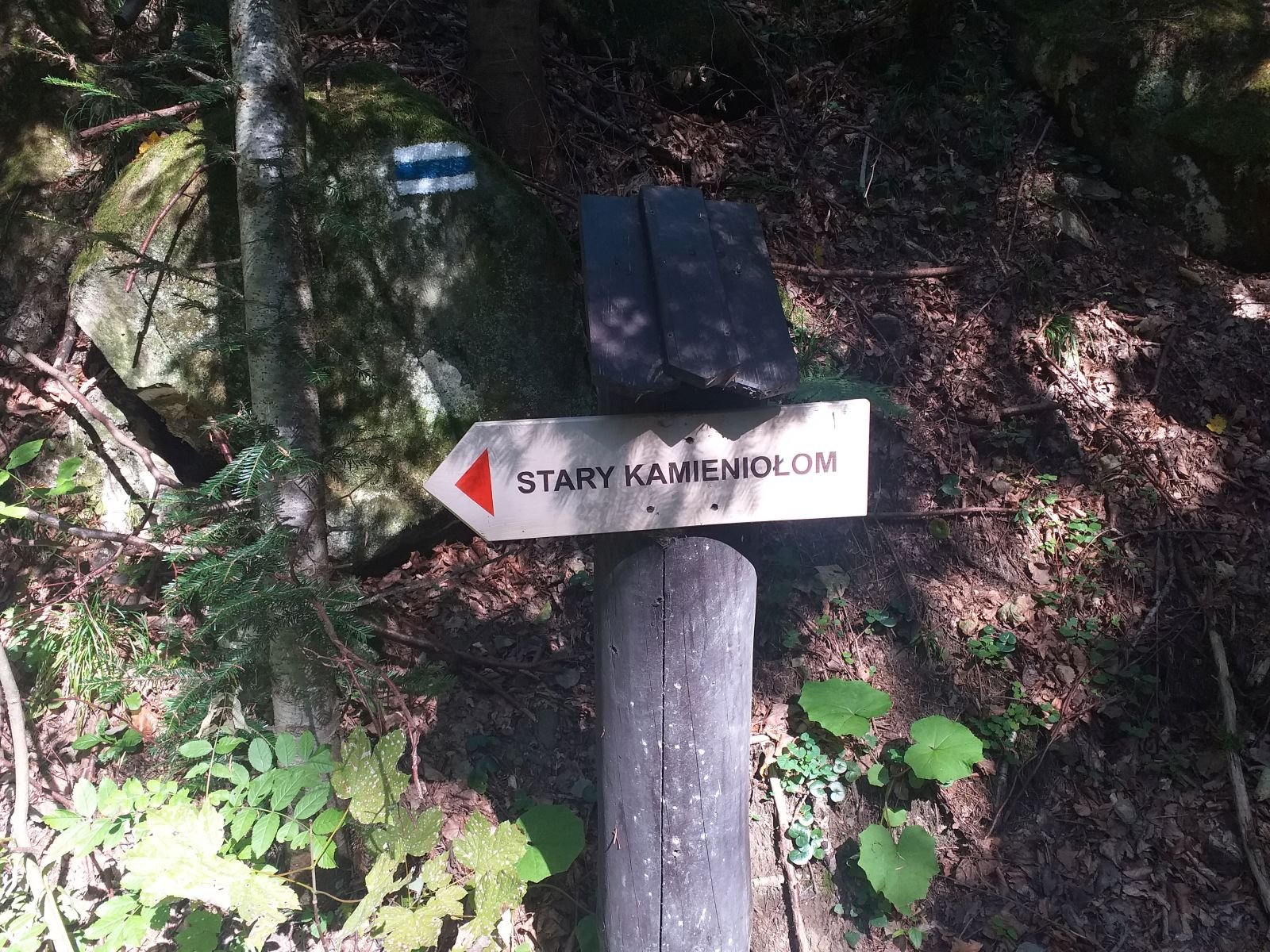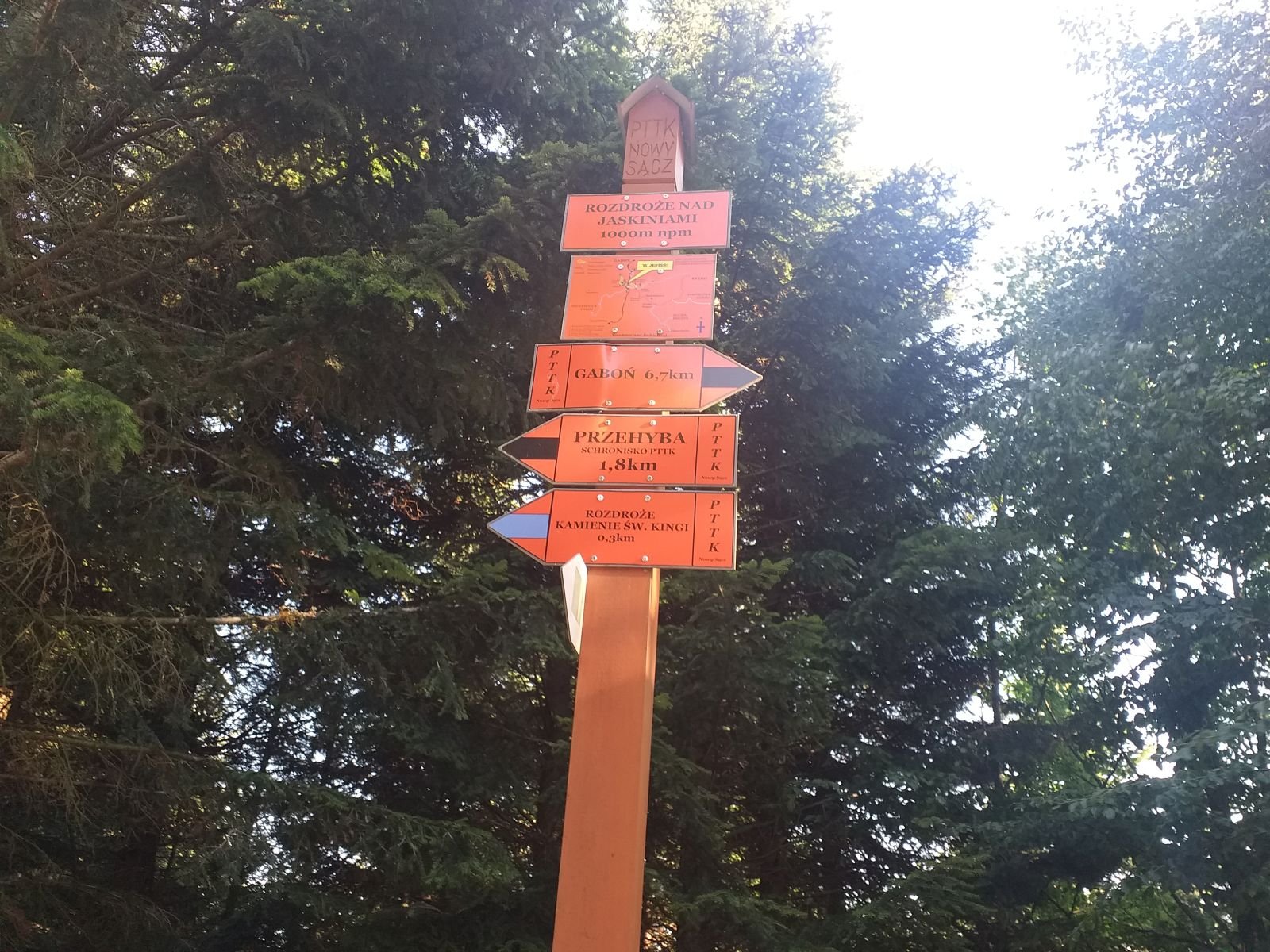 Skręcamy ostro w prawo i można powiedzieć, że oddalamy się od celu podchodząc "na około" aż do momentu gdzie skręcimy w lewo przy drodze dobrze nam znanej z podejścia zielonym szlakiem. Mijamy ołtarz polowy i kamień Św.Kingi