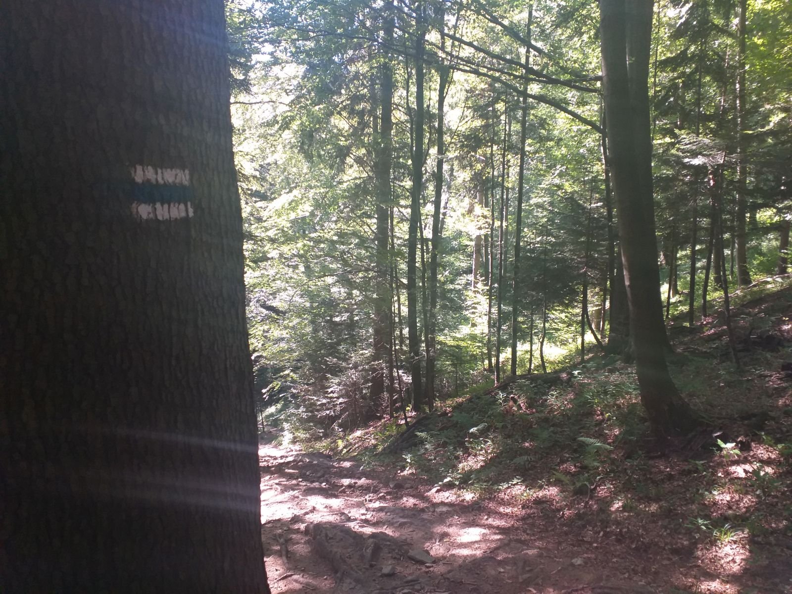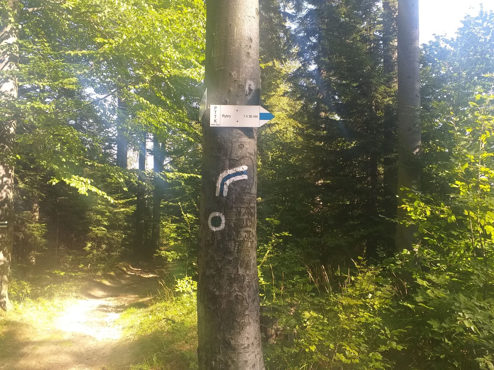 Do Rytra prowadzę dwa szlaki czerwony i niebieski. Wybieramy krótszy niebieski szlak, czyli mamy blisko 14 kilometrów, czerwony ma 16 kilometrów . Zejście na Rytro w pewnych momentach przypomina zielony Szlak Obidza - Łazy - Przehyba. Początek trasy jest dość widokowy, w pewnym momencie schodzimy w las i tak praktycznie tak do samego Rytra. Po drodze mijamy pomnik przyrody "Wietrzne Dziury" Ścisłą ochroną w tym miejscu objęty jest 100-letni las bukowy, porastający malownicze skalne urwiska. W dalszej części trasy natykamy się na wiatę turystyczną, można tu się zatrzymać i poobserwować widoczki.