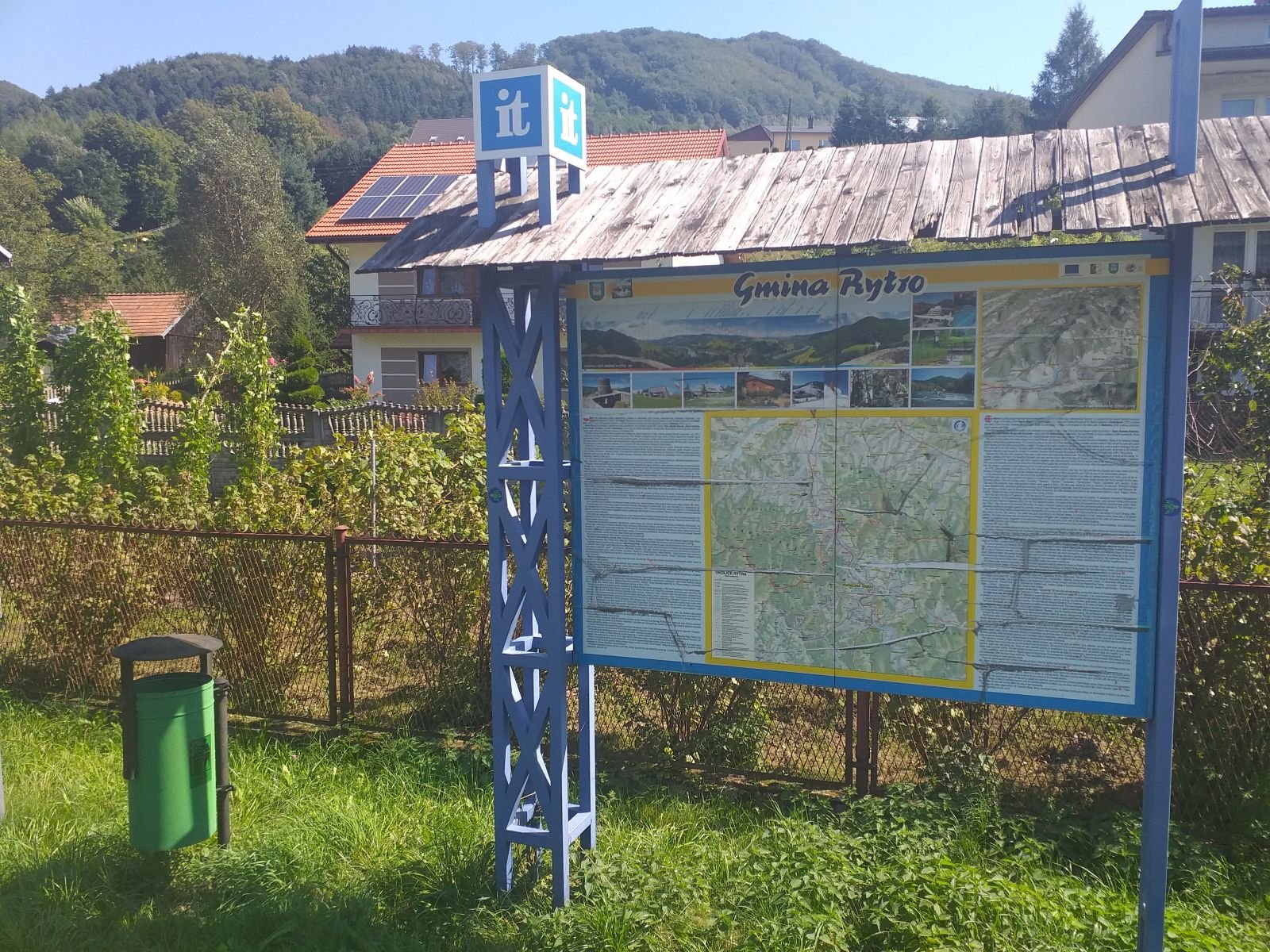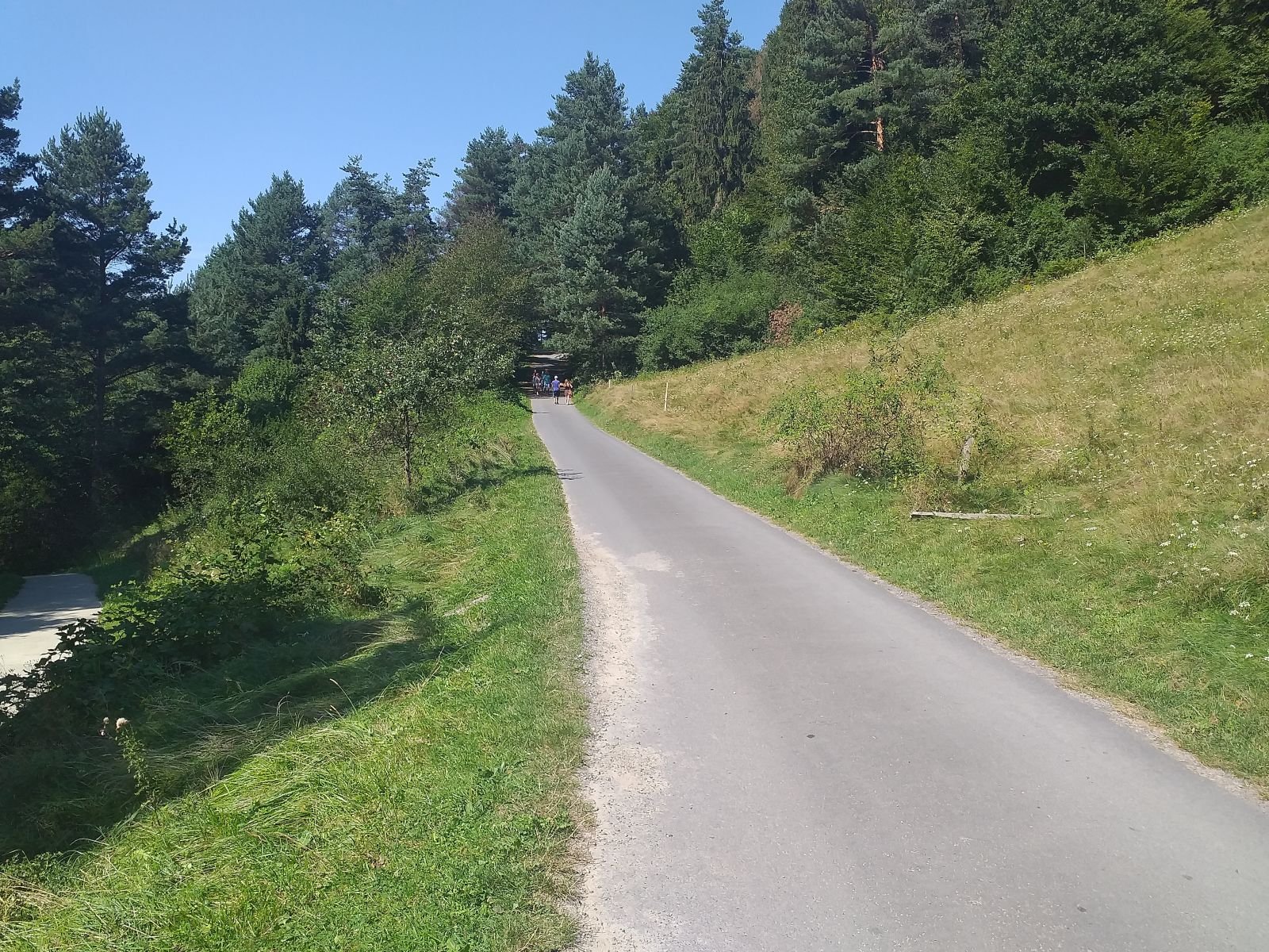 Zejście ze szlaku to przejście przez potok który niżej zwany będzie jako Roztoka Wielka. Następnie przed nami już "ubita" droga i parking, który o tej godzinie jest pełniutki. Przechodzimy obok leśniczówki i zaczyna się droga asfaltowa. Bezpośrednio za hotelem Perła Południa, zaczynają się tereny stacji narciarskiej Ryterski Raj. Po drodze mijamy m.in. kapliczkę w Wielkiej Roztoce, mijamy pomnik poświęcony pamięci partyzantów Ziemi Sądeckiej . W Rytrze obieramy czerwony szlak nie na długo, przechodzimy przez most nad Popradem, i już schodzimy z czerwonego szlaku, który kieruję się na prawo do Schroniska Cyrla, kilka kroków dalej za szlakiem także skręcamy w prawo i kierujemy się na zamek. Jest niedziela , piękna pogoda, ostatni dzień wakacji - zwiedzających osób naprawdę sporo.
