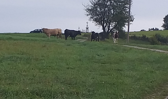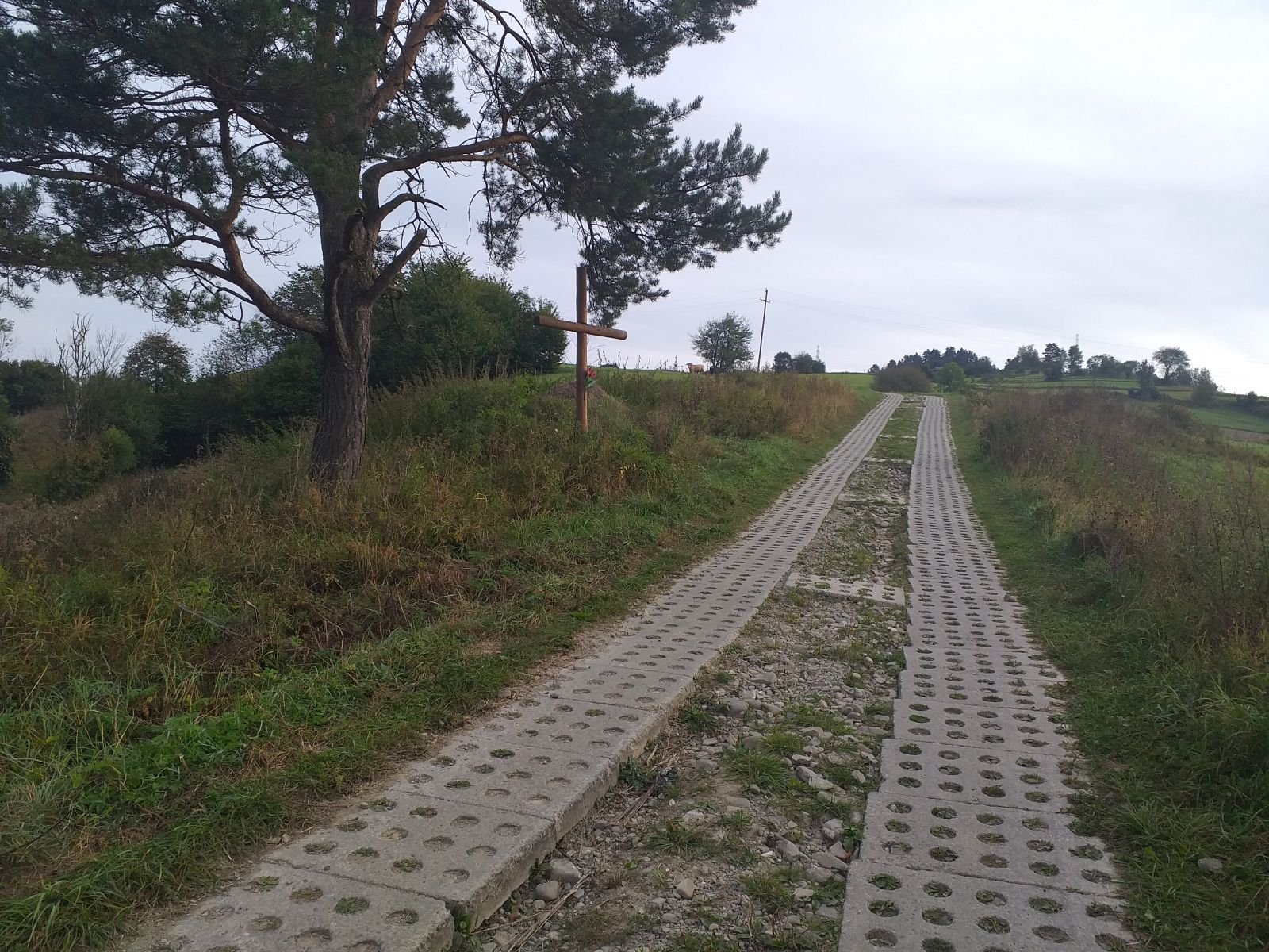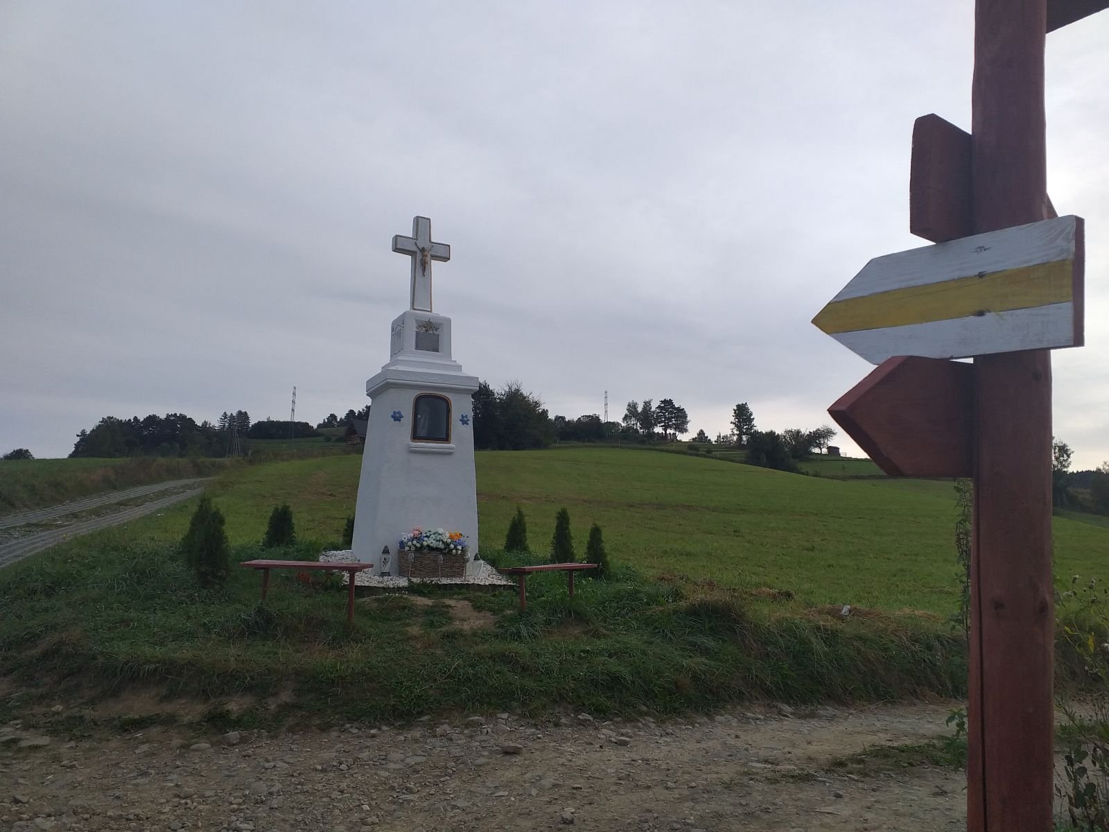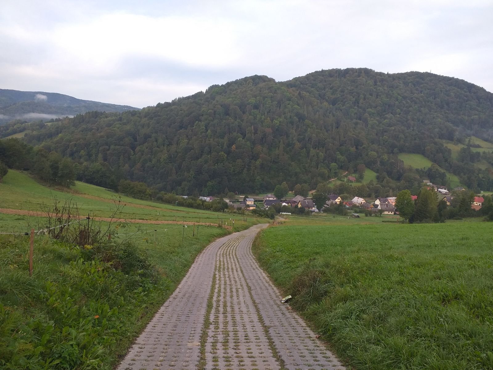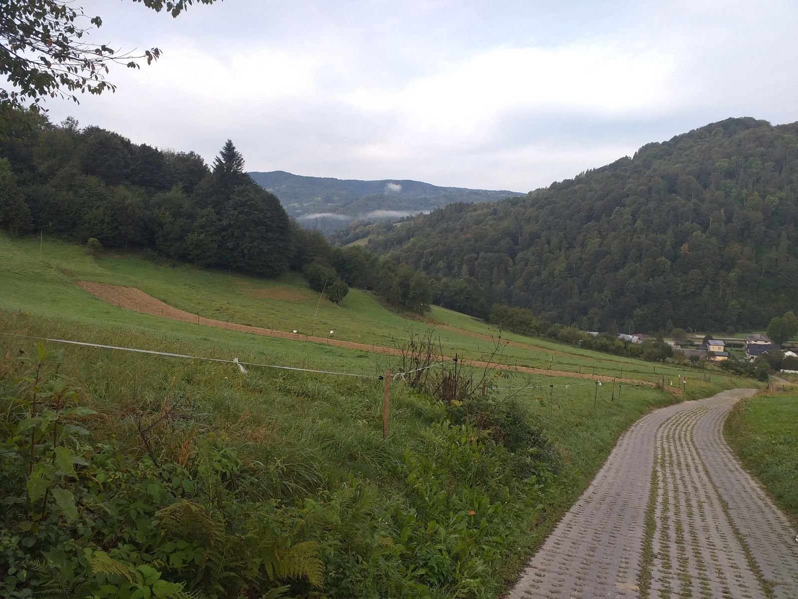 Droga szybko zaczyna piąć się w górę po betonowych płytach. Mozolnie krok za krokiem idziemy ostro w górę... Po około 25 minutach od zejścia z szosy w Łomnicy docieramy na grzbiet z rozległym pastwiskiem i pięknym widokiem na Łomnice. Mijamy kapliczkę, tutaj na prawo pojawia się szlak na Wierchomlę, w lewo dojście na niebieskie szlak, który także biegnie na Hale Łabowską. Po kilku chwilach schodzimy z betonowych płyt po których nie najlepiej nam się szło.