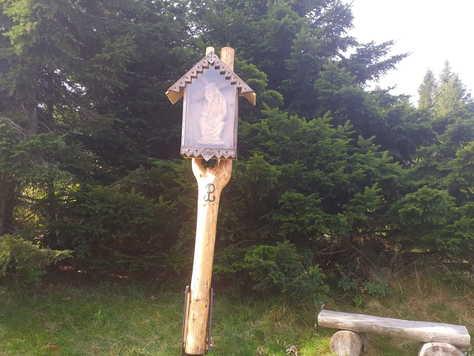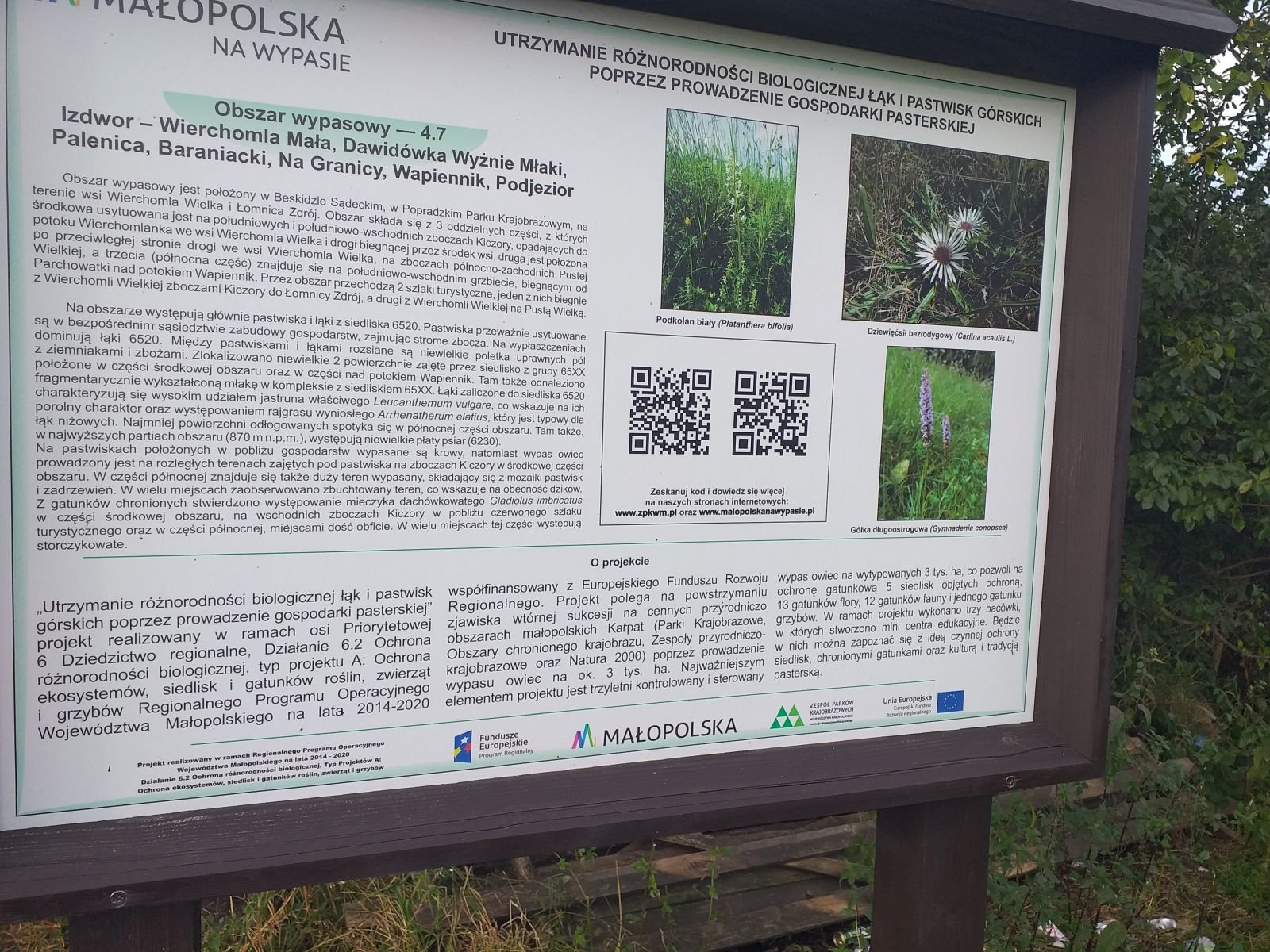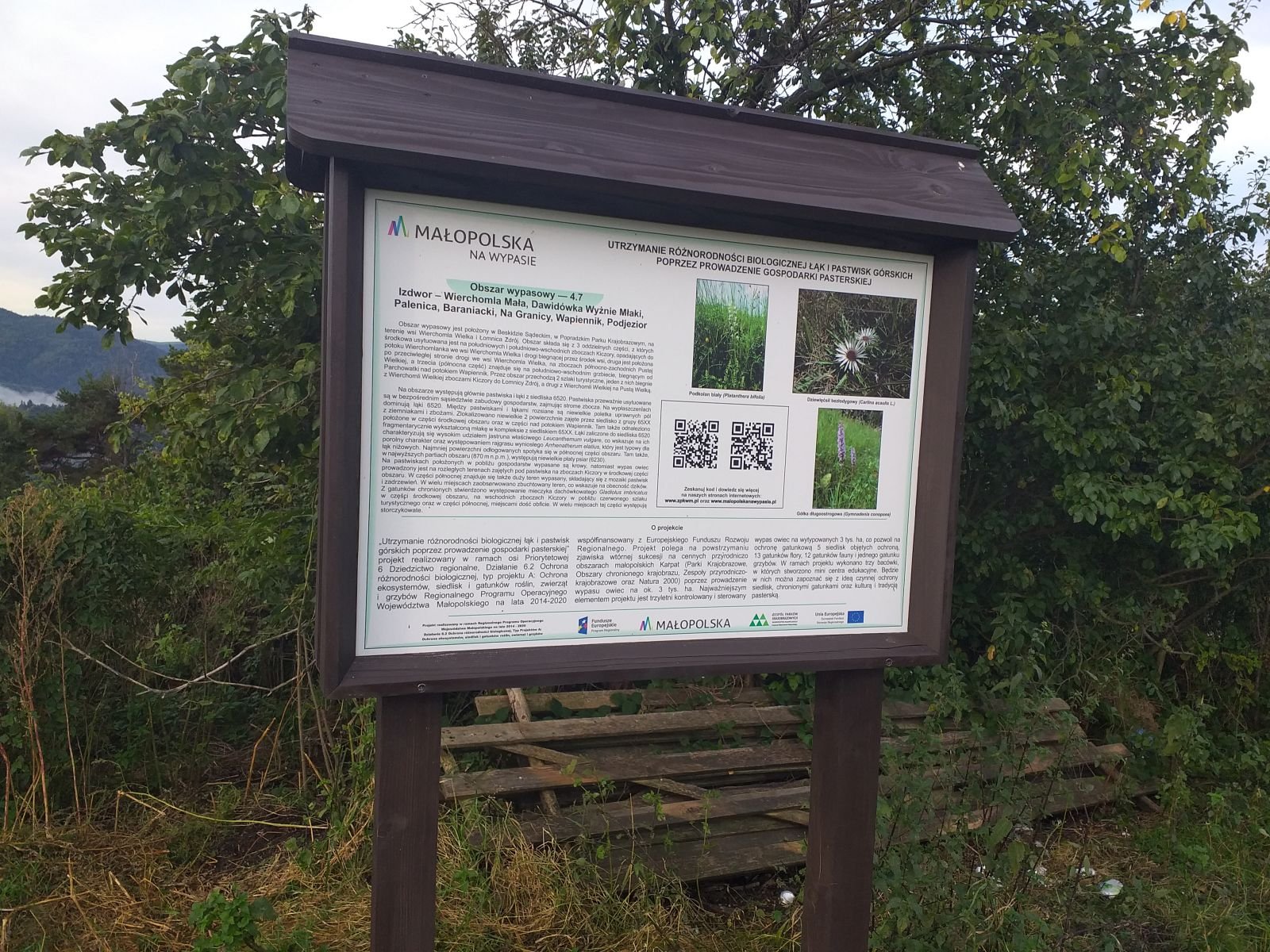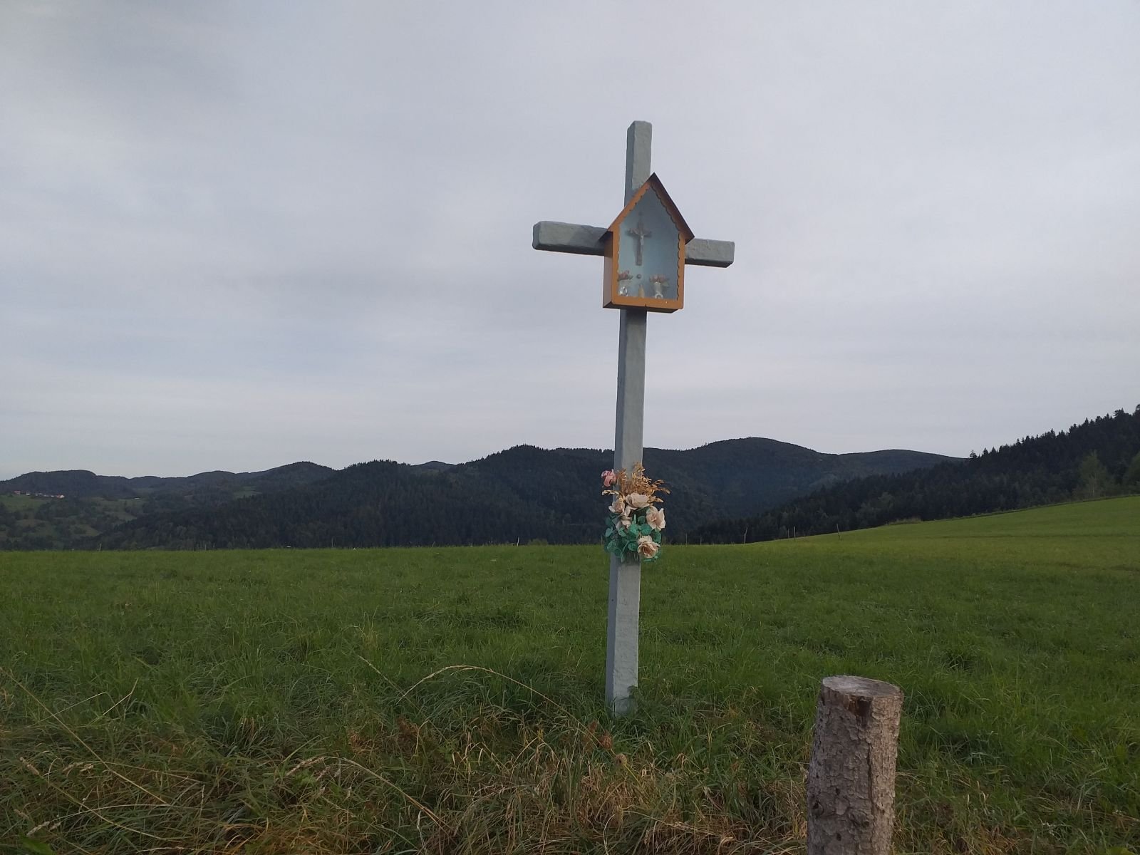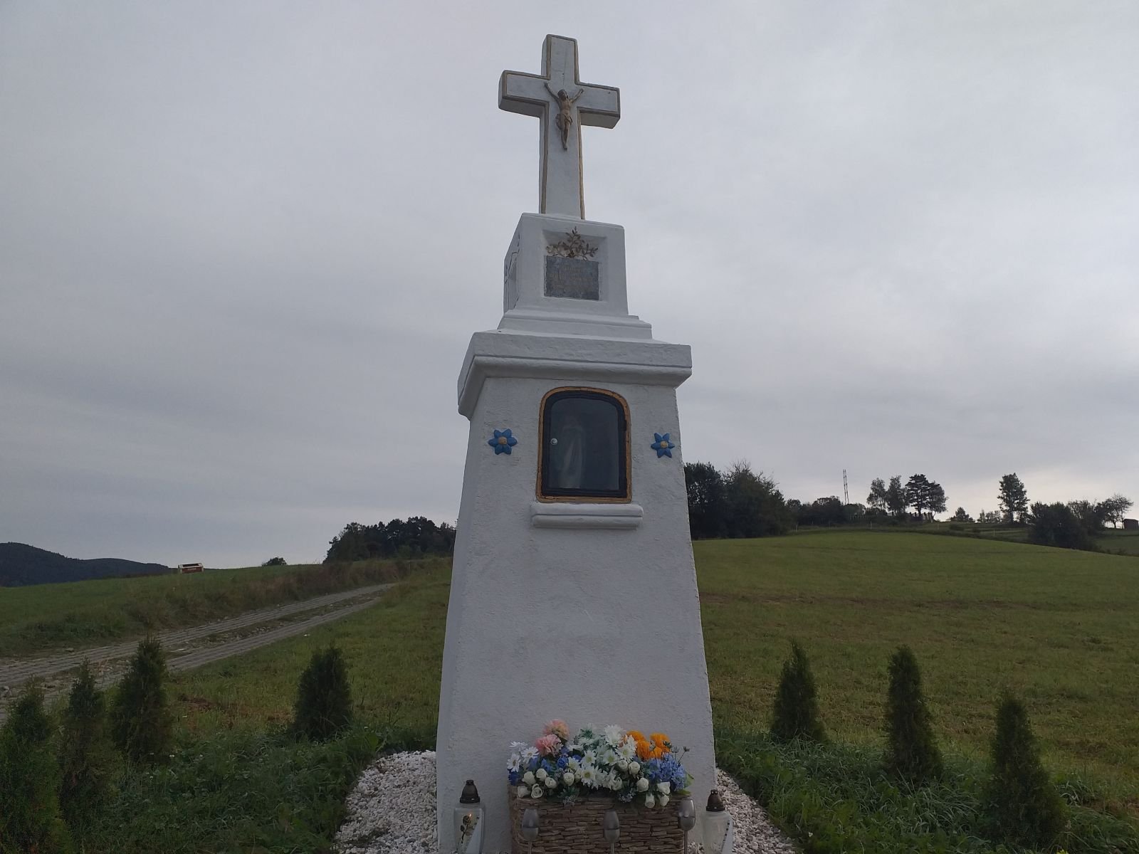 Droga szybko zaczyna piąć się w górę po betonowych płytach. Mozolnie krok za krokiem idziemy ostro w górę... Po około 25 minutach od zejścia z szosy w Łomnicy docieramy na grzbiet z rozległym pastwiskiem i pięknym widokiem na Łomnice. Mijamy kapliczkę, tutaj na prawo pojawia się szlak na Wierchomlę, w lewo dojście na niebieskie szlak, który także biegnie na Hale Łabowską. Po kilku chwilach schodzimy z betonowych płyt po których nie najlepiej nam się szło.