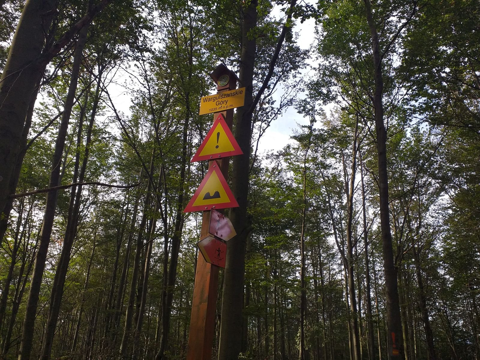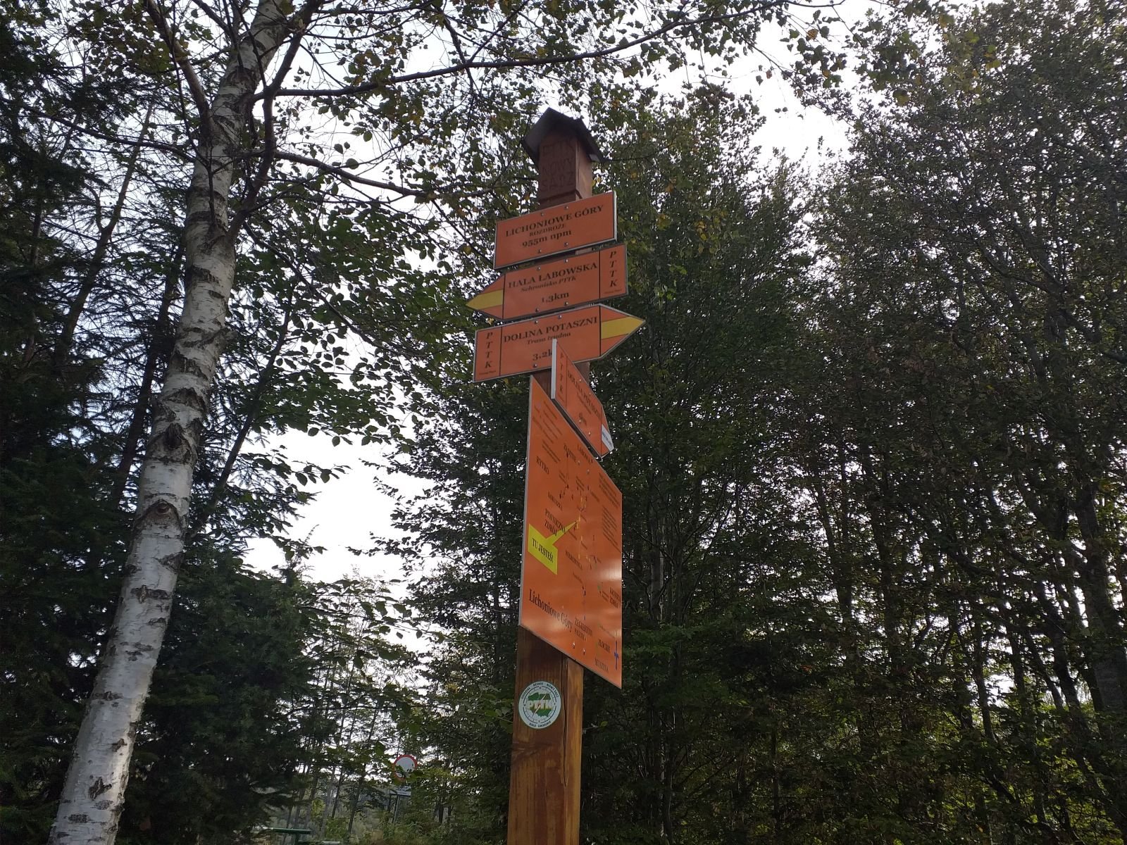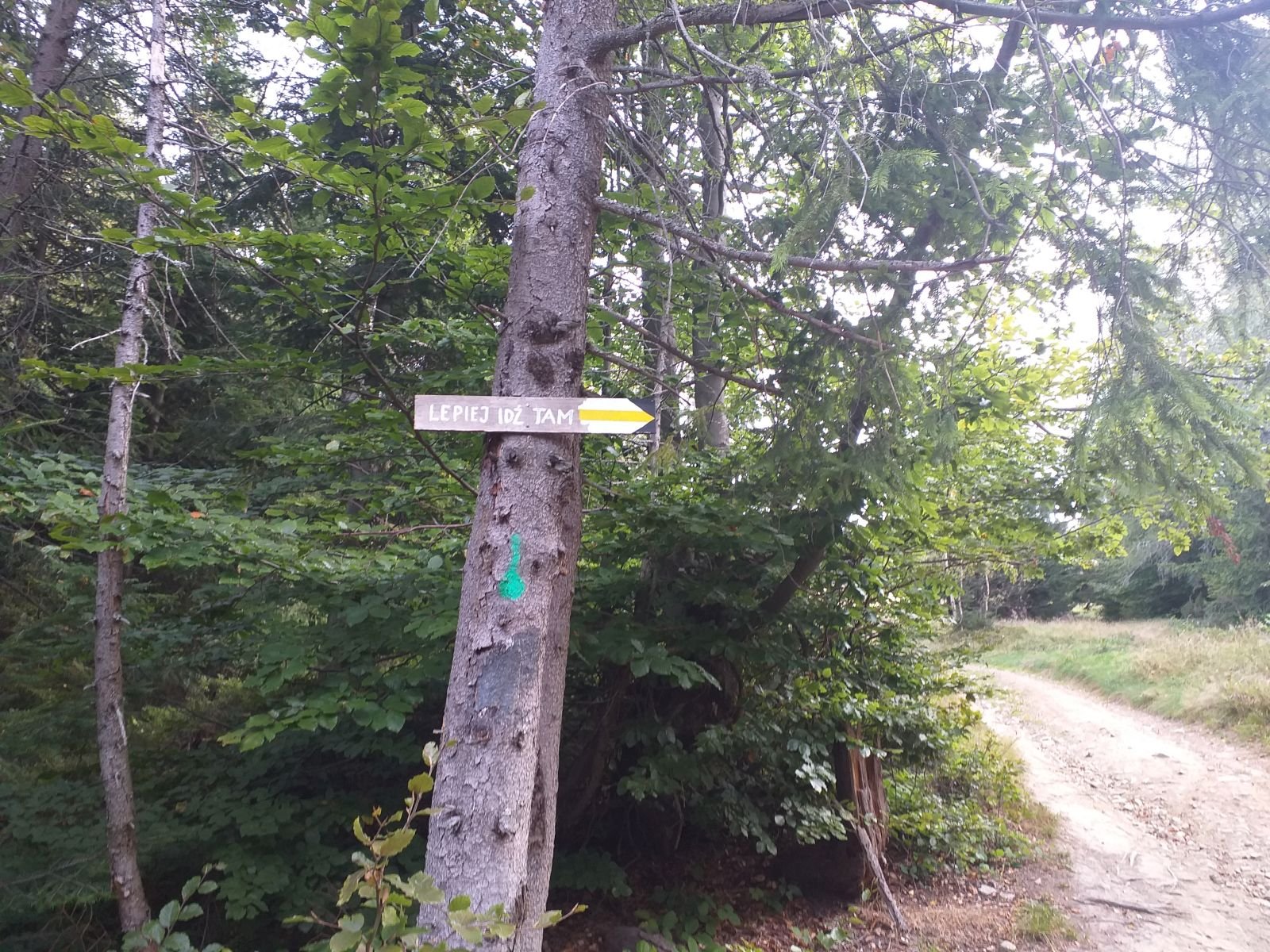 Po drodze sporo grzybiarzy, akurat w tym czasie był ich wysyp - my raczej na tym się nie skupialiśmy. Przed nami tabliczka, z bardzo ciekawym napisem LEPIEJ IDŻ TAM - i oczywiście pierwsze co ronimy, to idziemy na wprost popatrzeć czy coś nietypowego tam znajdziemy - no nic, powróciliśmy na szlak.