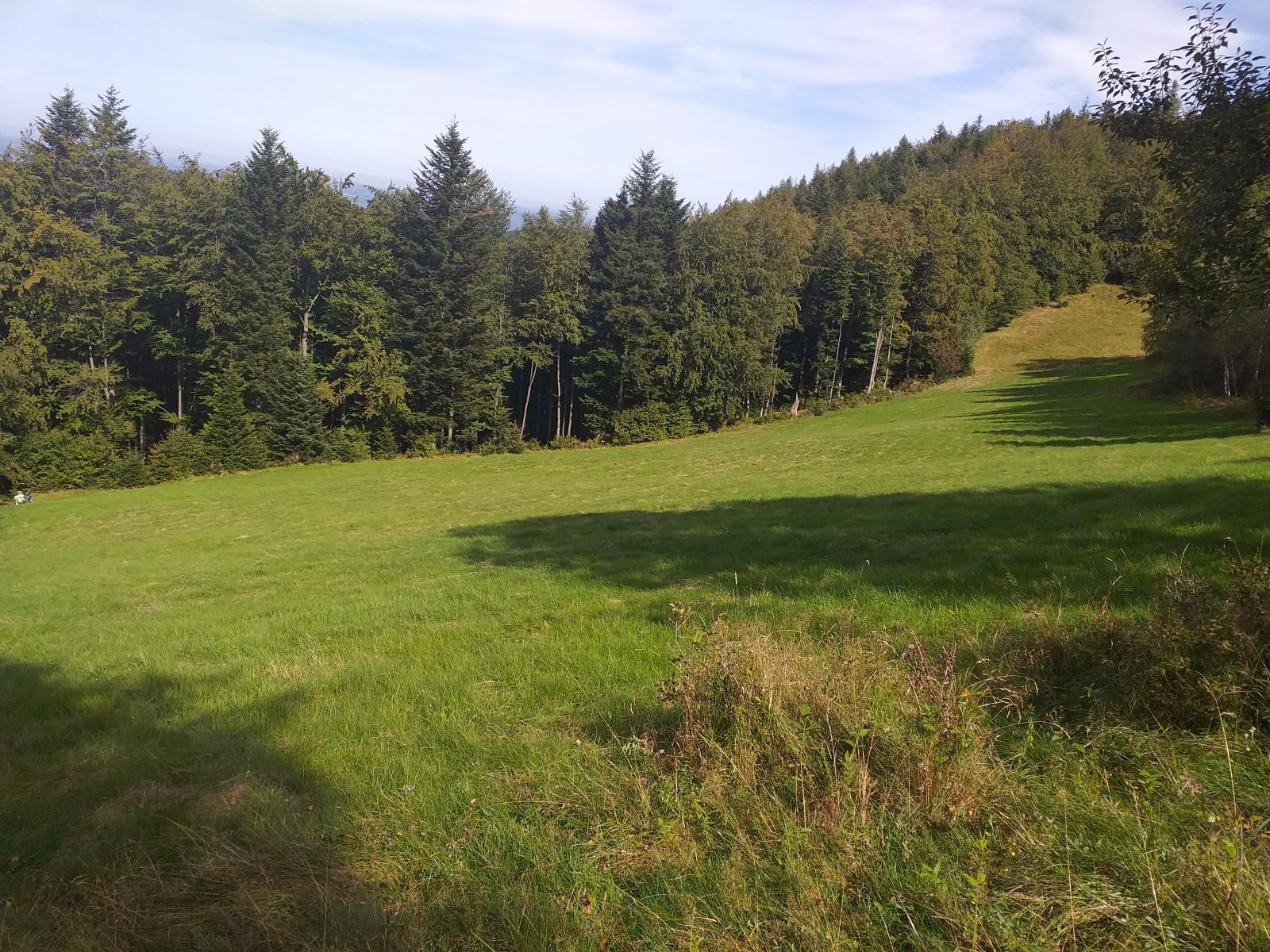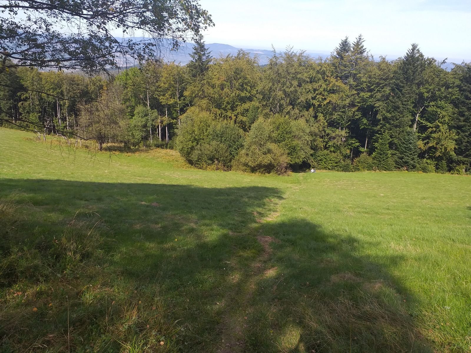 Podszczytowa polana przy Makowicy Panorama z Polany Czerteż na Pasmo Radziejowej. Na dole turyści z kocykiem piknikowym, bardzo przyjemne miejsce. Przed nami wejście do lasu, którym będziemy szli do Mostu nad Głębokim Jarem.
