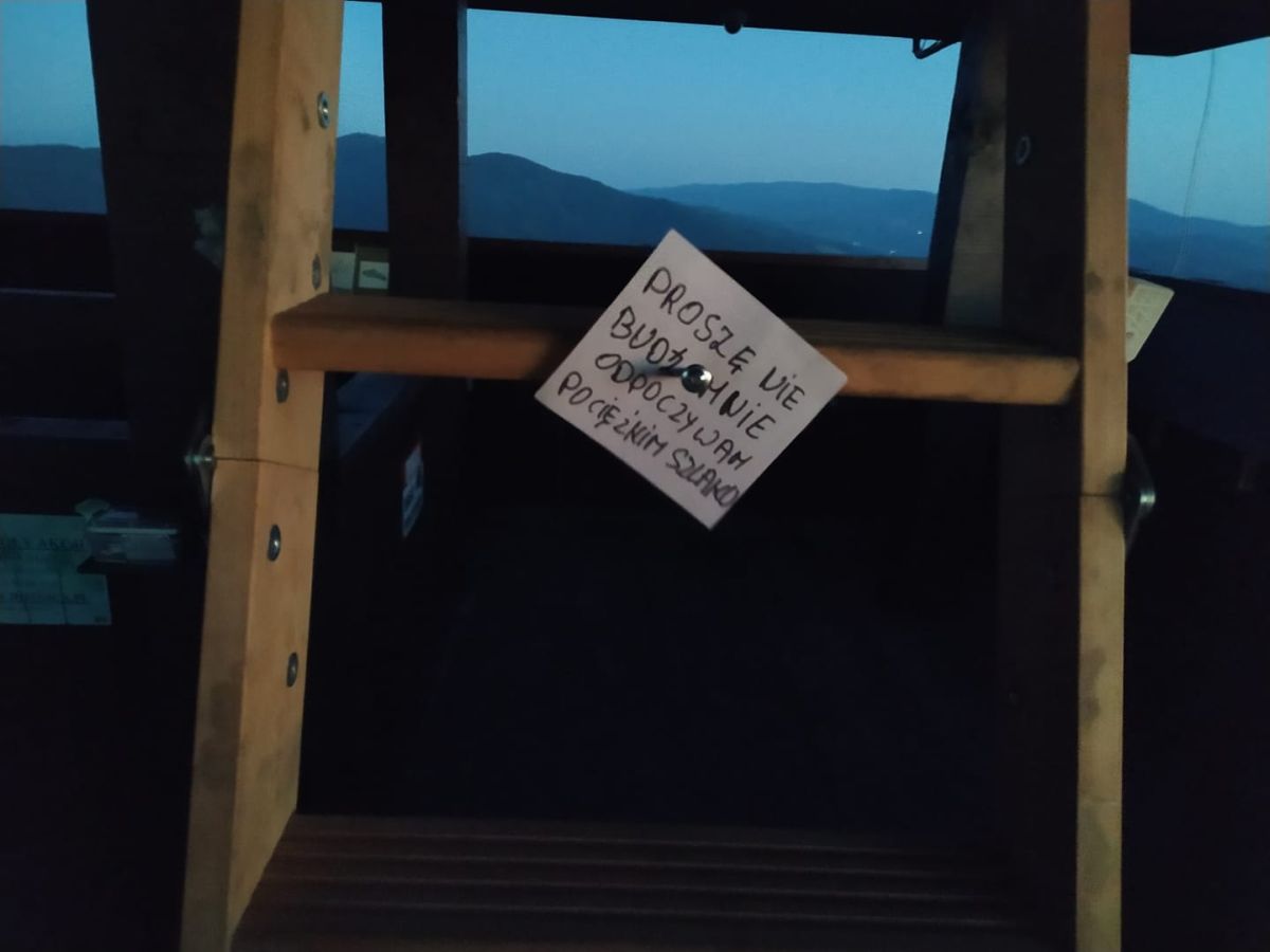 Pan, który spał miał budzik ustawiony na wschód słońca po czym udał się w dalszą drogę. Na wieży cieplutko nawet nie wieje... aż do momentu pojawienia się słońca. Momentalnie zrobiło się chłodno, zaczęło wiać. Widok niesamowity. Tatry oświetlone przez słońce, wszystkie wieże widokowe - Lubań Gorce bardzo dobrze widoczne, no idealnie. Słońce świeci intensywnie nam po oczach - ciemne okulary wskazane.