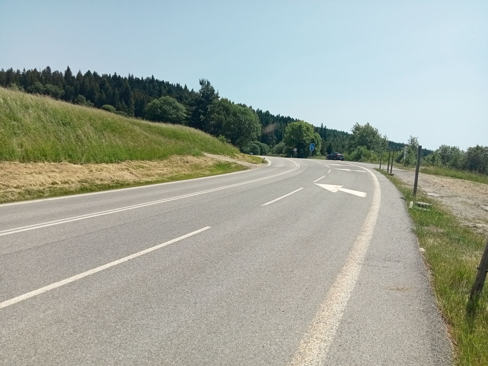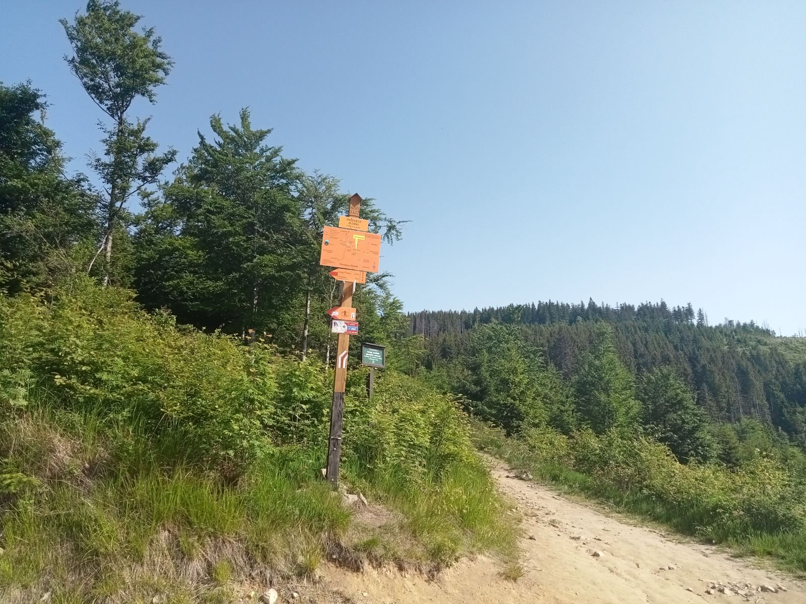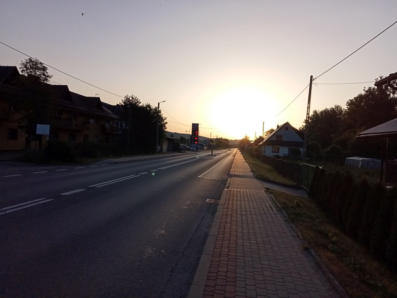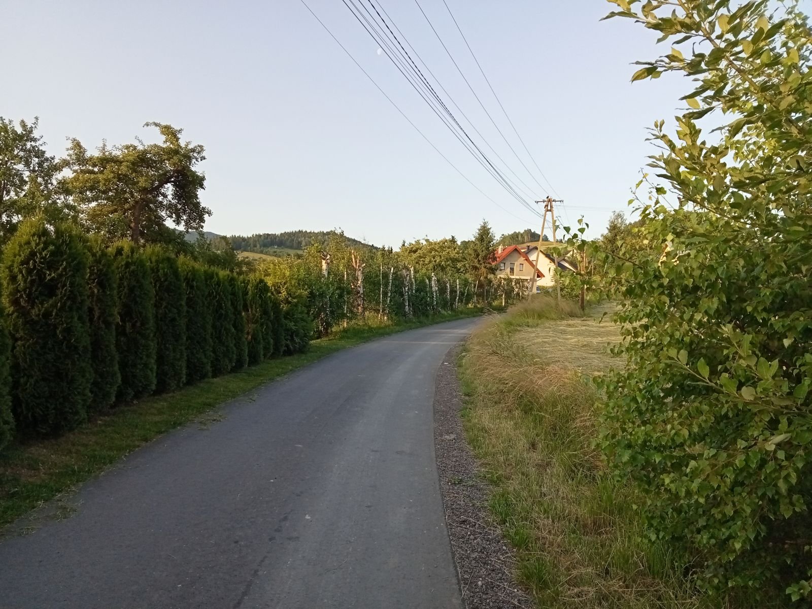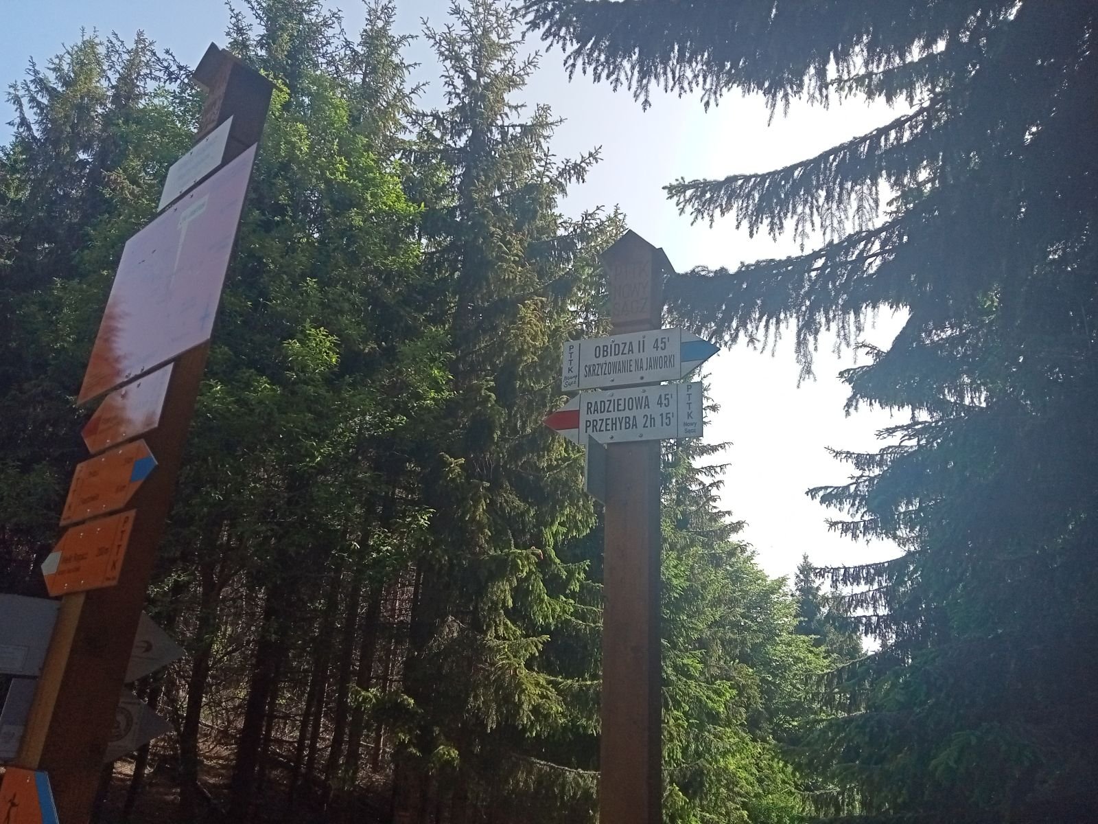 Wyprawę zaczynam od pysznej kawy na Stacji Paliw Moya w Jazowsku o godzinie 5:00 Zielony szlak na Przehybę, jego początek - znajduję się tuż obok przystanku na wysokości Budynku Wielofunkcyjnego. Kieruję się drogą asfaltową przez most w Obidzy i ostro pod górę drogą asfaltową na Łazy Brzyńskie. Jest stosunkowo chłodno, choć dzień zapowiada się upalnie. Jestem dość dobrze przygotowany, strategiczne punkty oznaczone, chcę uniknąć sytuacji z Ochotnicy gdzie nie przewidziałem, że busy nie zatrzymują się na "dworcu" tylko obok ;) Troszkę niewyspany co martwiło. Wyprawa w pojedynkę, przy tym zakładanym tempie nie chciałem nikogo zabierać.