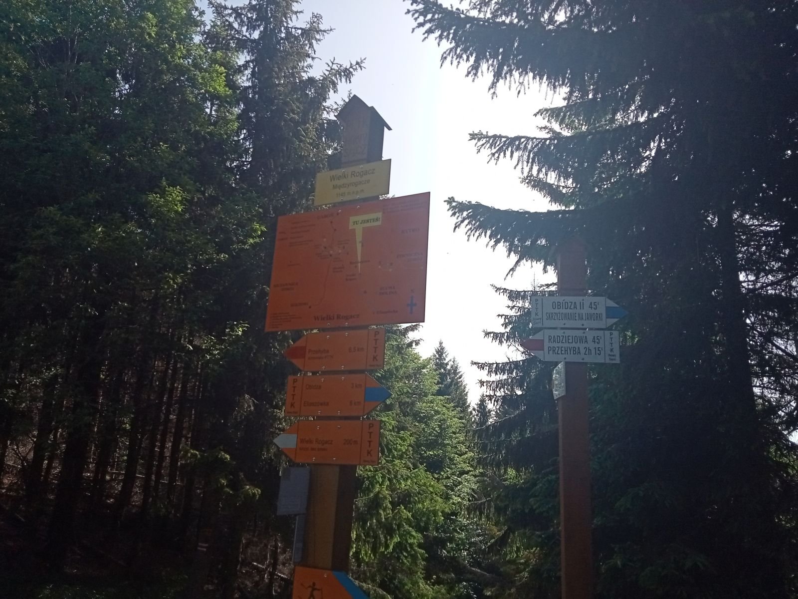 Widok z Łazów z okolicy wodociągu, schodzę z drogi asfaltowej i zaczynam poważne wspinanie. Tempo jest bardzo dobre. Względem map turystycznych najłatwiej nadrobić czas idąc pod górę. Odcinek z Jazowska na Przehybę przeszedłem w bardzo dobrym tempie. Według map to 4 godziny, mi udało się go pokonać w dwie godziny 20 minut. Już na Przehybie wiedziałem, że przy dobrym tempie przy Radziejowej nie tylko spokojnie zdążę na pociąg powrotny, ale coś i zwiedzę. Przez 9 godzin wędrówki nie było ani minuty przerwy, by gdzieś na ławce usiąść, posiłek także w marszu. Ogólnie było 5 minut postoju na wieży widokowej na Eliaszówce z której i tak niewiele widać;)