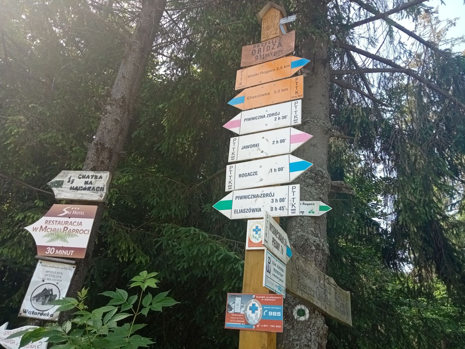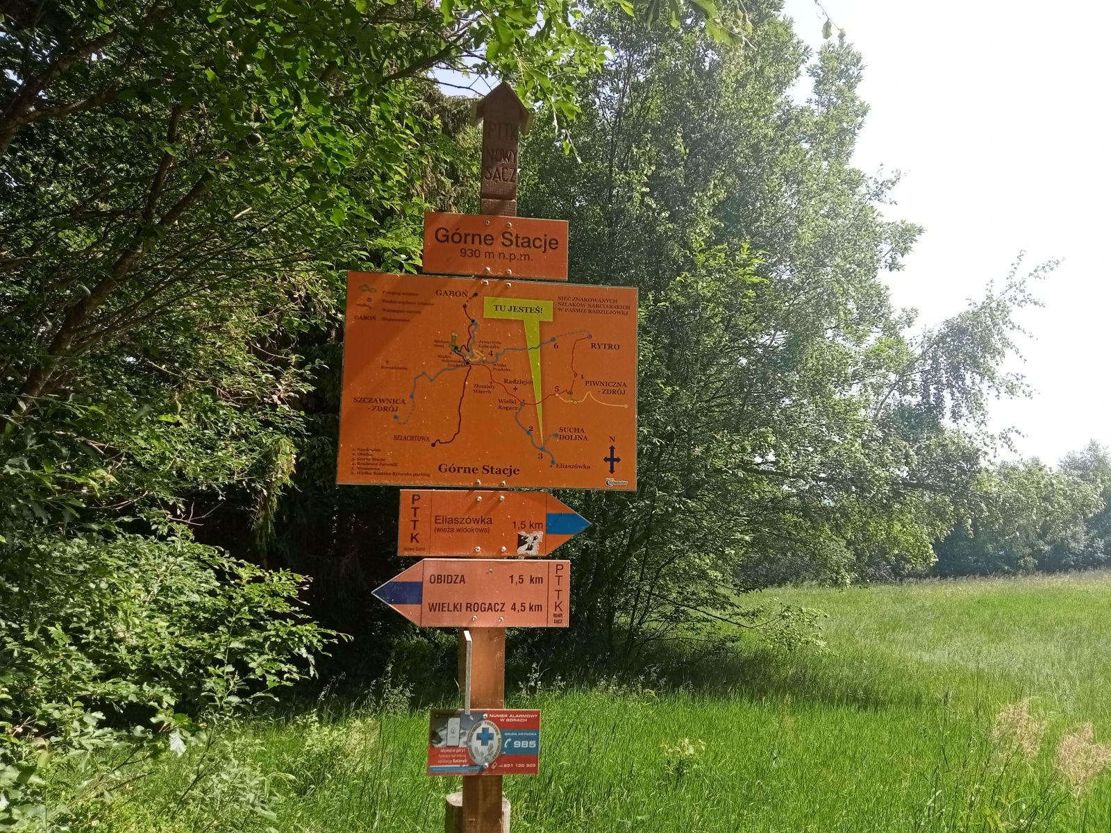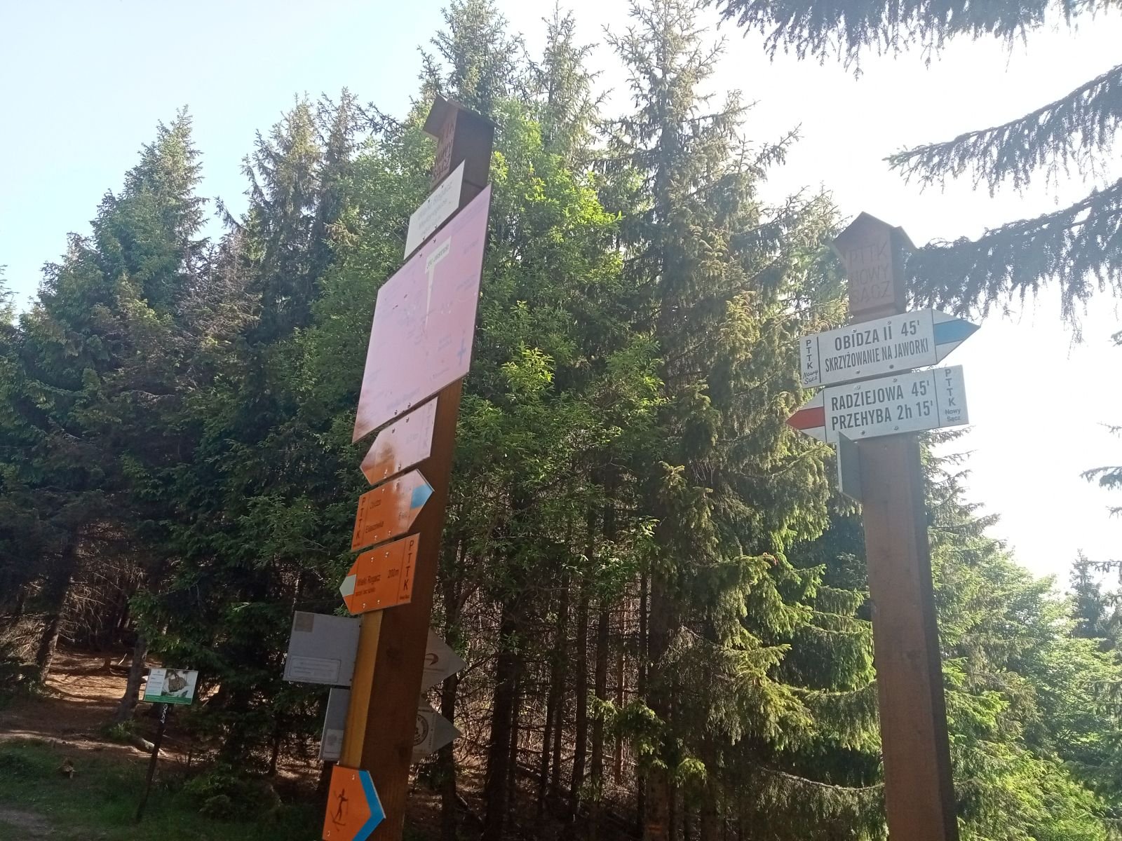 Przełęcz Gromadzka odbijam zielonym szlakiem na Eliaszówkę. Jest gdzie pochodzić z tego miejsca, nieopodal znajduję się Bacówka w Obidzy i chyba najwyżej położony parking w kraju. Jest tłoczno, sporo osób wybiera Pieniny.
