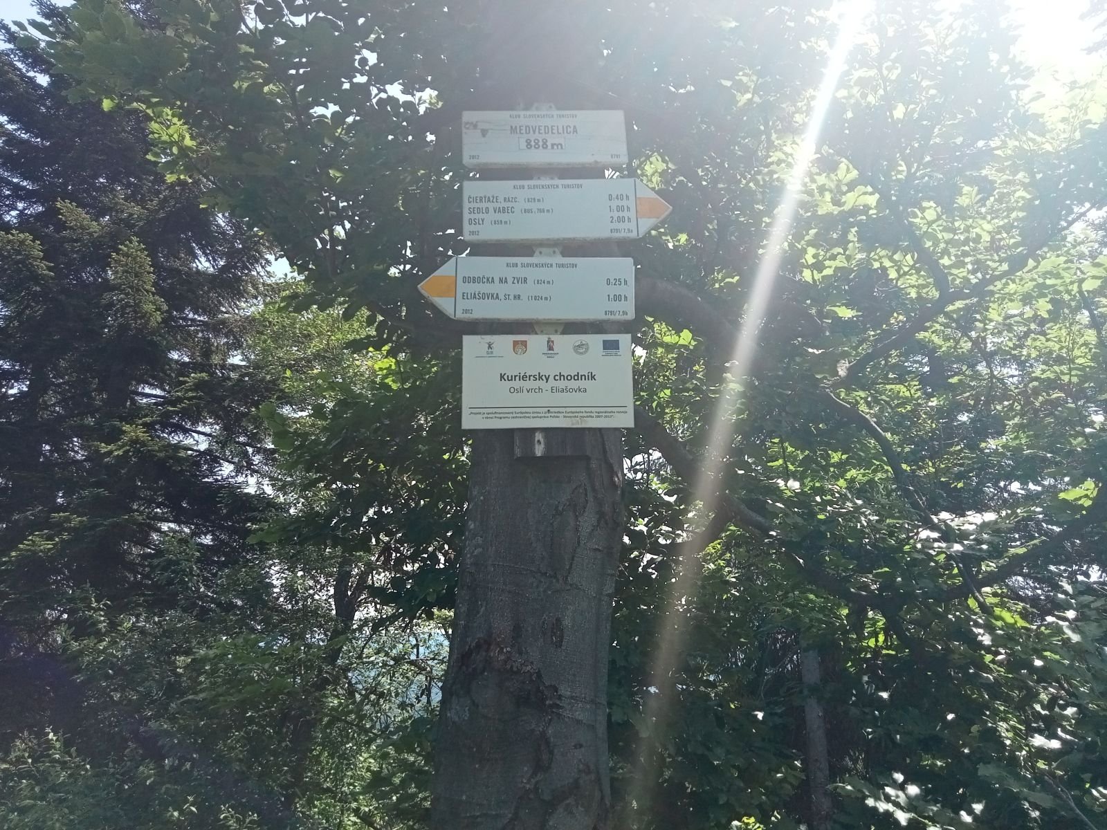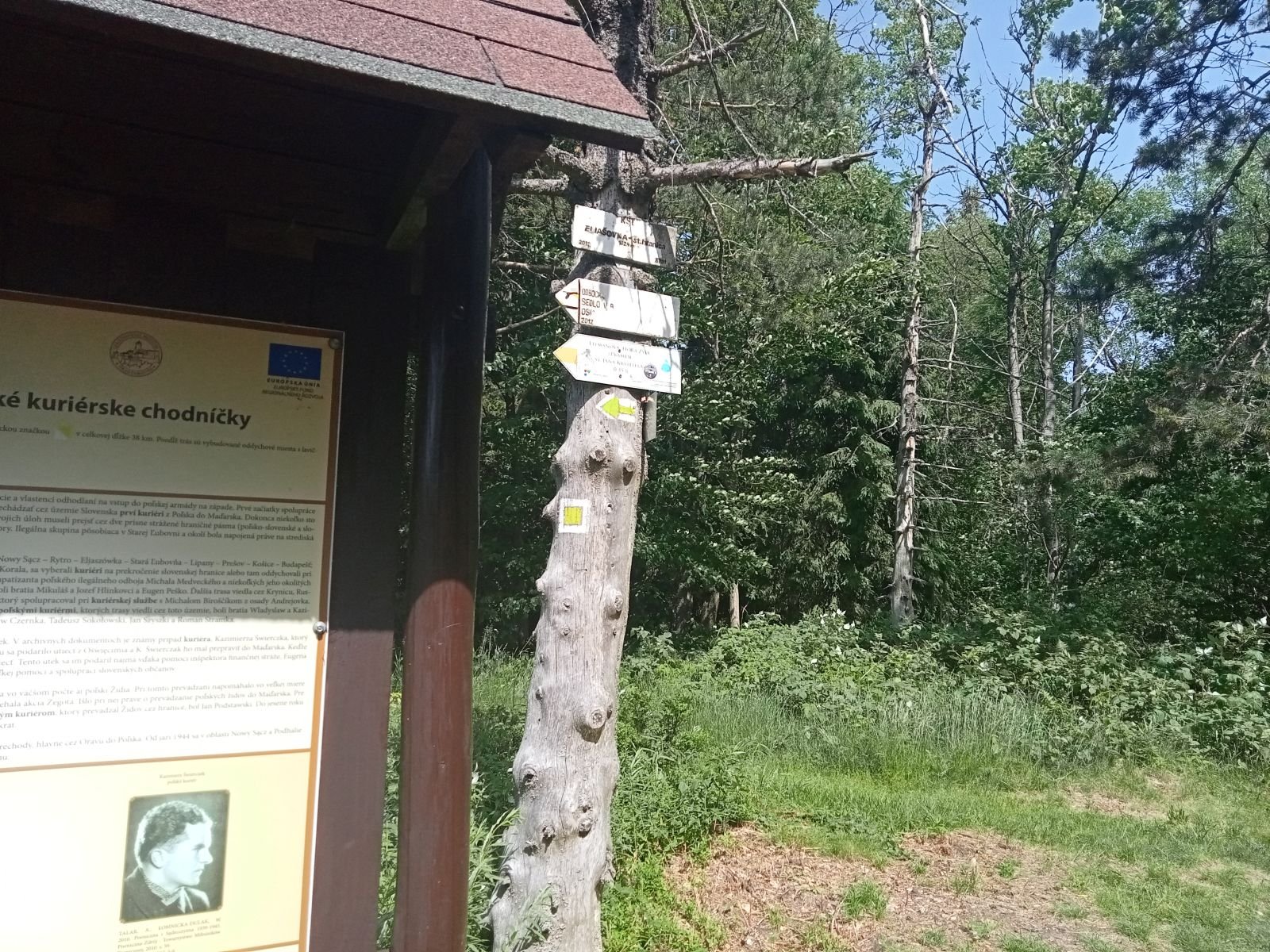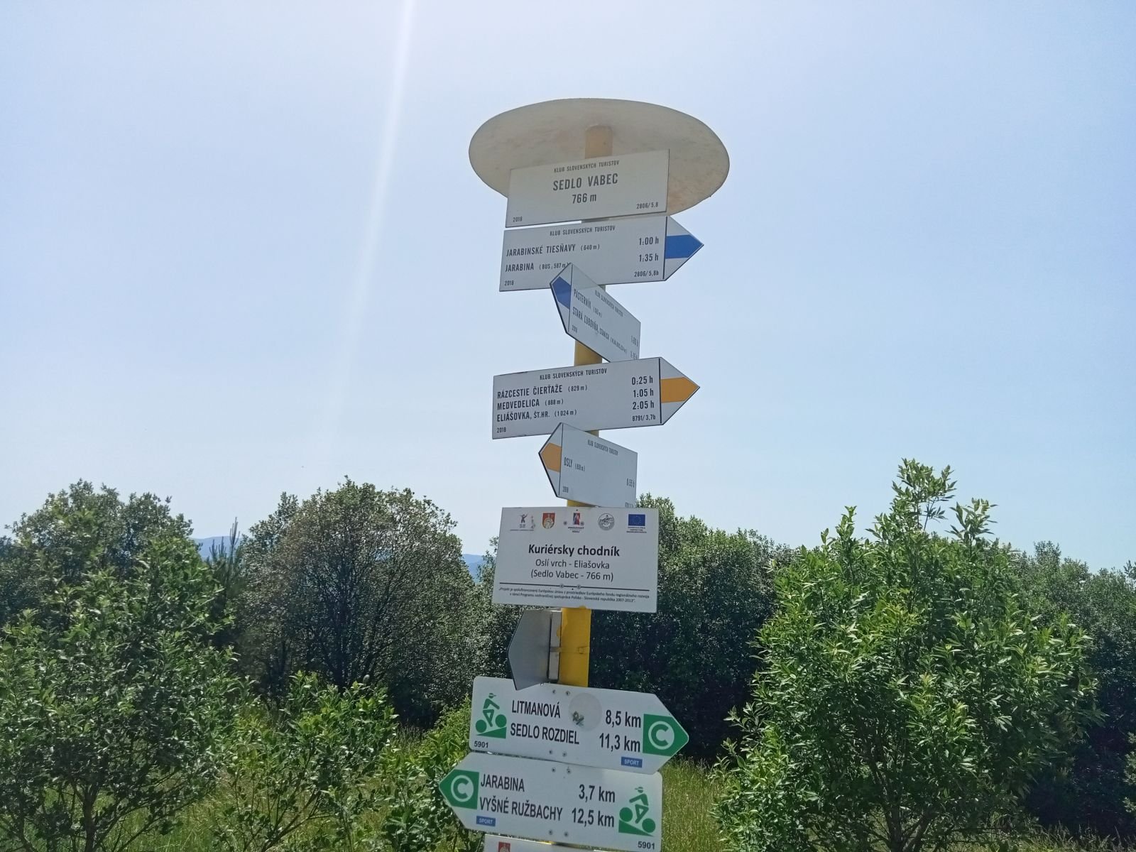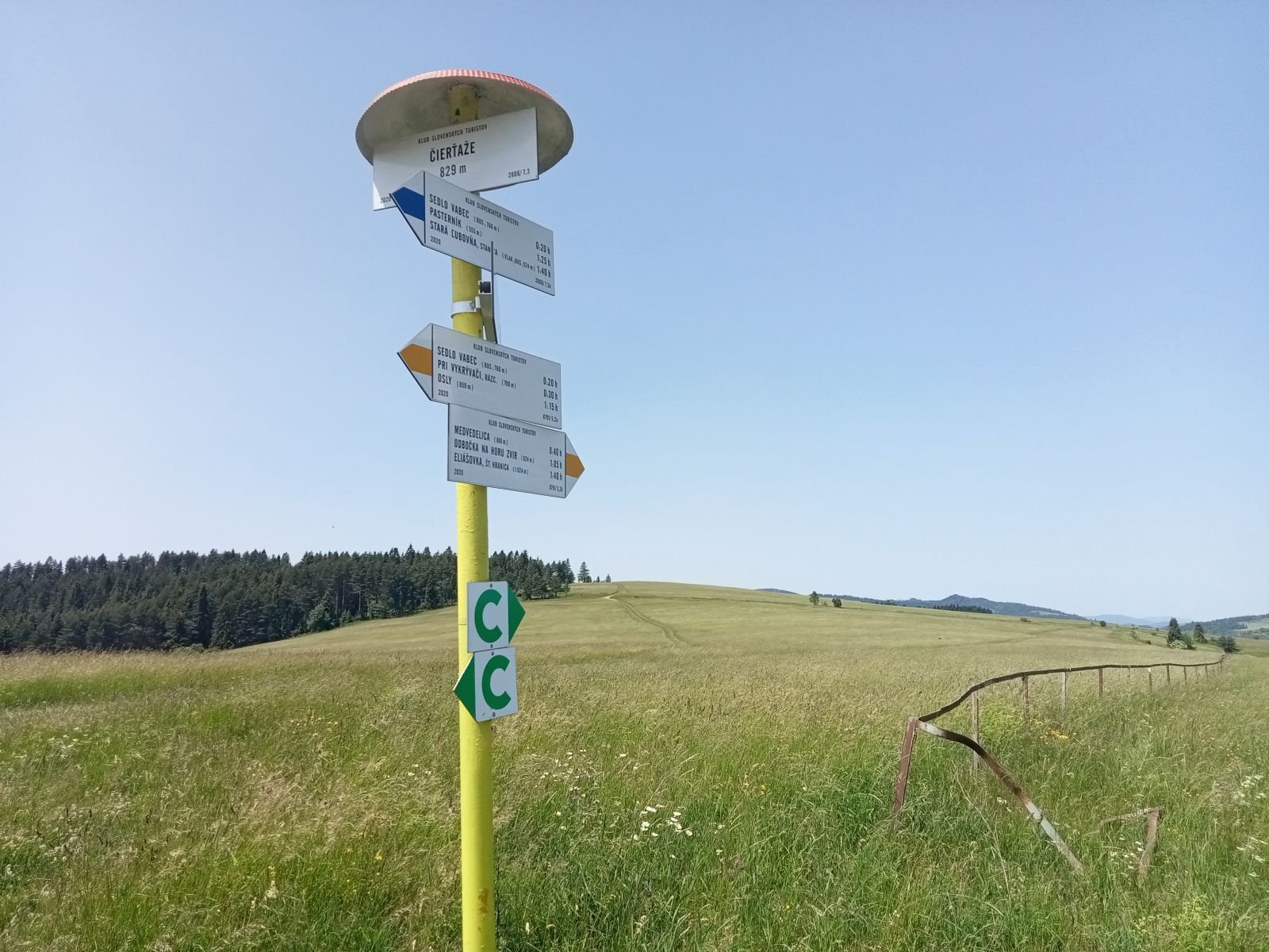 Čierťaže, odejście szlaku niebieskiego w kierunku wsi Jarzębina. Tutaj pojawił się pomysł czy nie pójść około kilometra tym niebieskim szlakiem... by z kolei dojść do Čertova skala, czyli taki skalny grzyb. Ponoć dość efektowanie to wygląda, ale dokładać około 3 kilometrów by ponownie znaleźć się w tym miejscu, no nie chciało mi się. Ścieżka bardzo przyjemna ogrodzona, zadbane pola, no super. Co oznacza literka C na oznakowaniu co widać na powyższym zdjęciu tego nie wiem. Fajny daszek na drogowskazie.