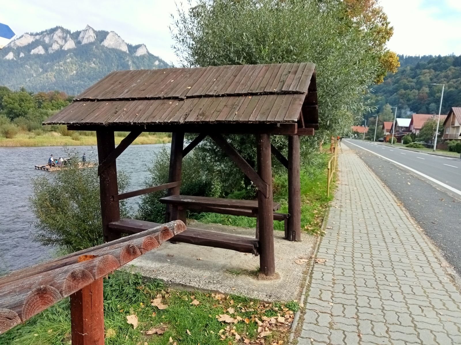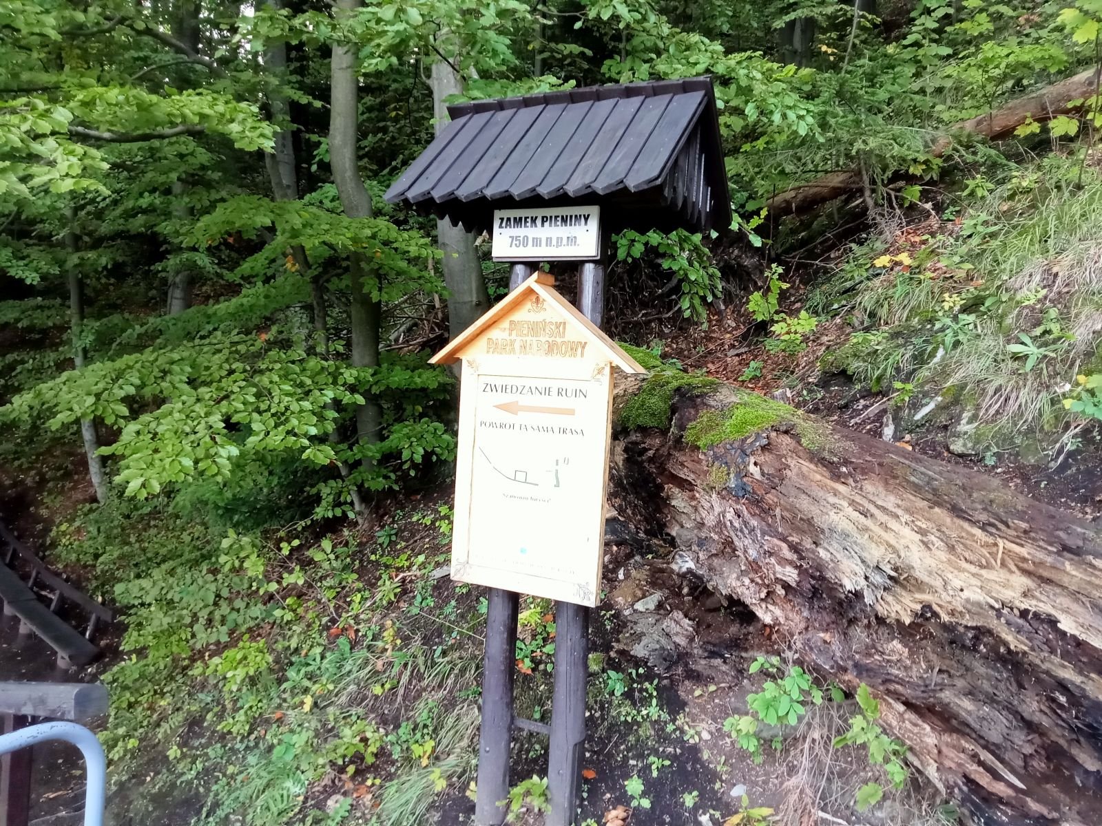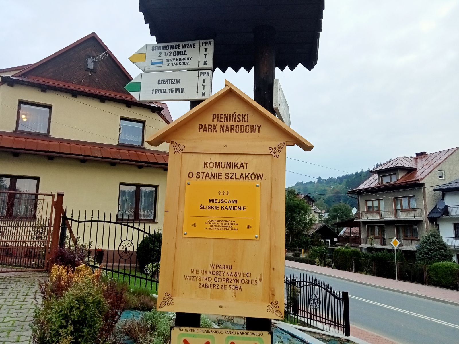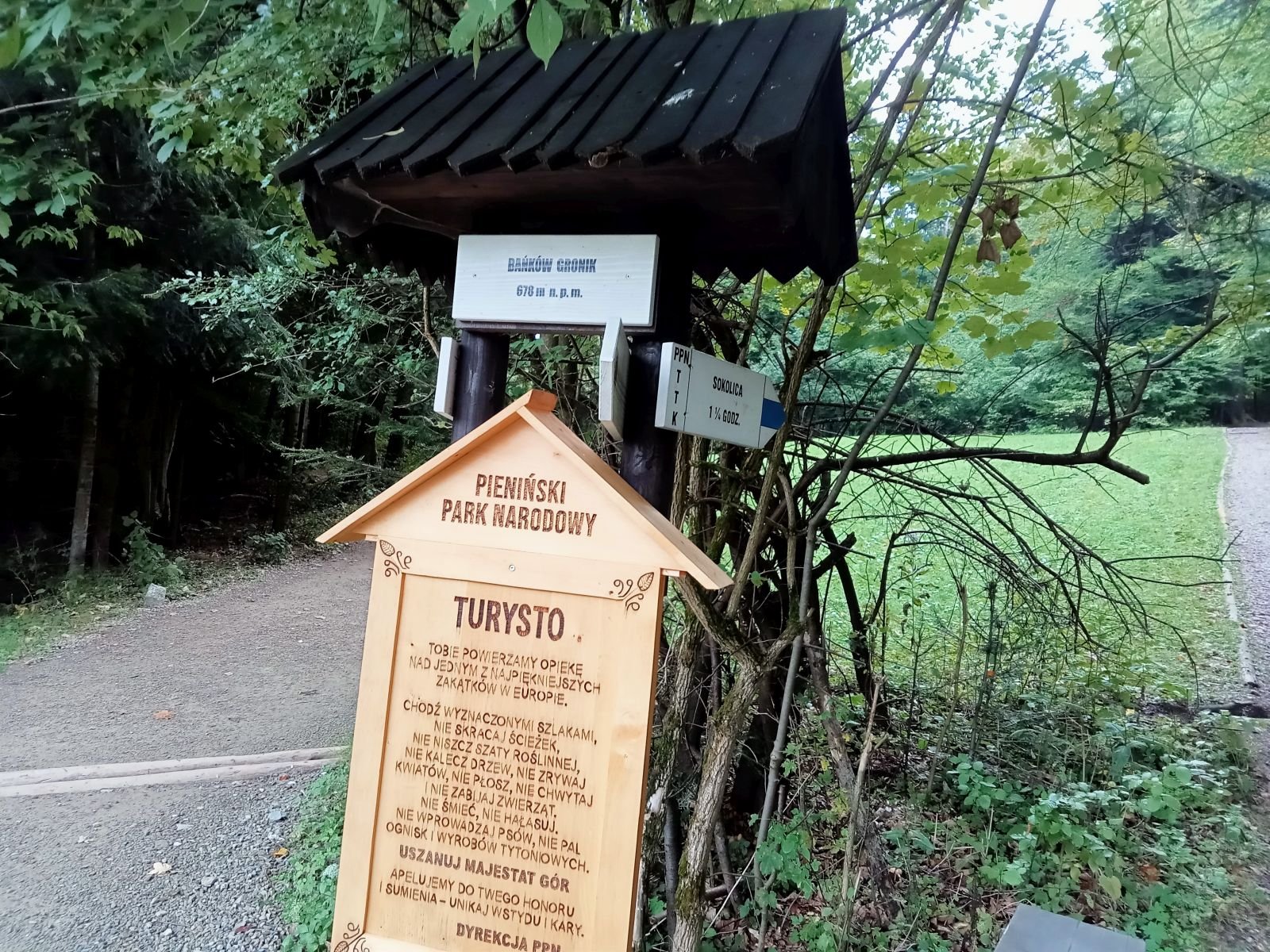 Tutaj kupuje się bilety na wstęp na Trzy Korony w późniejszej porze dnia. Zazwyczaj na pobliskich ławeczkach w sezonie nie ma nawet miejsca, by usiąść. Wchodzimy na platformę mijamy dwie osoby, które z niej schodzą.
