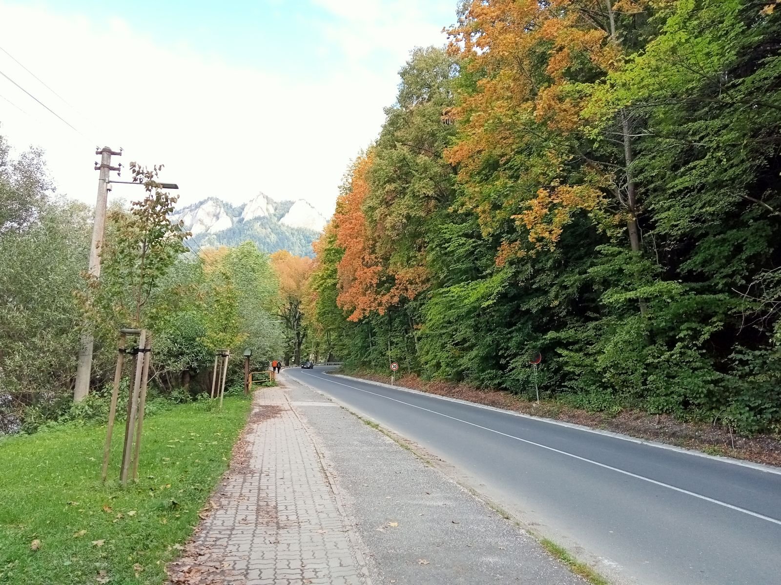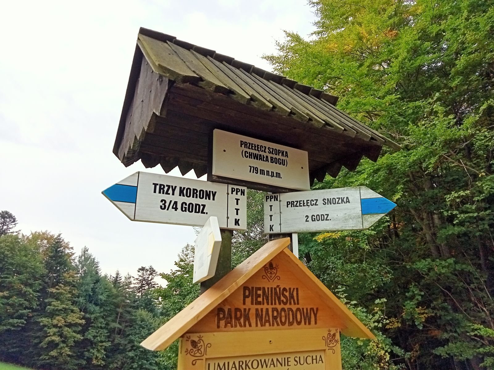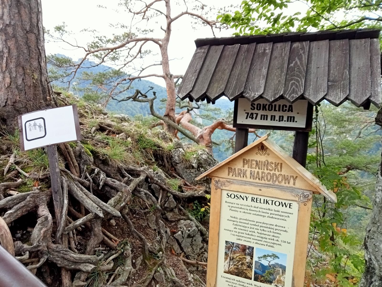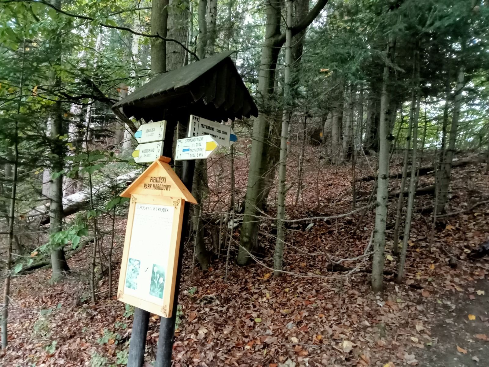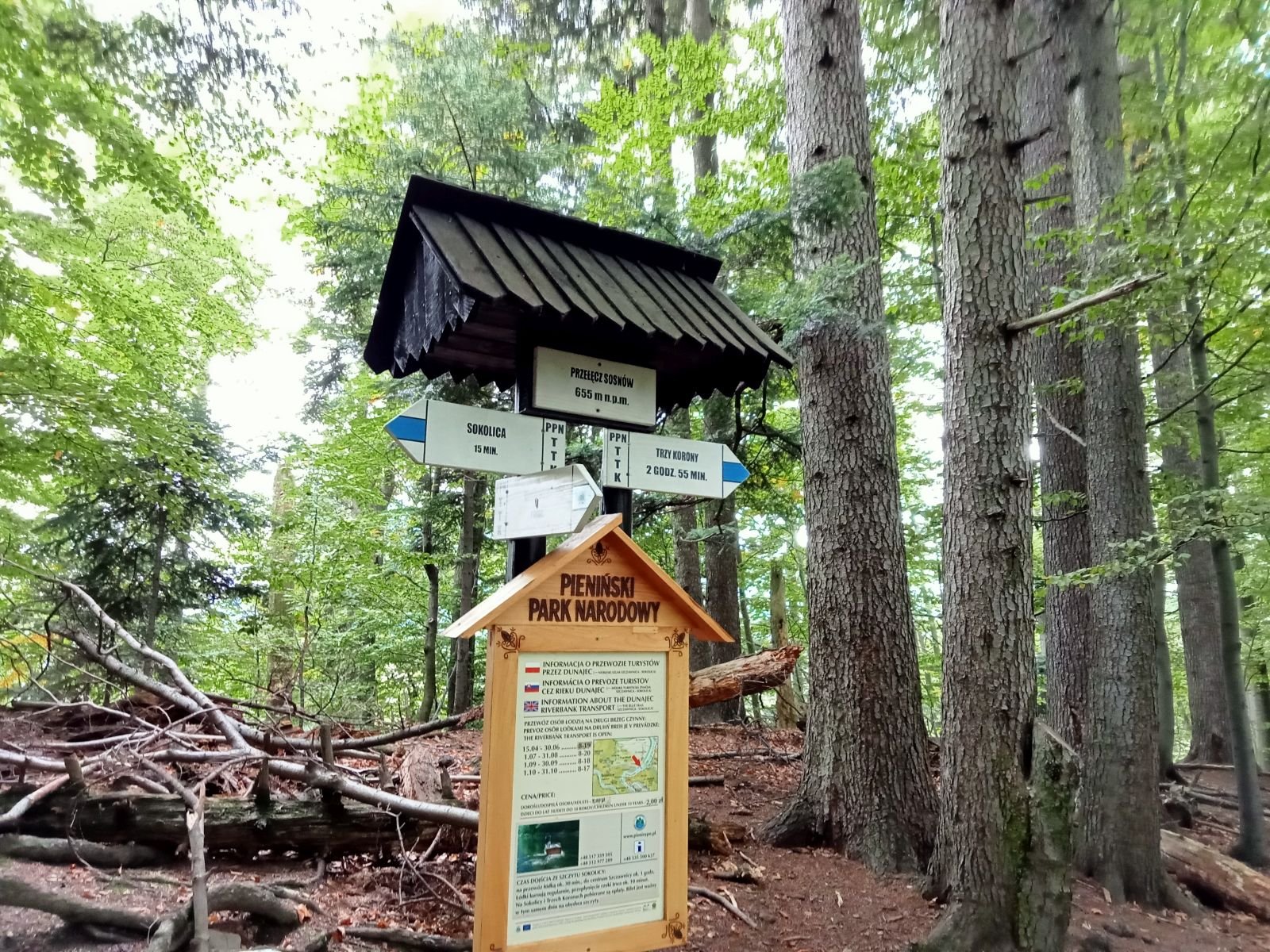 Tutaj kupuje się bilety na wstęp na Trzy Korony w późniejszej porze dnia. Zazwyczaj na pobliskich ławeczkach w sezonie nie ma nawet miejsca, by usiąść. Wchodzimy na platformę mijamy dwie osoby, które z niej schodzą.