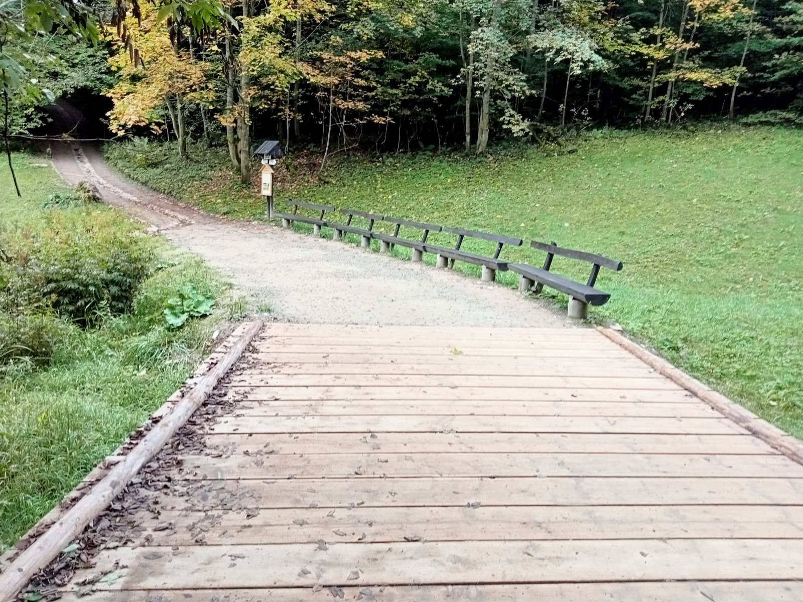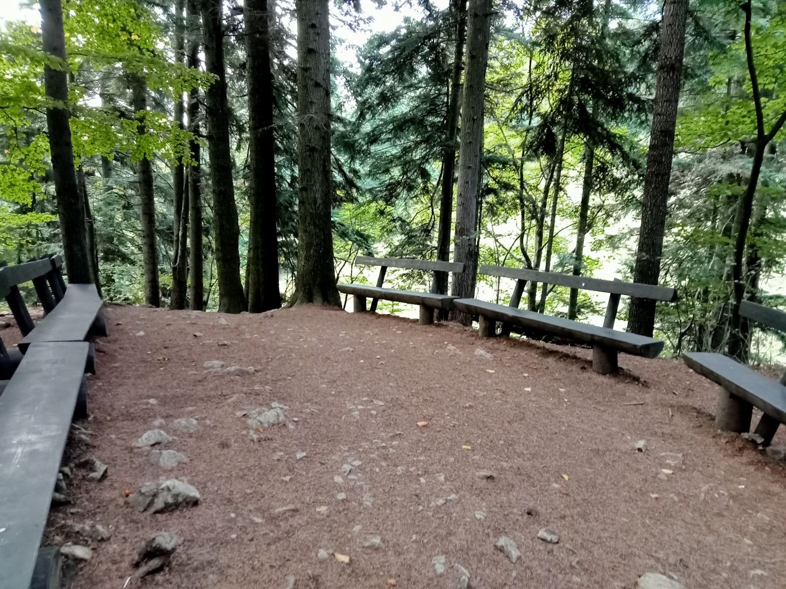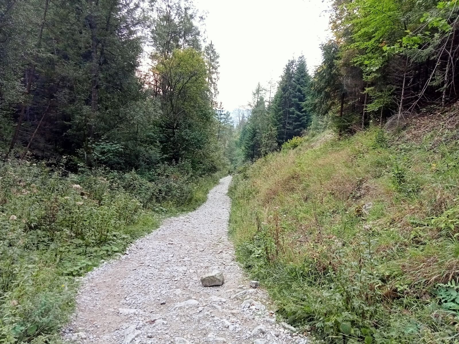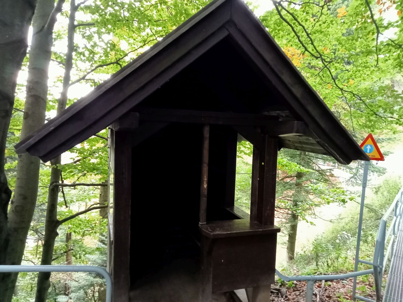Tutaj kupuje się bilety na wstęp na Trzy Korony w późniejszej porze dnia. Zazwyczaj na pobliskich ławeczkach w sezonie nie ma nawet miejsca, by usiąść. Wchodzimy na platformę mijamy dwie osoby, które z niej schodzą.