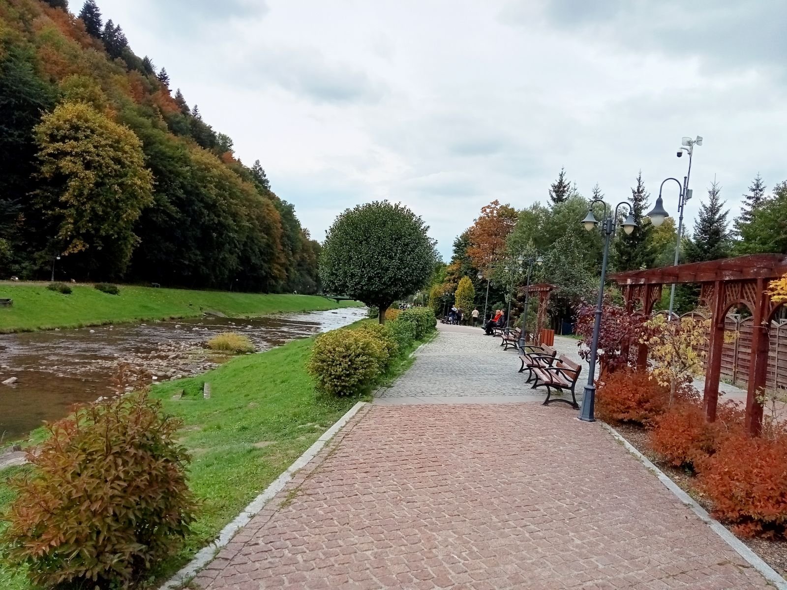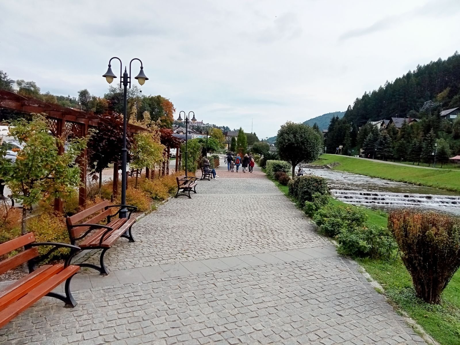 W Szczawnicy jak zwykle pełno osób, niektóre budki już się pozamykały po sezonie.