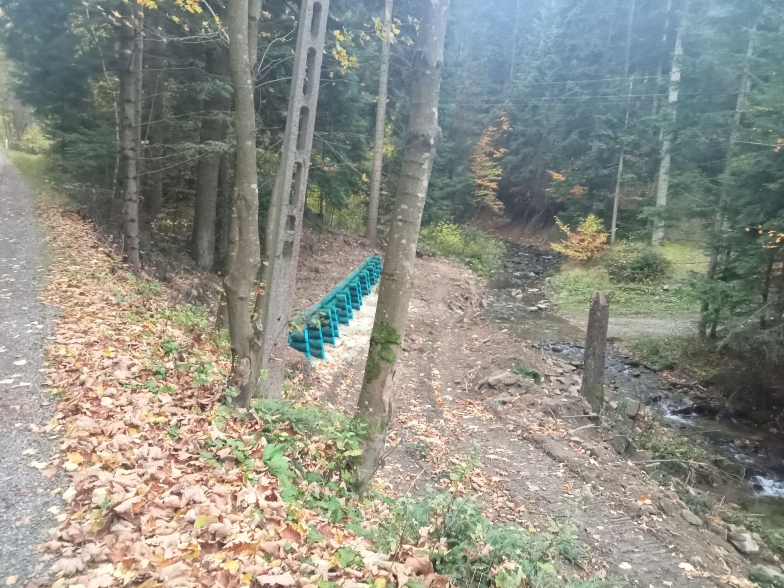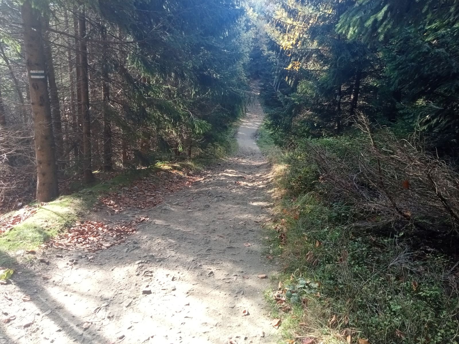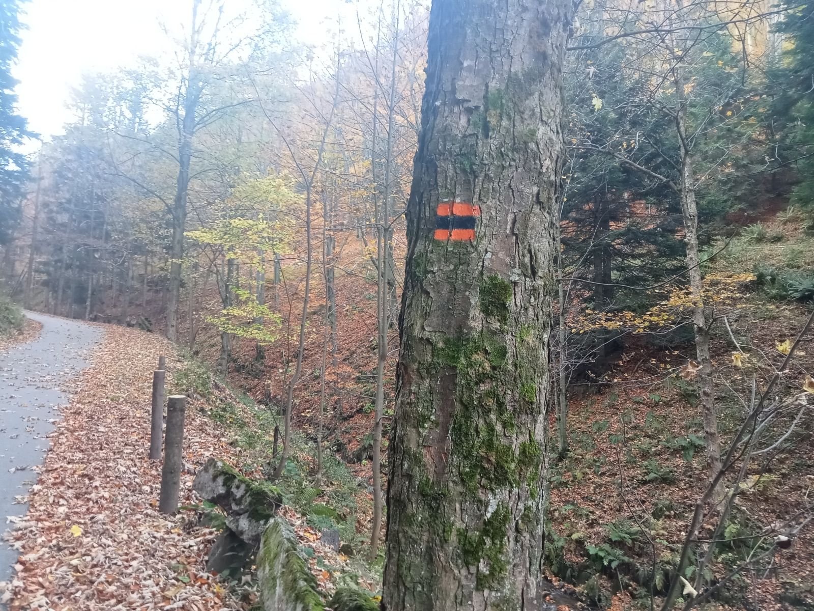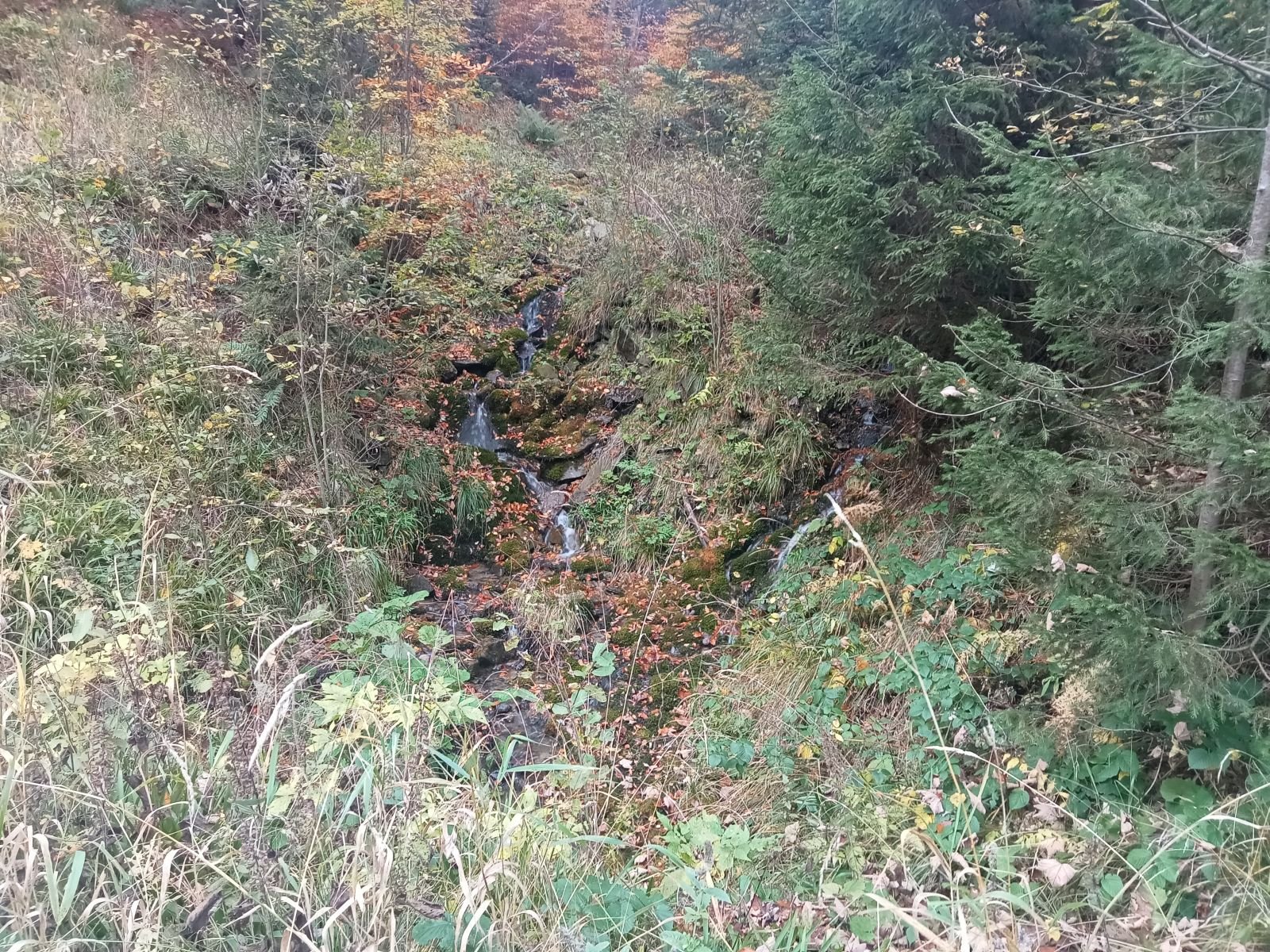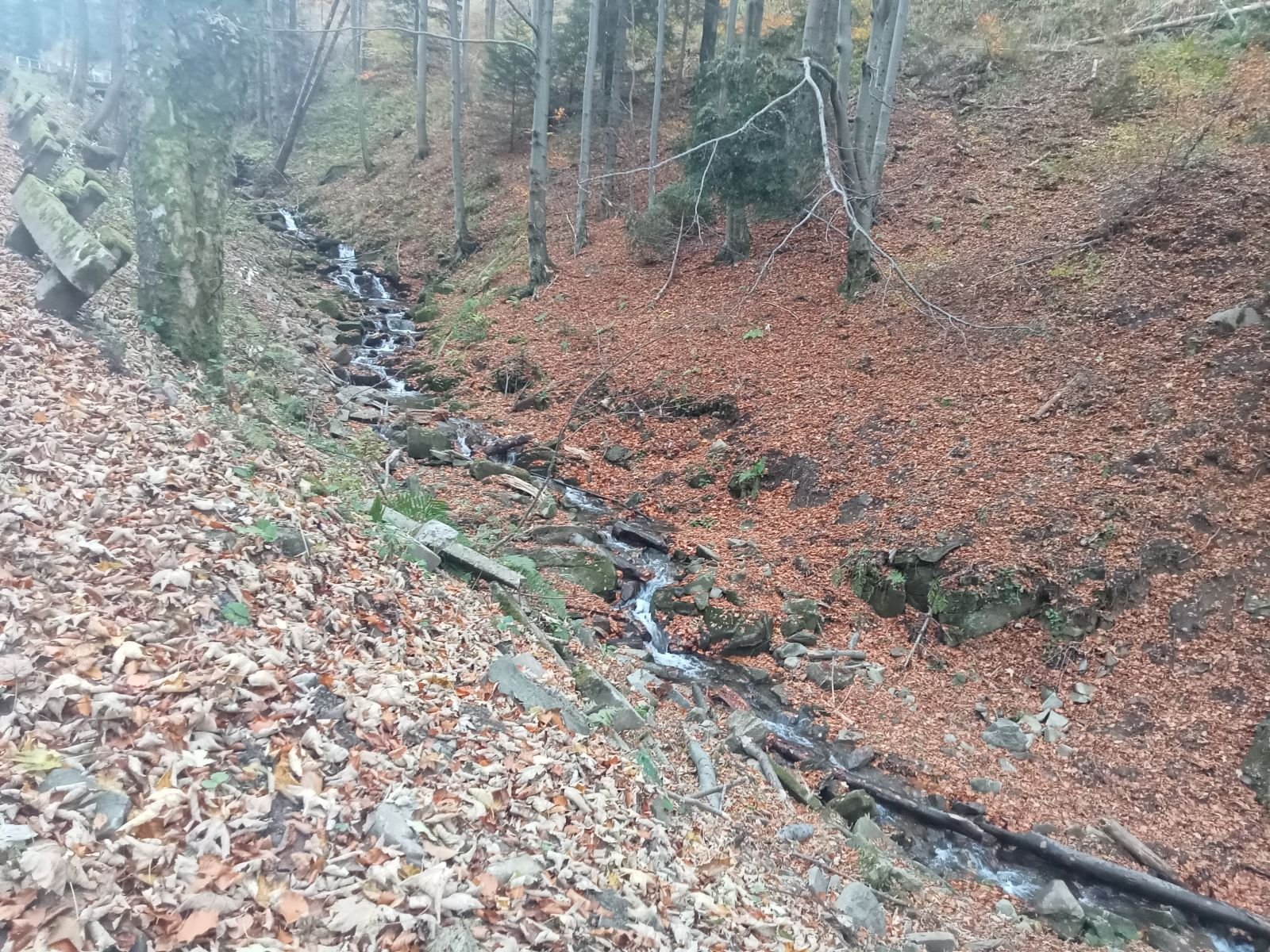 Dojście do Przehyby oznaczone jest na czarno, ten odcinek był przez nas sporo razy opisywany. Ładnie ten teren wygląda jesienią, trzeba to przyznać! Potok Jaworzynka widoczny na poniższym zdjęciu towarzyszy nam przez kolejne kilometry. Już po chwili wędrówki spotykamy pierwszego rowerzystę zjeżdżającego z góry z latarką czołową umieszczoną oczywiście na głowie, ciekawe o której zaczął swoją nocną trasę.