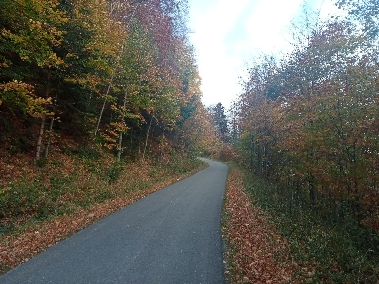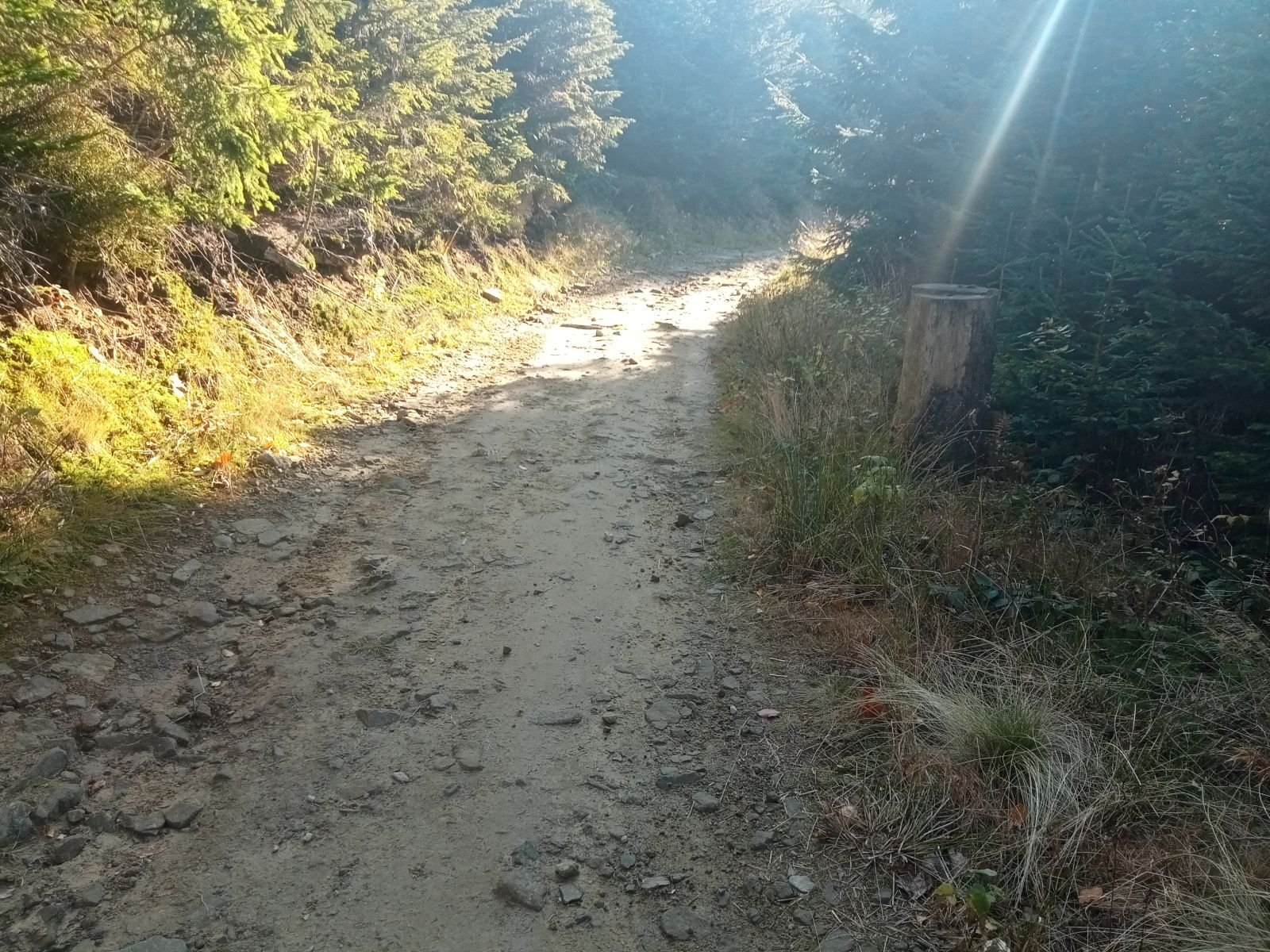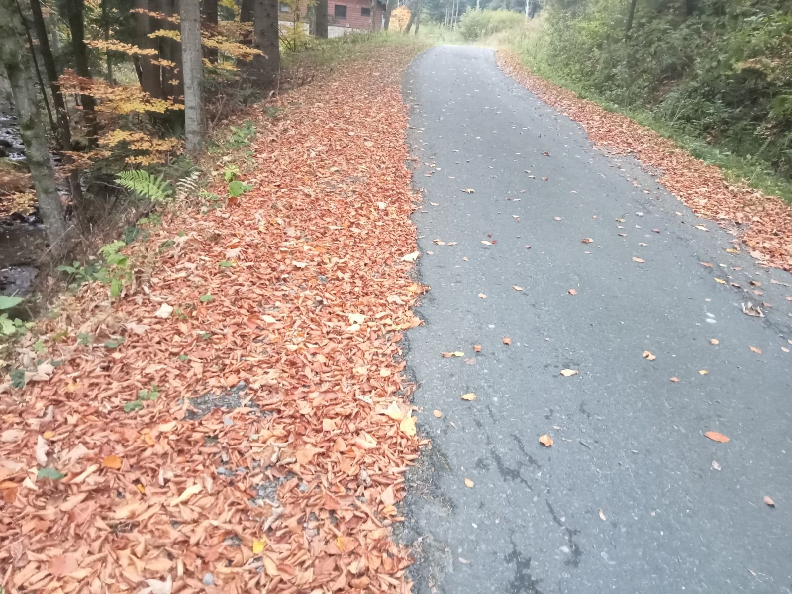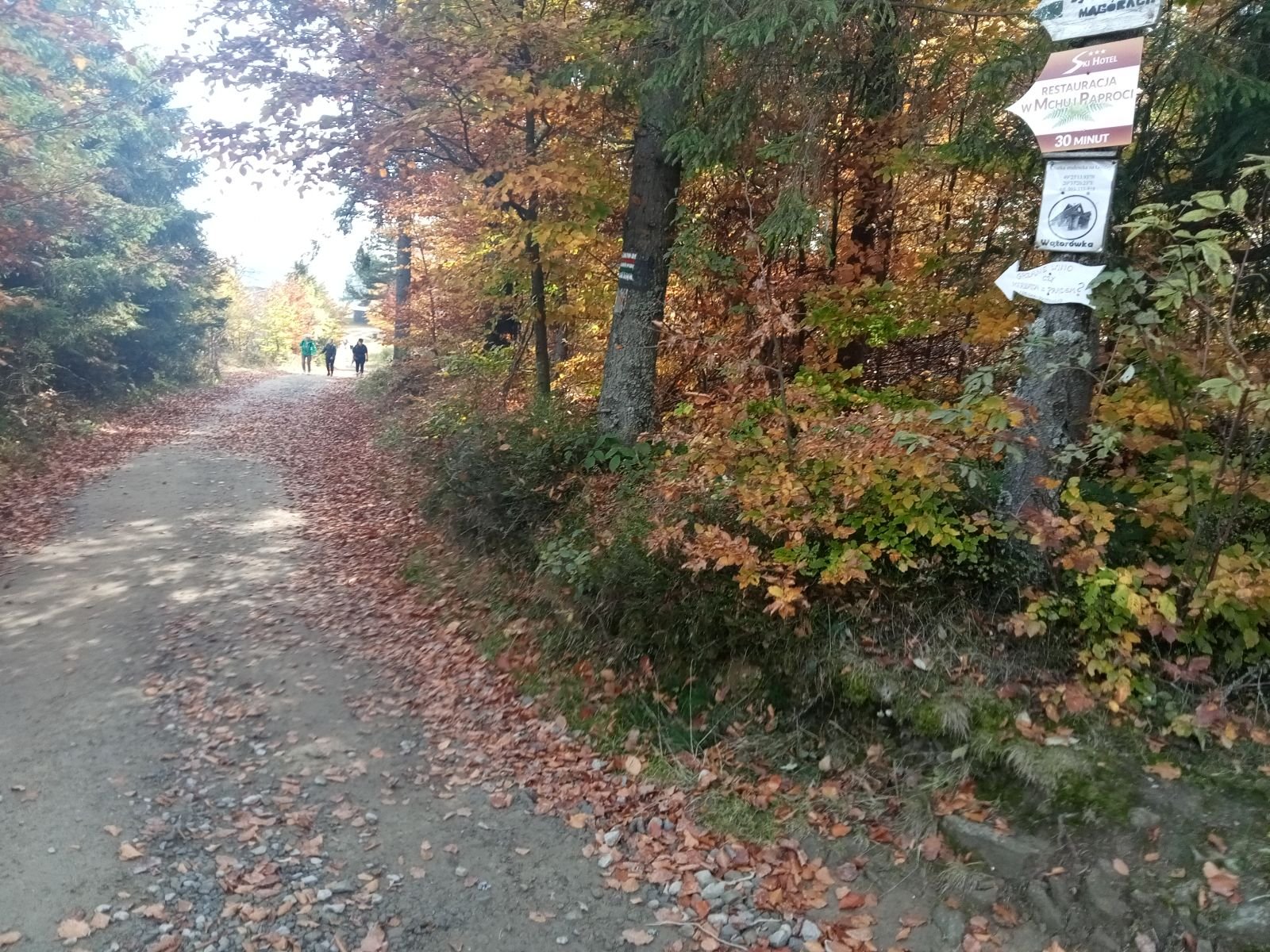 Dojście do Przehyby oznaczone jest na czarno, ten odcinek był przez nas sporo razy opisywany. Ładnie ten teren wygląda jesienią, trzeba to przyznać! Potok Jaworzynka widoczny na poniższym zdjęciu towarzyszy nam przez kolejne kilometry. Już po chwili wędrówki spotykamy pierwszego rowerzystę zjeżdżającego z góry z latarką czołową umieszczoną oczywiście na głowie, ciekawe o której zaczął swoją nocną trasę.
