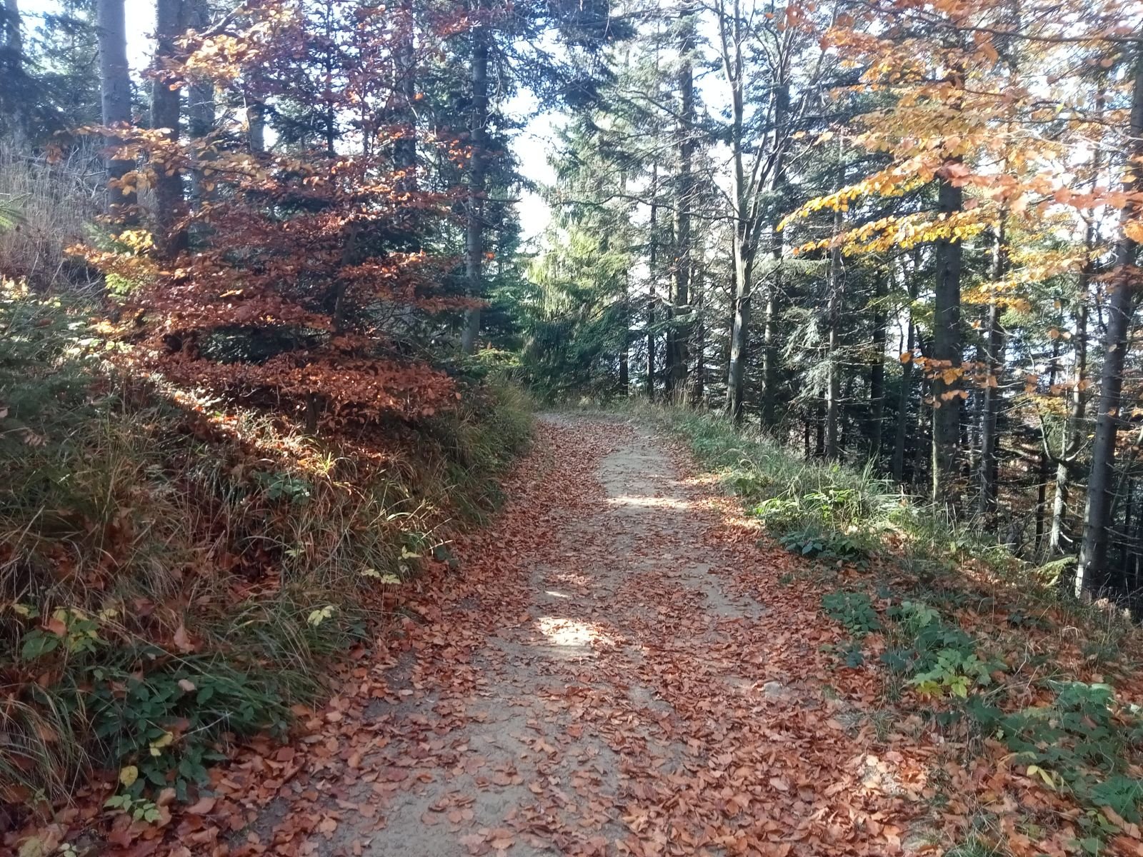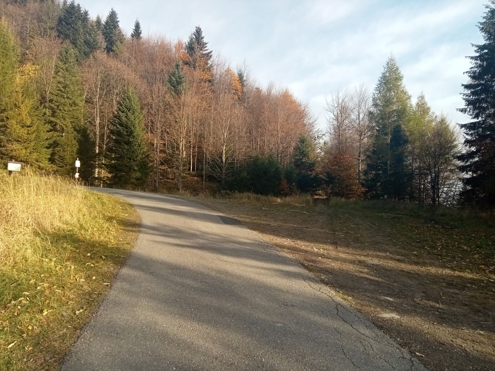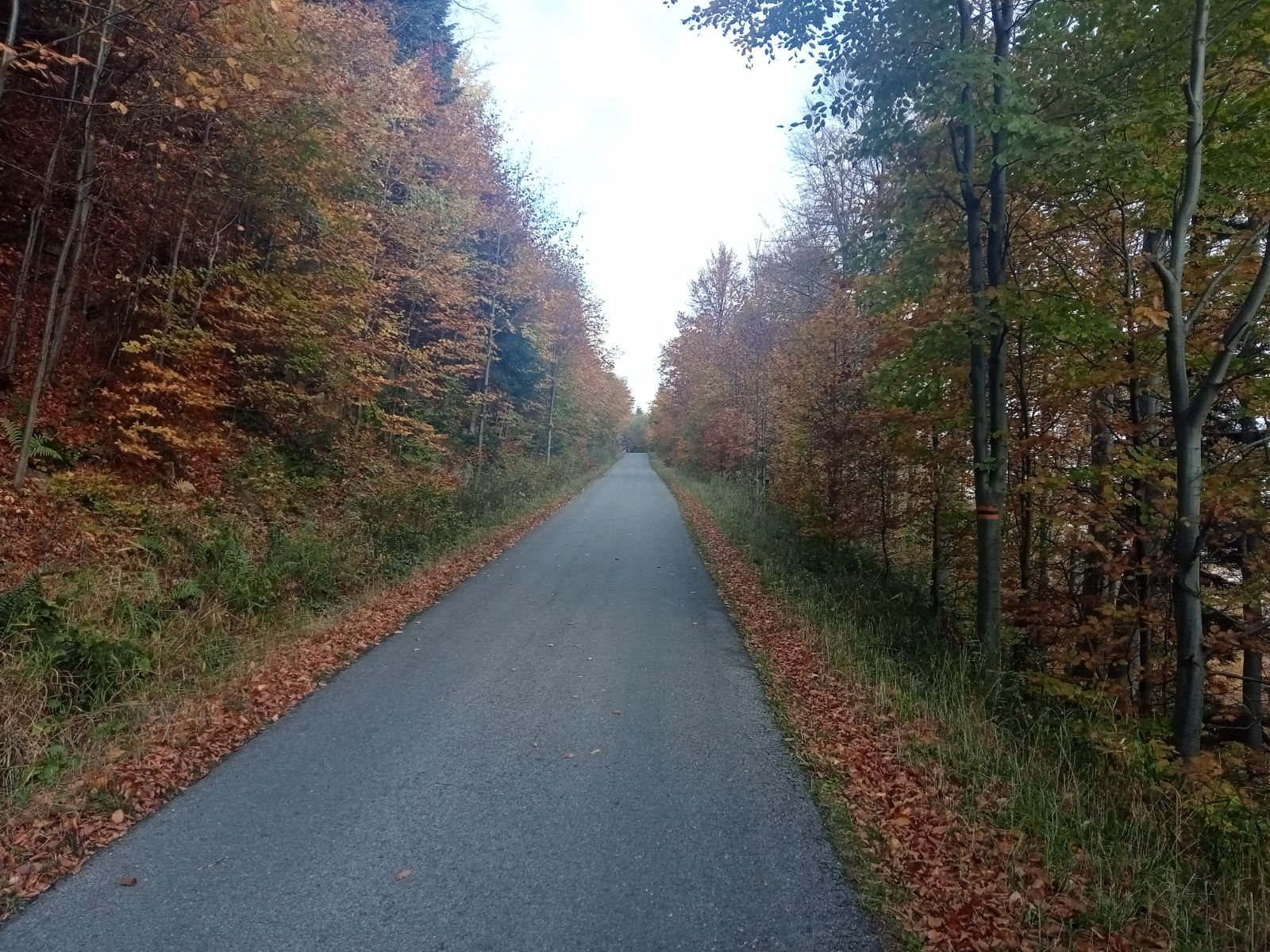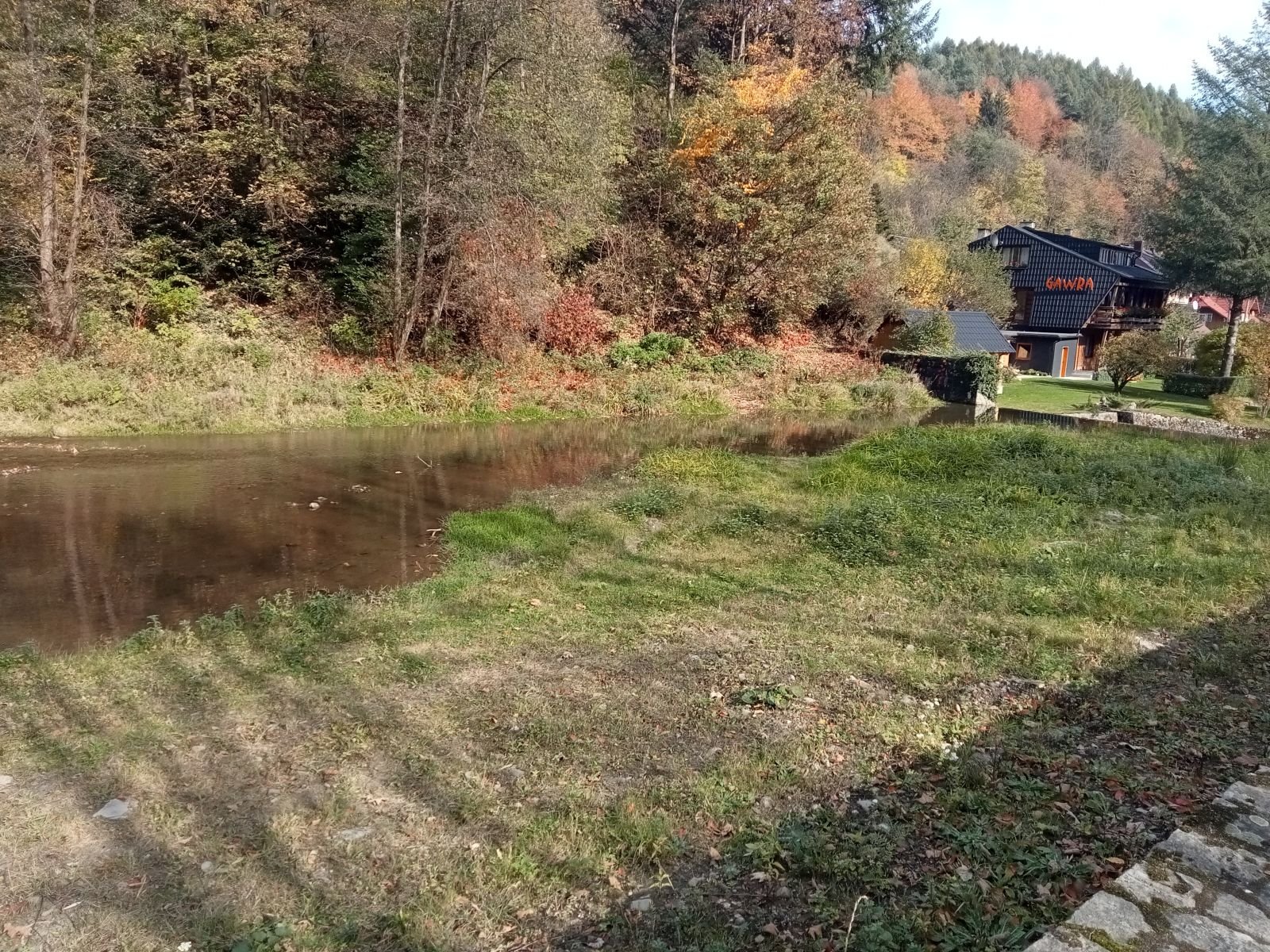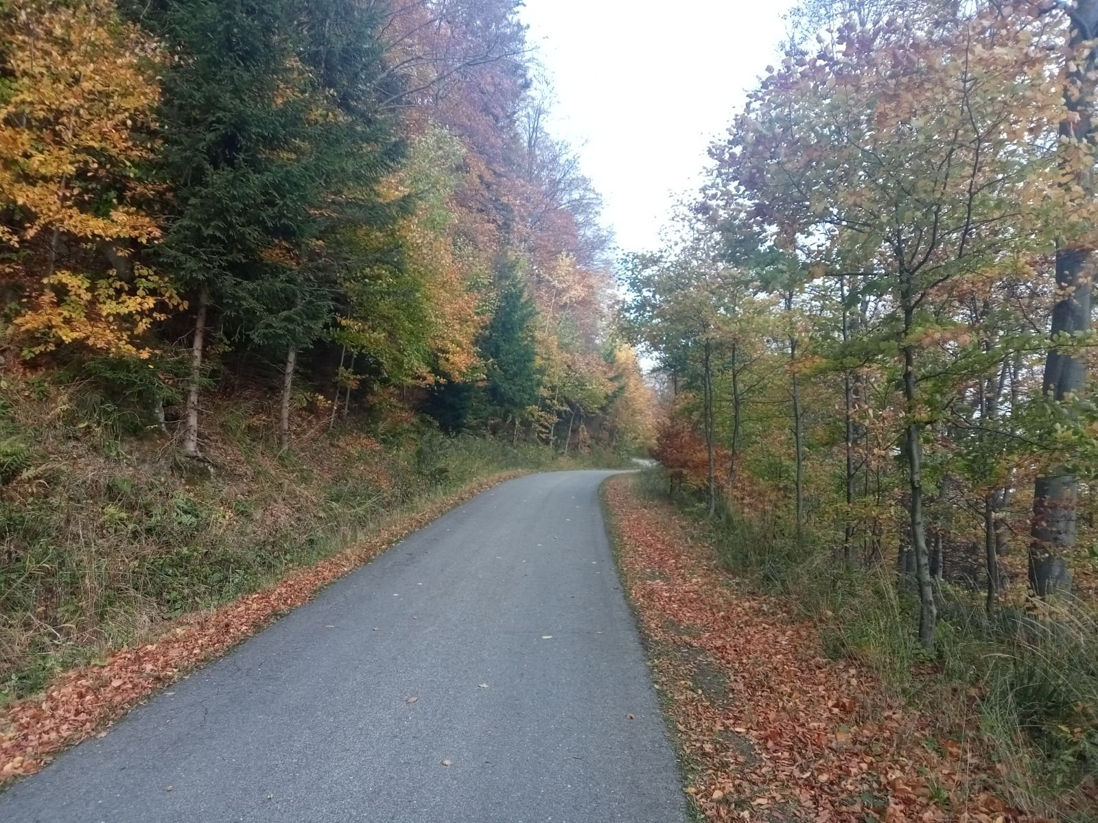 Dojście do Przehyby oznaczone jest na czarno, ten odcinek był przez nas sporo razy opisywany. Ładnie ten teren wygląda jesienią, trzeba to przyznać! Potok Jaworzynka widoczny na poniższym zdjęciu towarzyszy nam przez kolejne kilometry. Już po chwili wędrówki spotykamy pierwszego rowerzystę zjeżdżającego z góry z latarką czołową umieszczoną oczywiście na głowie, ciekawe o której zaczął swoją nocną trasę.