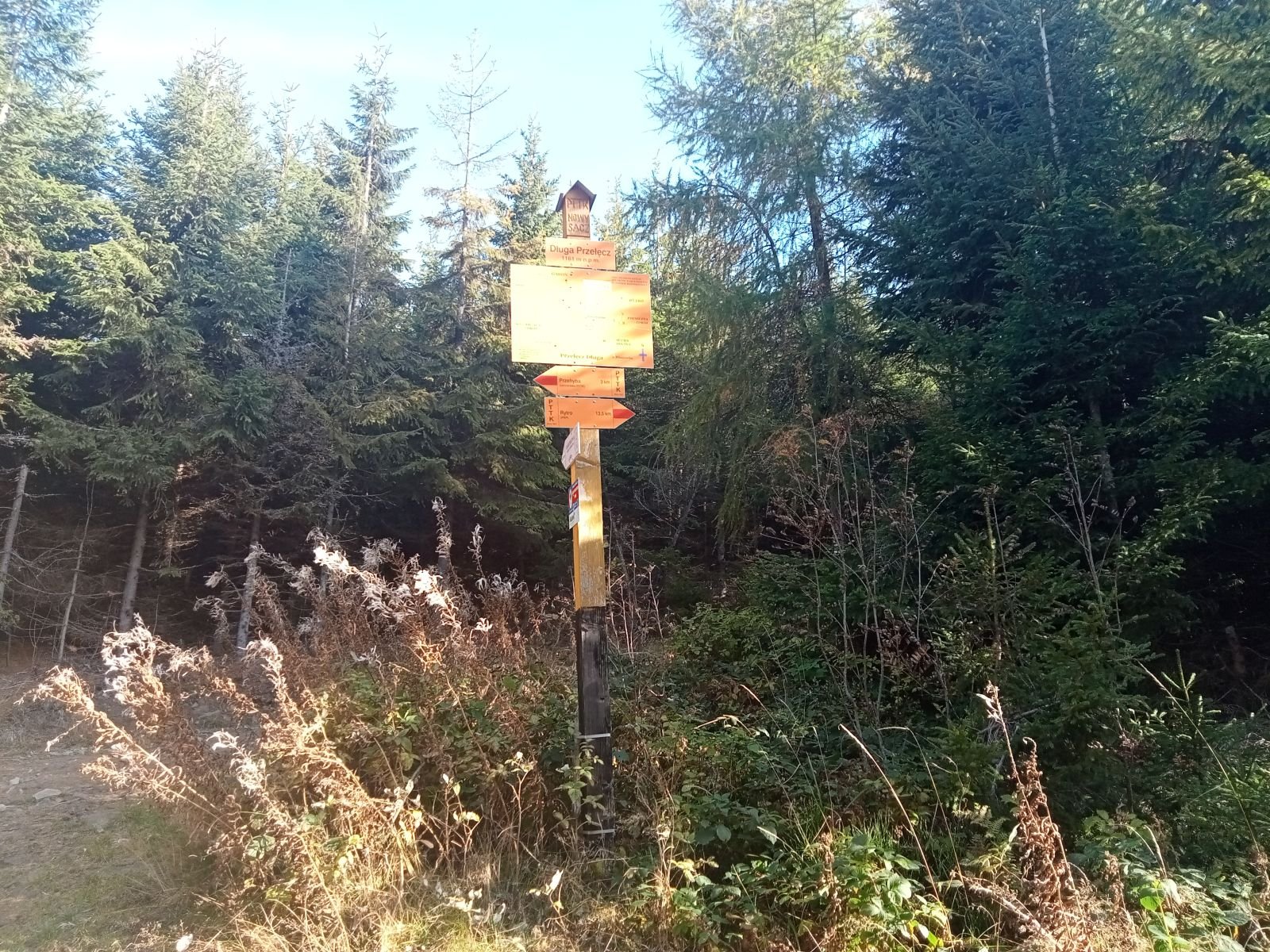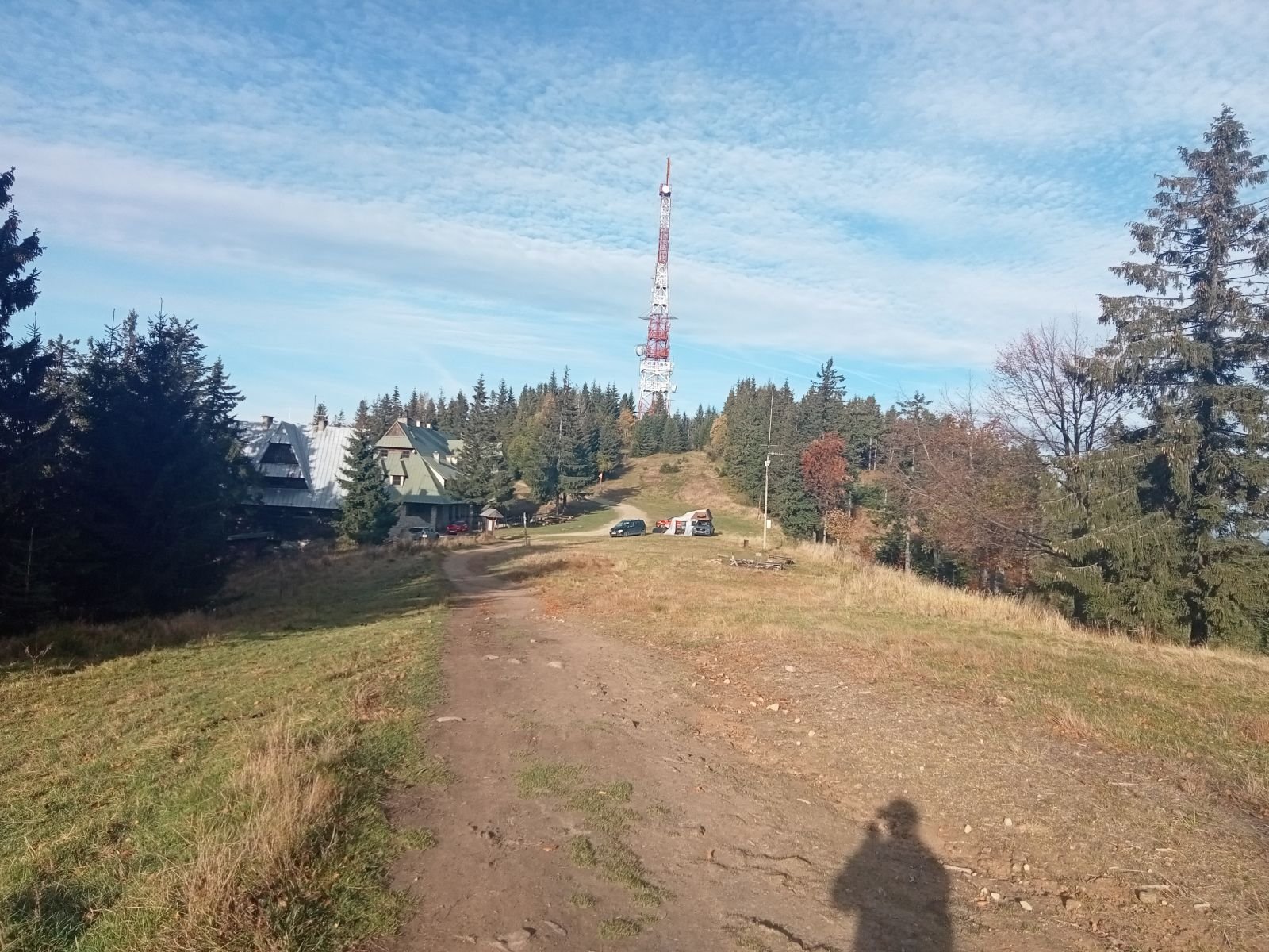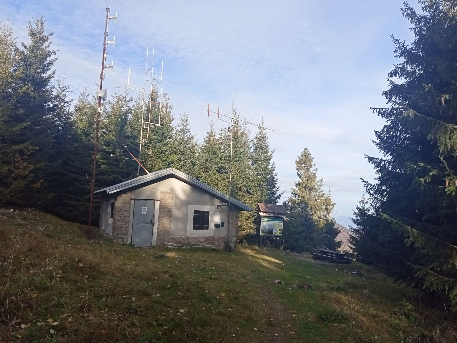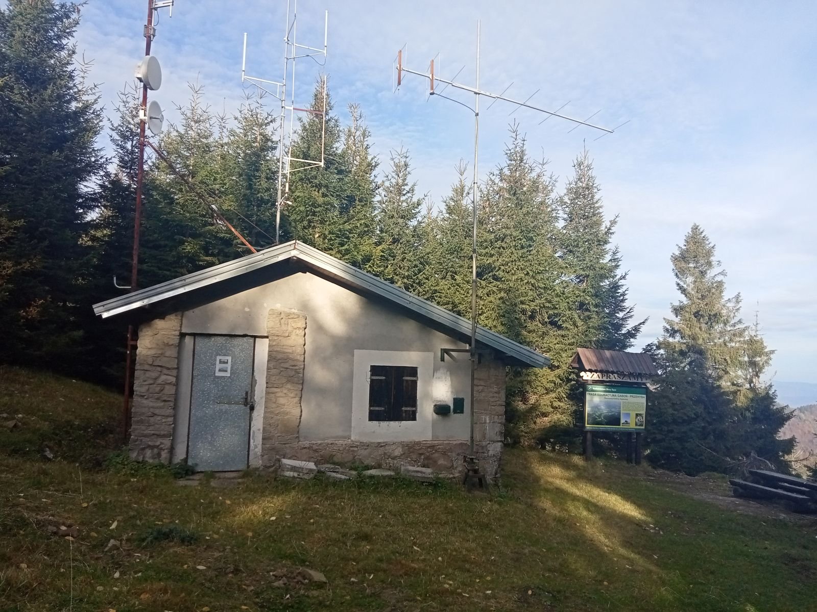 Widok z platformy widokowej na Przehybie w kierunku Starego Sącza. Jak widać nic prawie nie widać - zarosło. Jest miejsce na ognisko ale nie ma tu klimatu do posiadówki. Miejsce chyba zapomniane, choć swego czasu mówiono o planie wykonania tu wieży czy też platformy widokowej. Obok znajduję się nadajnik telewizyjny, który bardzo dobrze jest widoczny z dołu. W schronisku już o 9:00 sporo osób.
