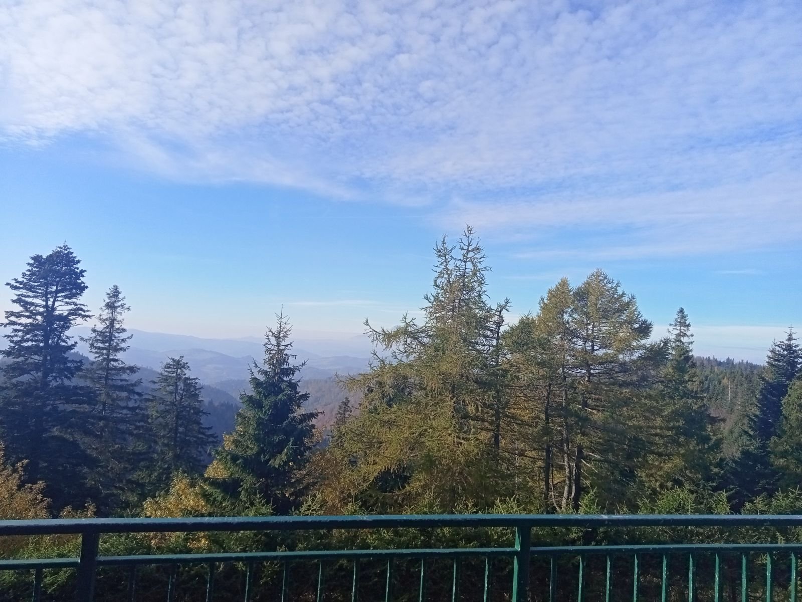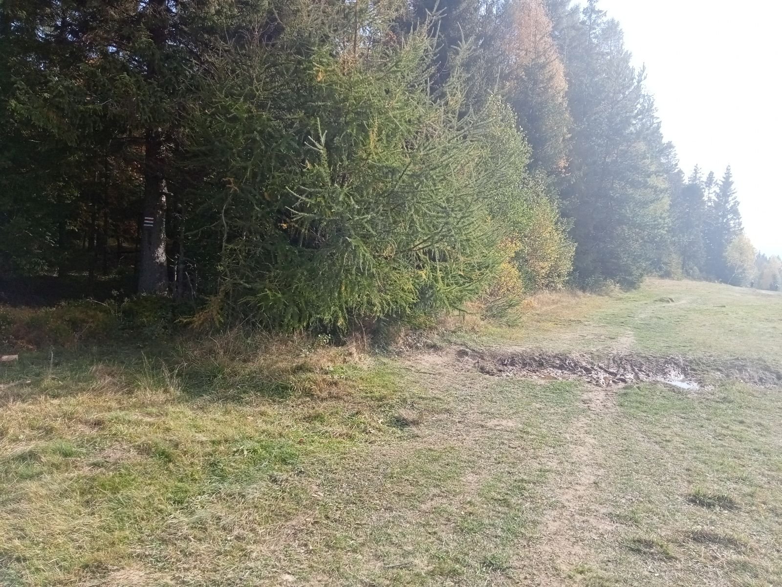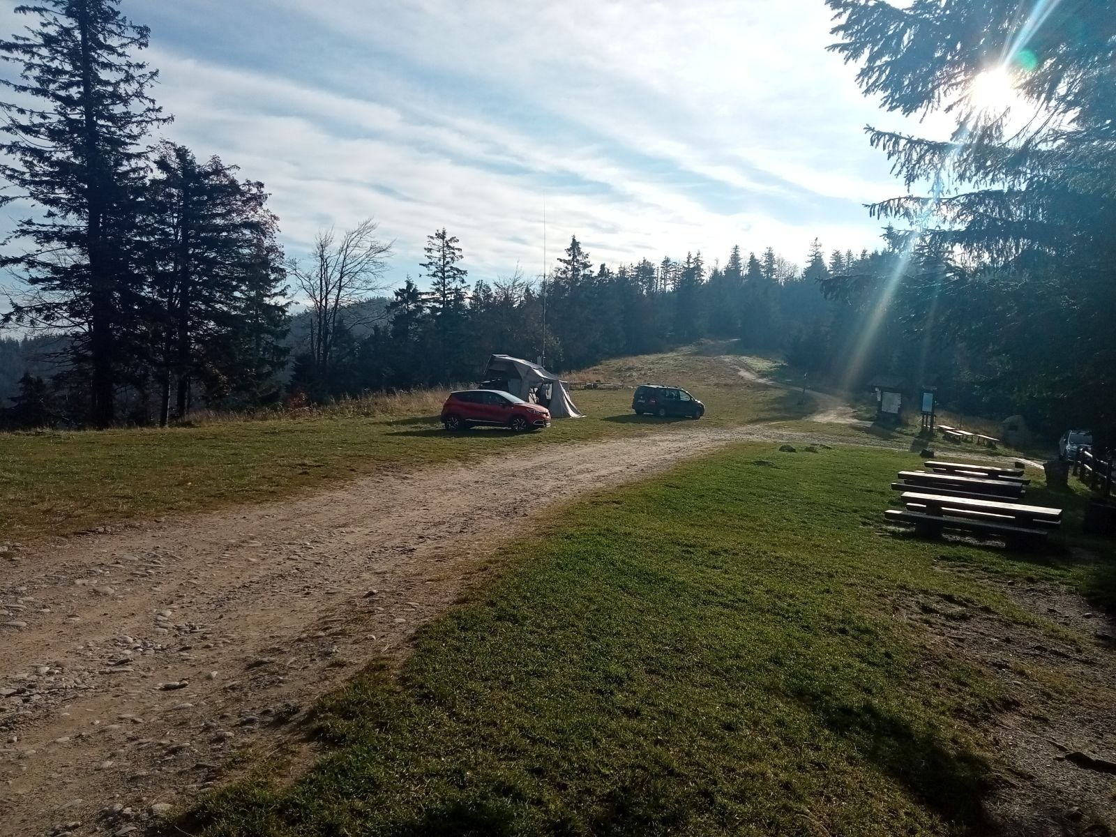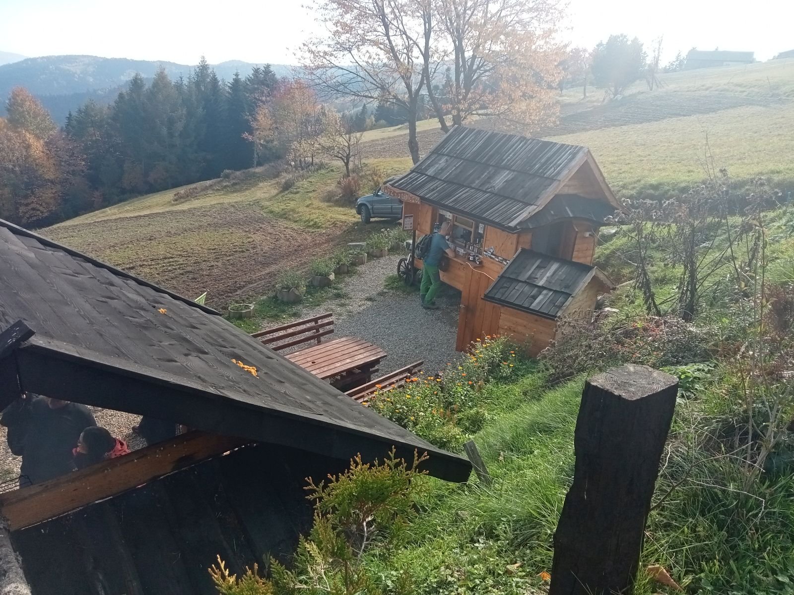 Widok z platformy widokowej na Przehybie w kierunku Starego Sącza. Jak widać nic prawie nie widać - zarosło. Jest miejsce na ognisko ale nie ma tu klimatu do posiadówki. Miejsce chyba zapomniane, choć swego czasu mówiono o planie wykonania tu wieży czy też platformy widokowej. Obok znajduję się nadajnik telewizyjny, który bardzo dobrze jest widoczny z dołu. W schronisku już o 9:00 sporo osób.
