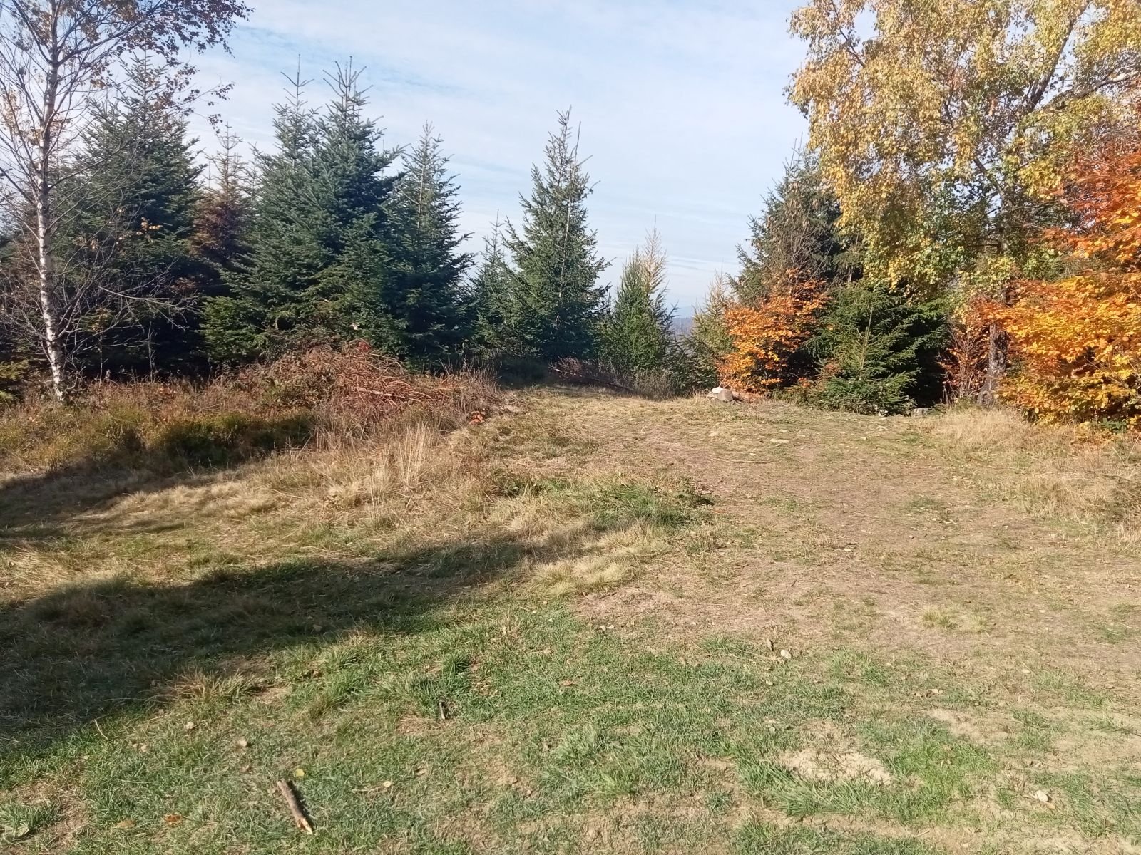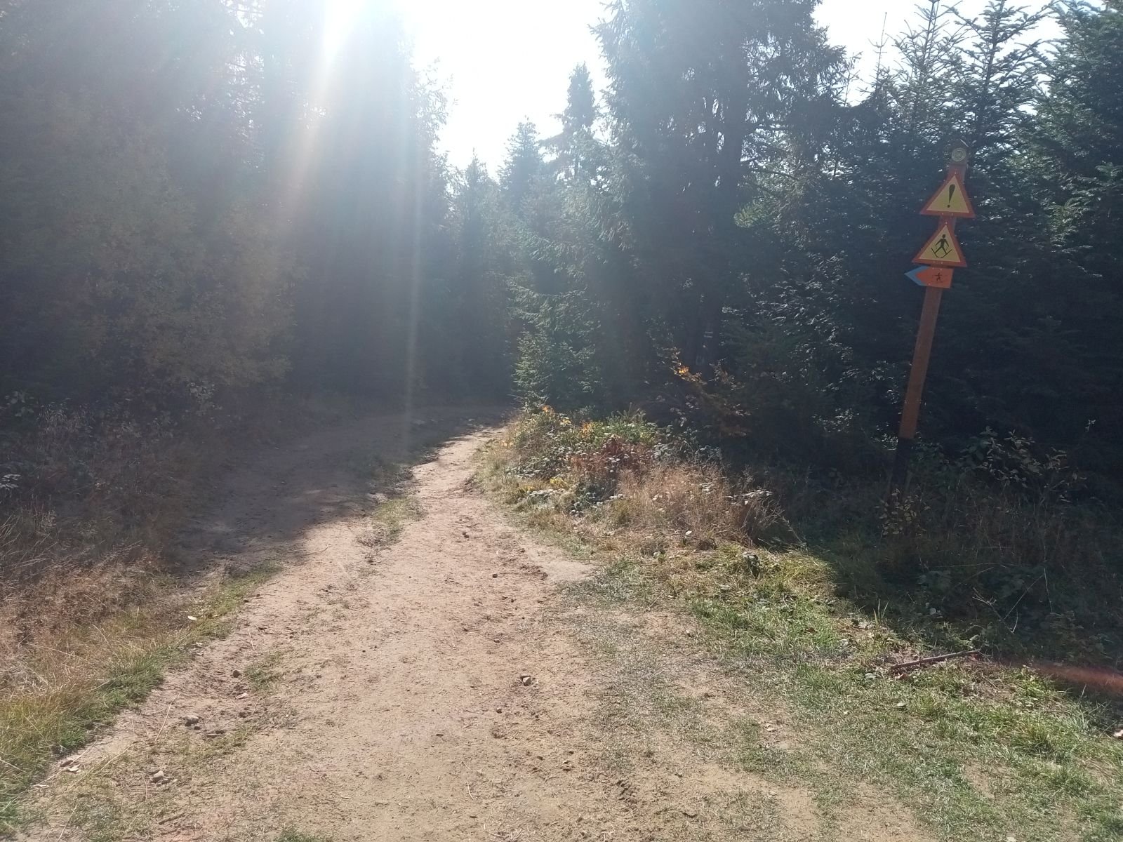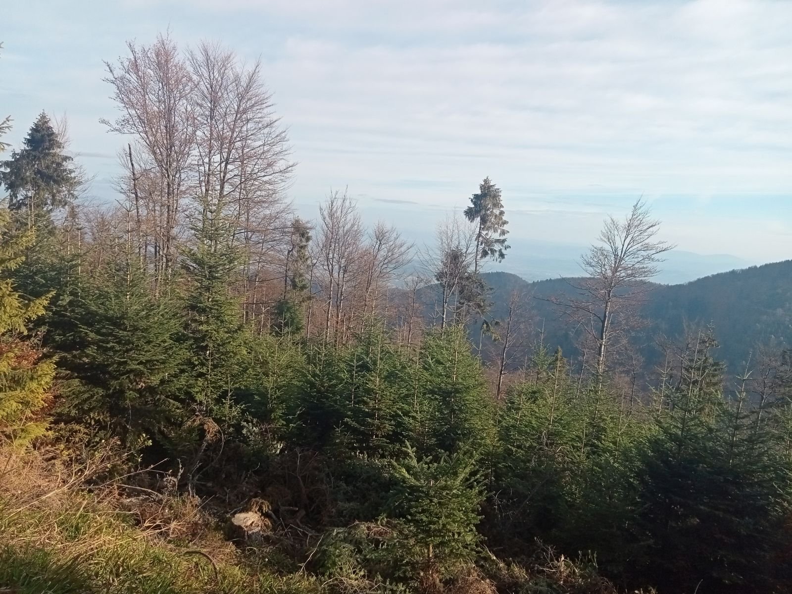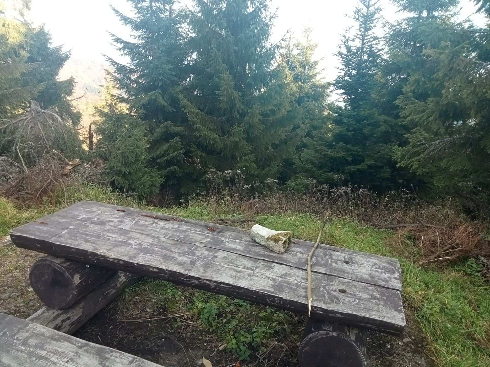 Widok z platformy widokowej na Przehybie w kierunku Starego Sącza. Jak widać nic prawie nie widać - zarosło. Jest miejsce na ognisko ale nie ma tu klimatu do posiadówki. Miejsce chyba zapomniane, choć swego czasu mówiono o planie wykonania tu wieży czy też platformy widokowej. Obok znajduję się nadajnik telewizyjny, który bardzo dobrze jest widoczny z dołu. W schronisku już o 9:00 sporo osób.