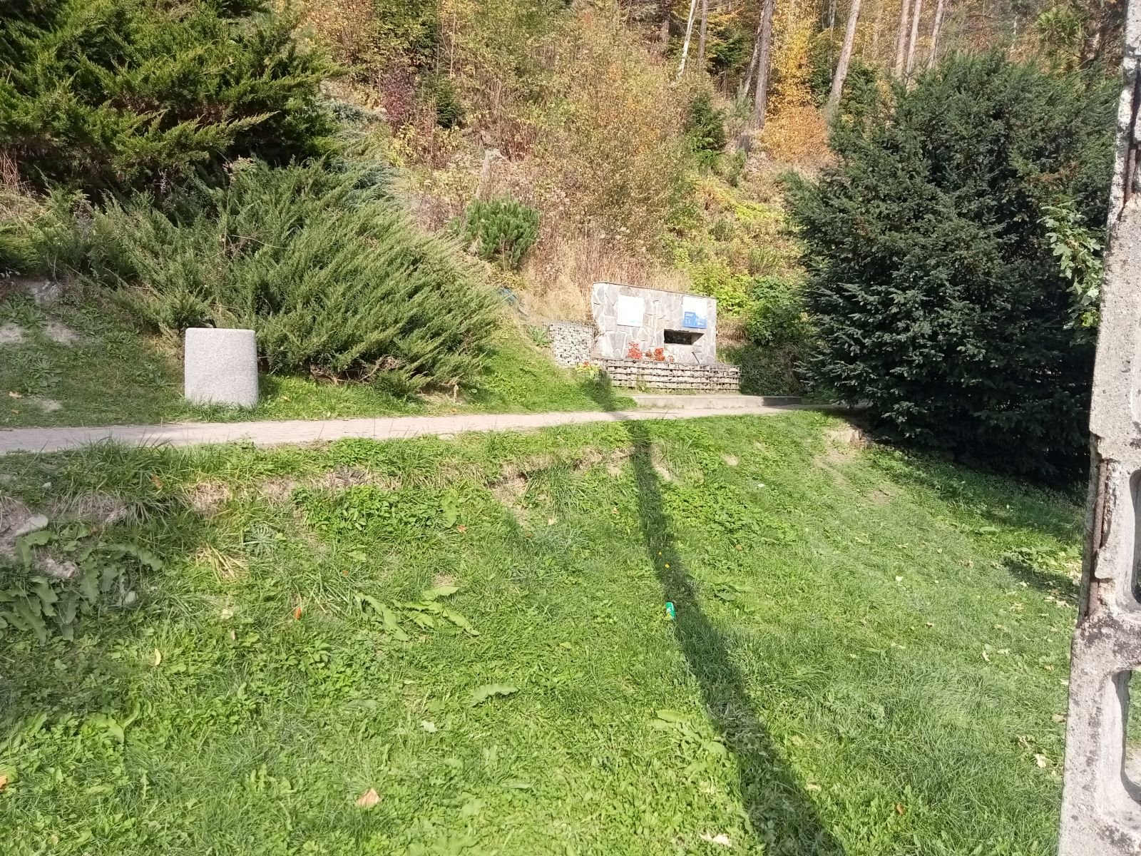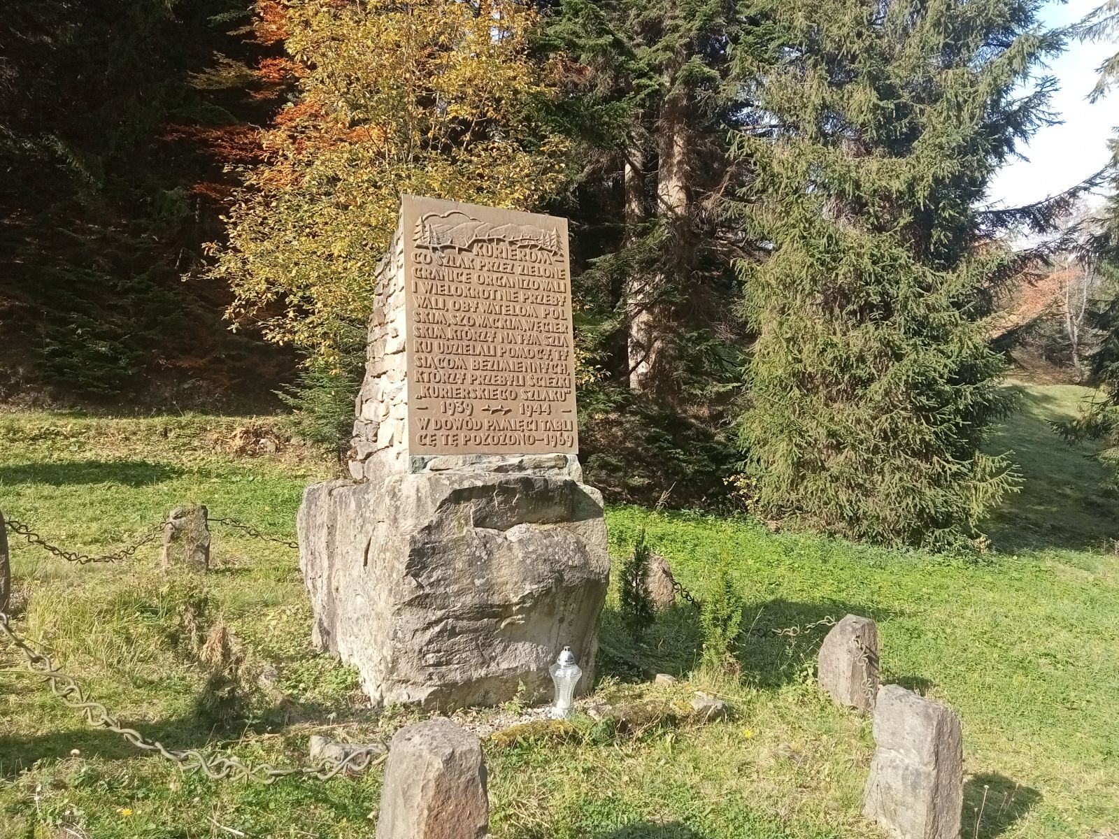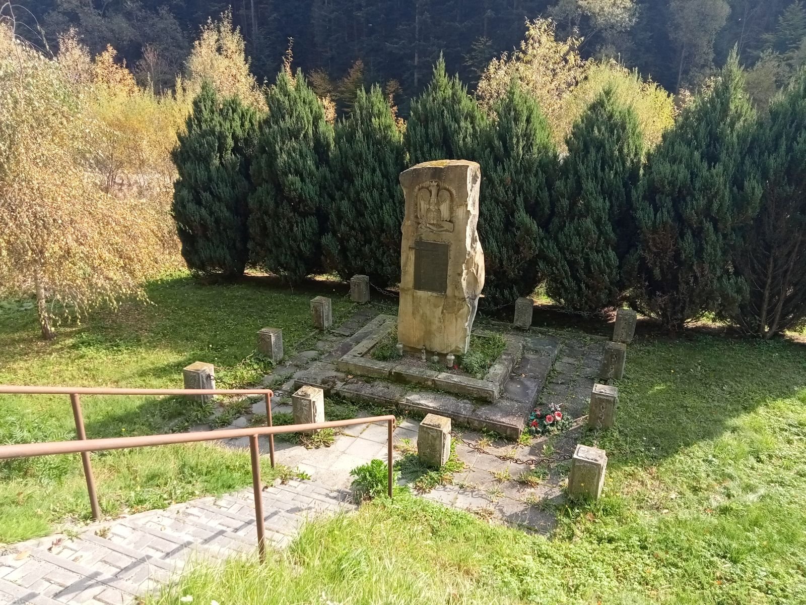 Sucha Dolina - Pomnik upamiętniający kurierów, łączników i przewodników. Przechodzili oni tędy na Słowację, przekraczając granicę w rejonie Obidzy i Eliaszówki. Mijamy kościół w Kosarzyskach i szukamy wodospadu. Cały czas idziemy bulwarem spacerowym.