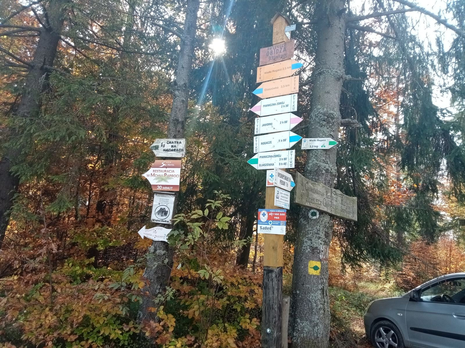Piwniczna Zdój Rynek, bardzo ładnie prezentuje się w jesiennej odsłonie, turystów sporo, jak zwykle zajęty cały parking na rynku. Trasa bardzo fajna także dla osób, które po górach mało co chodzą. Nawet końcowe kilometry po nielubianym betonie przez Obidzę/Kosarzyska/Piwniczną ze względu na miłe widoki były do wytrzymania. Spore wrażenie na plus to Kosarzyska! i zakończenie w uroczej pijalni! Poniżej pełna galeria zdjęć z wycieczki.
