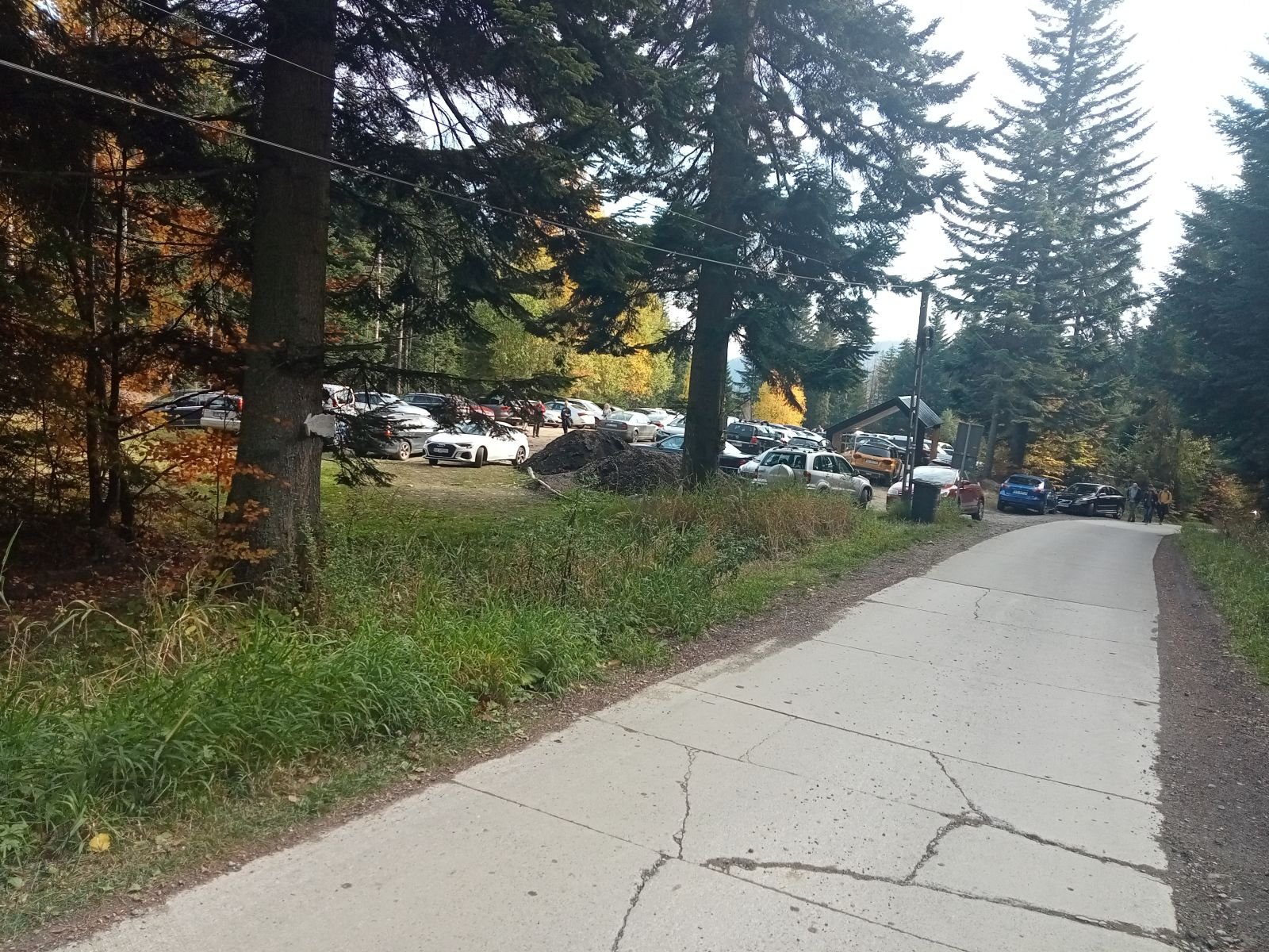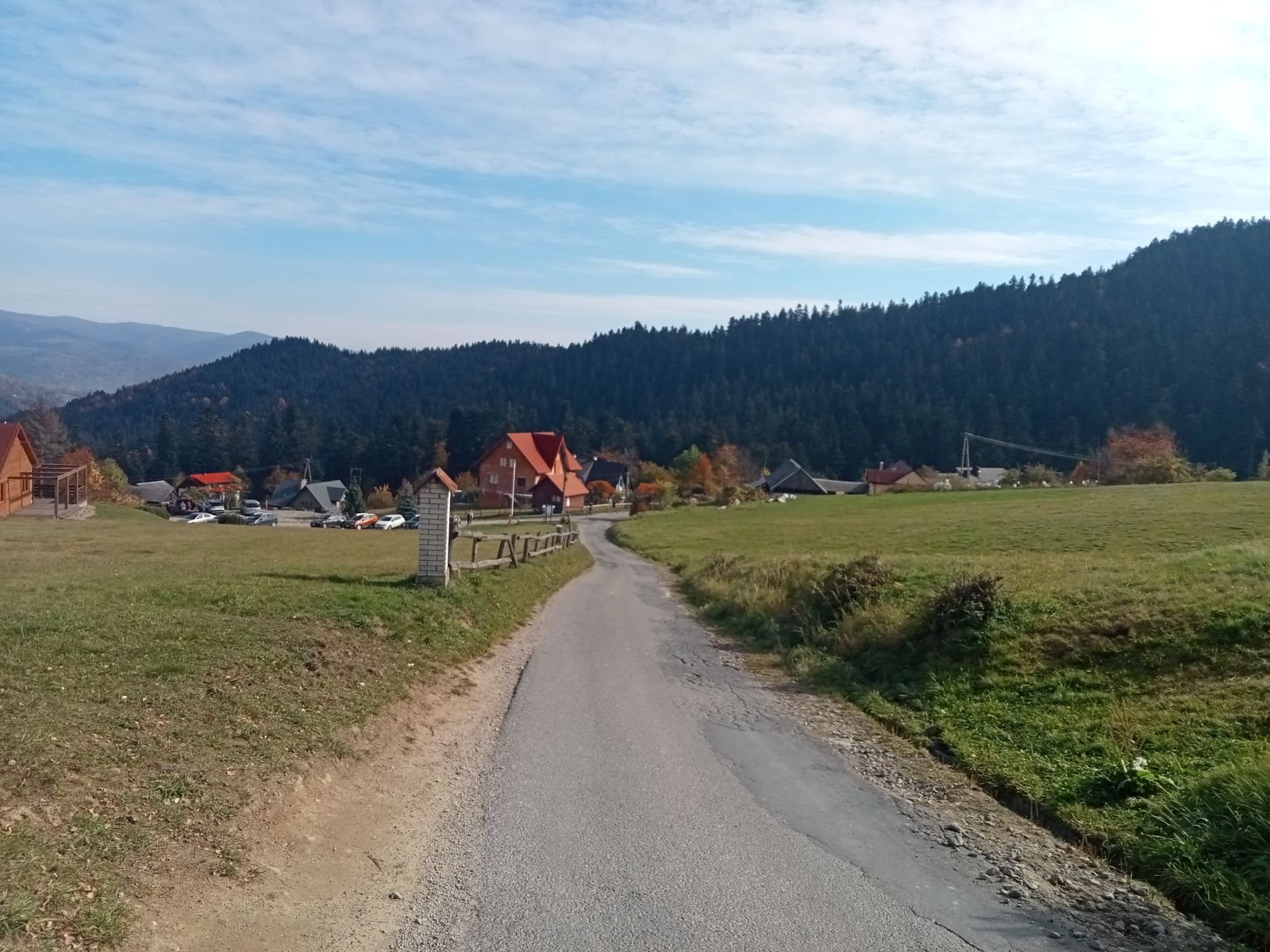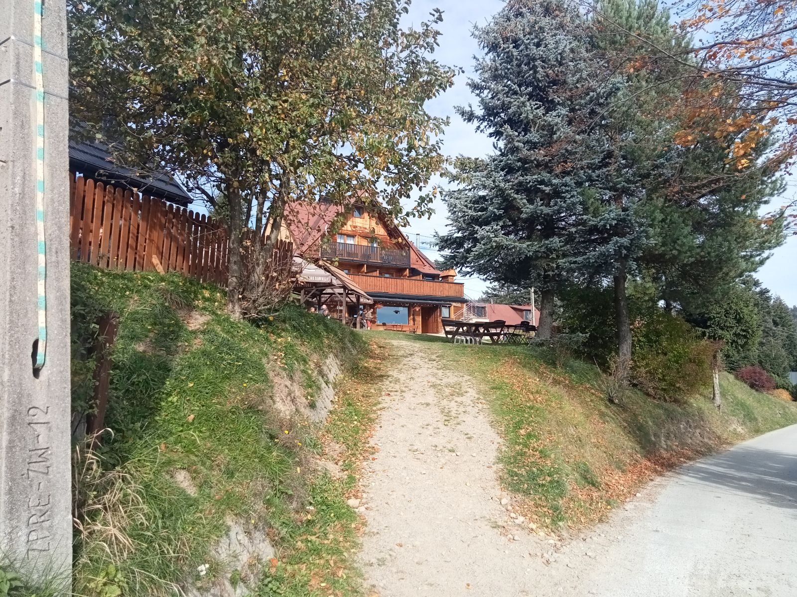 Schodzimy betonową drogę na Obidzę, na zdjęciu tego nie widać, ale sporo osób mijamy po drodze. Po lewej stronie Bacówka w Obidzy. Niestety czas oczekiwania na danie ze względu na duża liczbę turystów - zbyt długi, idziemy dalej.