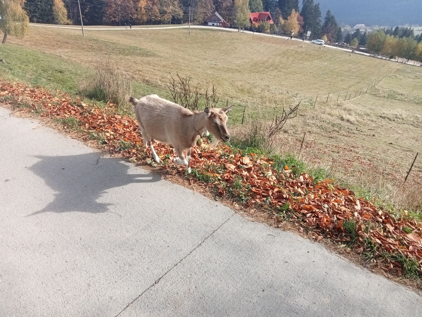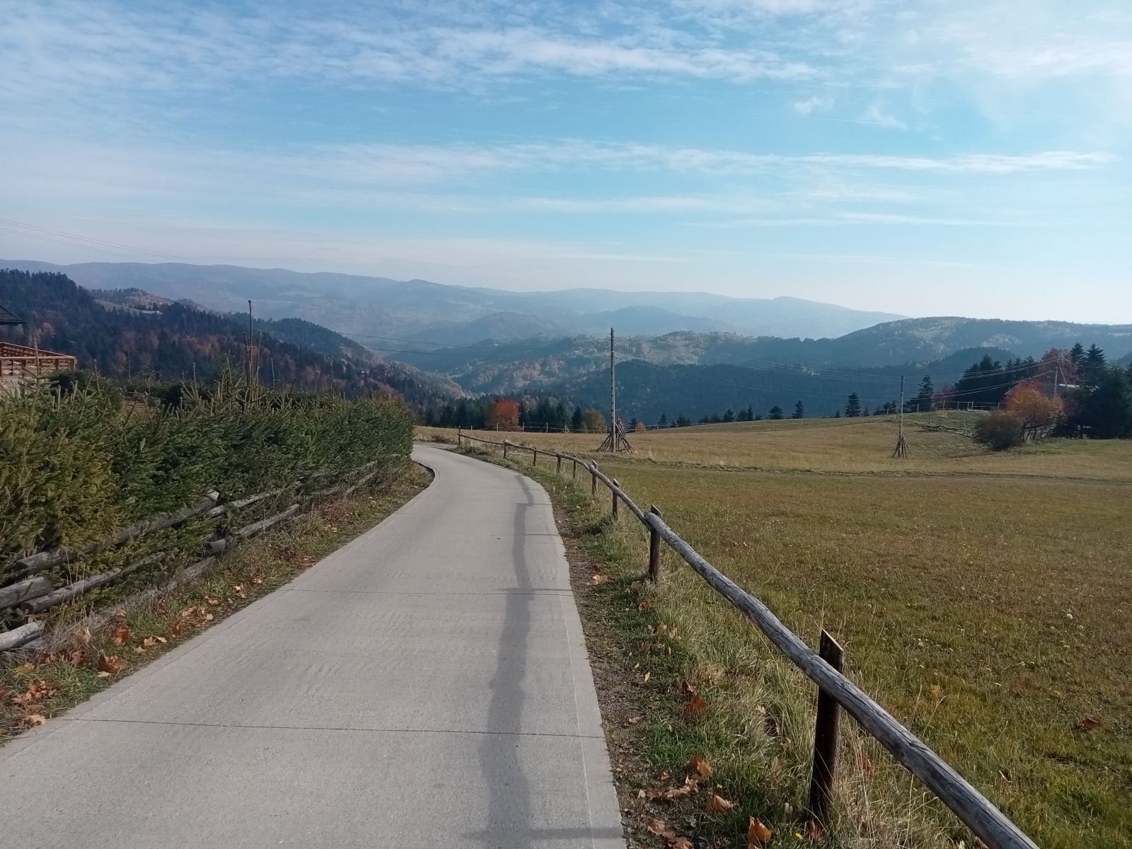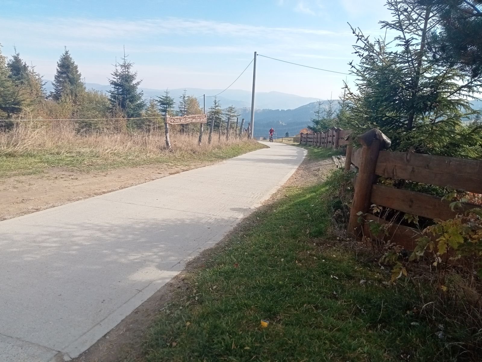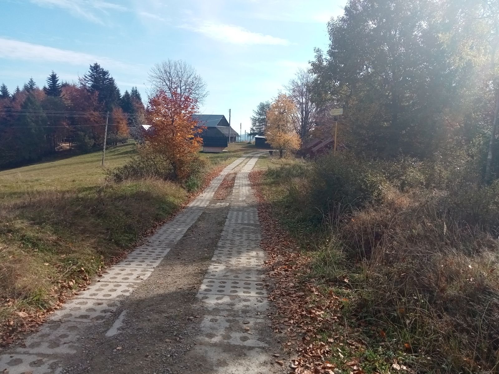 Schodzimy betonową drogę na Obidzę, na zdjęciu tego nie widać, ale sporo osób mijamy po drodze. Po lewej stronie Bacówka w Obidzy. Niestety czas oczekiwania na danie ze względu na duża liczbę turystów - zbyt długi, idziemy dalej.