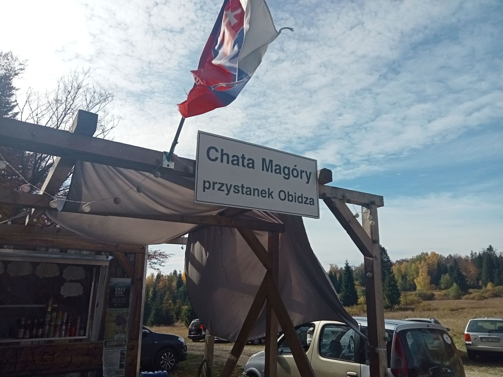 Chata Magóry przystanek Obidza. Można cos tu dobrego zjeść, napić się, czy też zorganizować ognisko. Mijamy Przełęcz Gromadzką i kierujemy się do Obidzy.