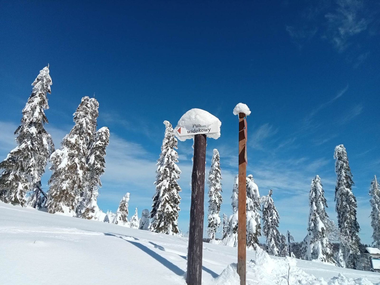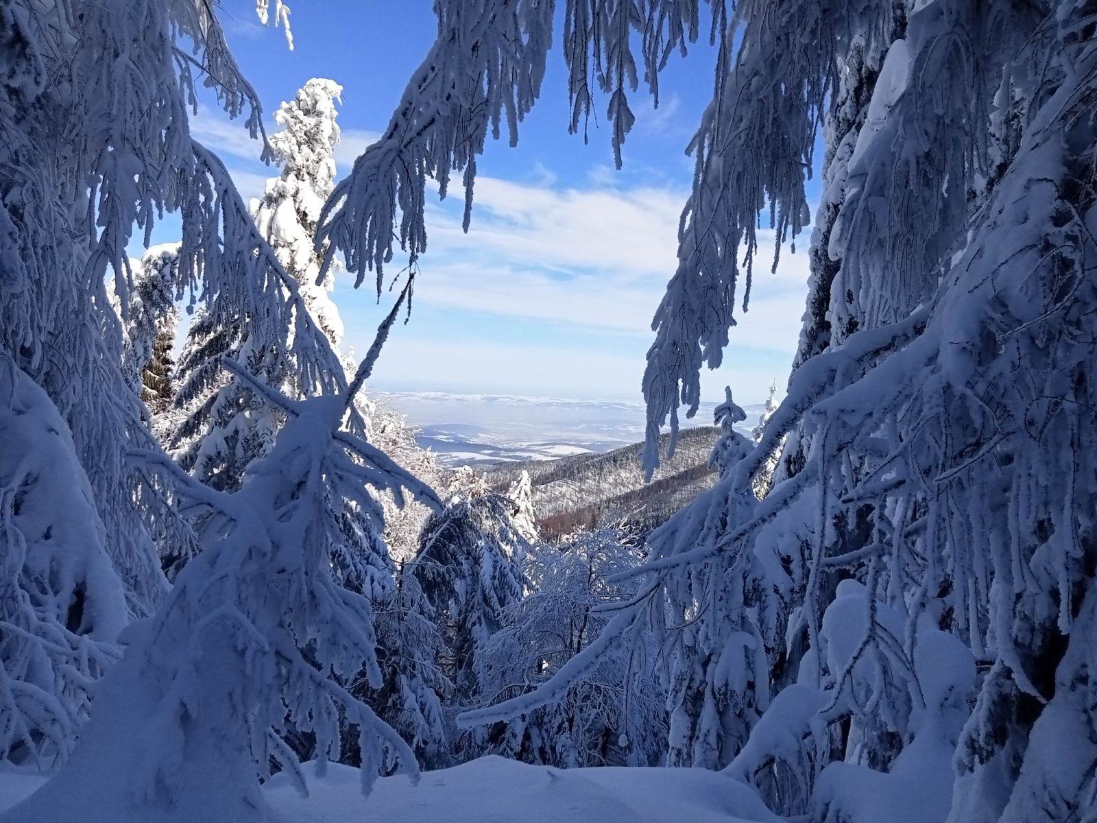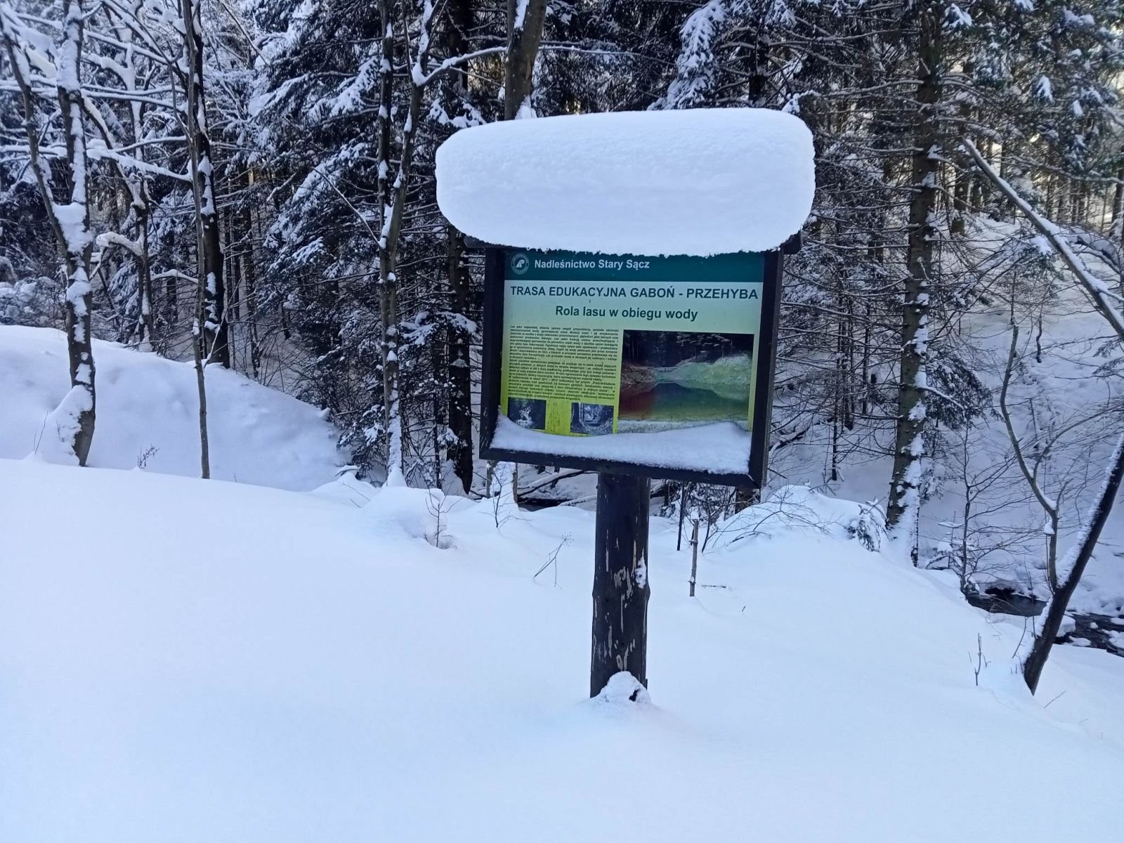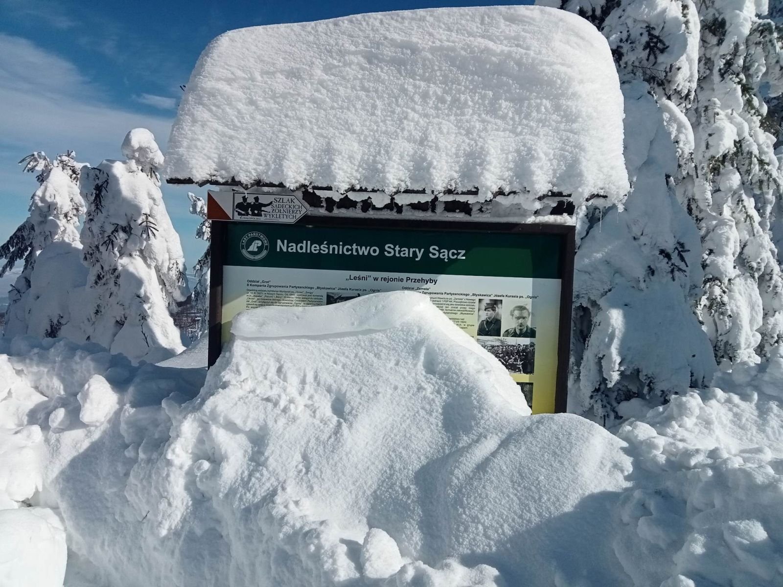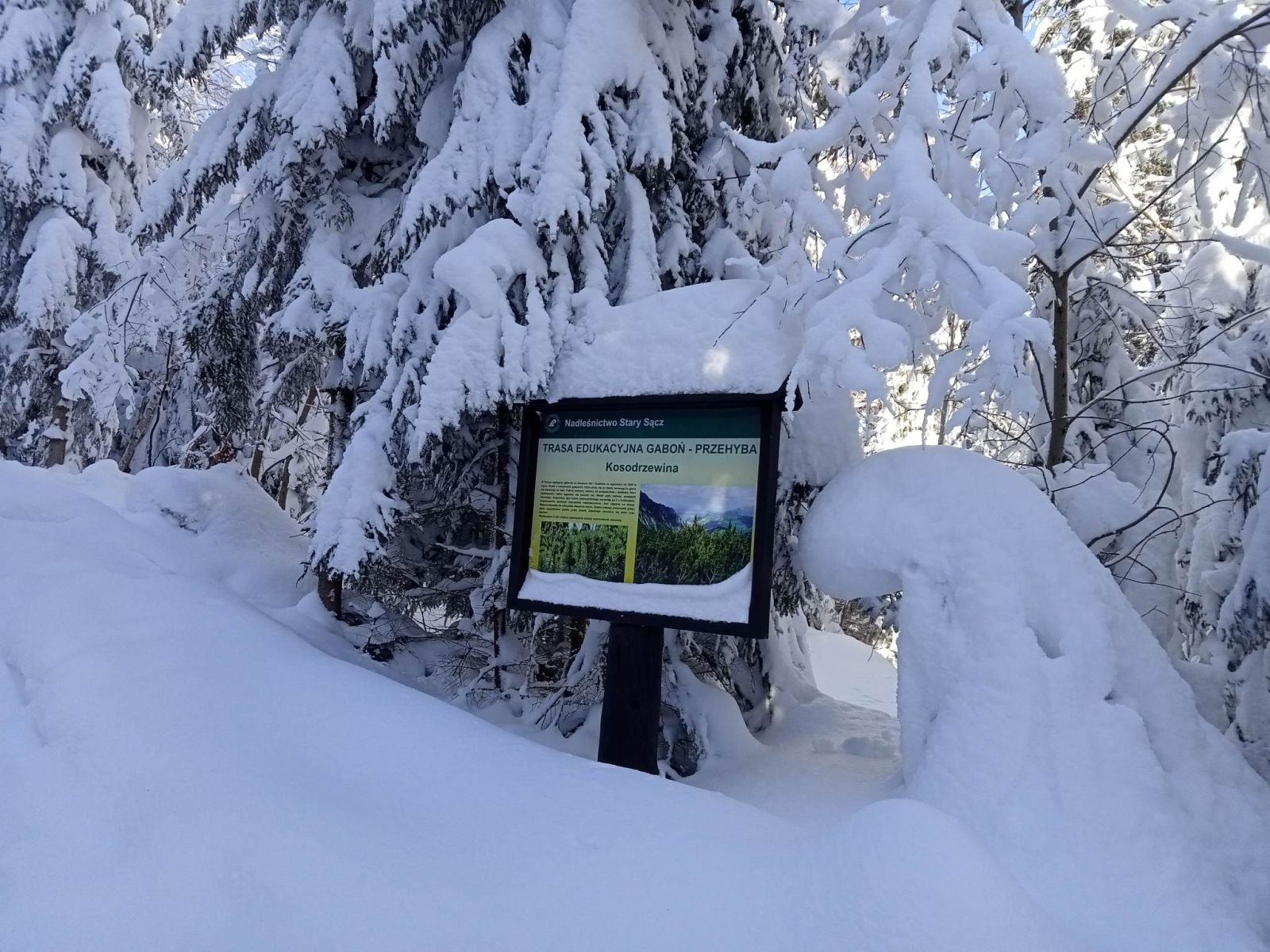 Trasa z Gabonia do Przehyby była przez nas pokonywana wiele razy, zresztą każdy sezon zaczynamy od tego podejścia. W zimie wygląda ona całkiem inaczej niż w sezonie wiosna-lato-jesień, po prostu jakby to było całkiem inne miejsce. Od kilku tygodni nie było w pełni pogodnego dnia i prognozy sprawiały, że zdecydowaliśmy się pierwszy raz wybrać w góry zimą. Na ten sam pomysł wpadli inni turyści i dziesiątki samochodów zapełniły nie tylko parking, ale okolice przystanku w Gaboniu. Tak wielu turystów na tym szlaku nie widzieliśmy jeszcze - nawet przy wysypie grzybów, a ten wśród grzybiarzy jest niezwykle ceniony. Czas ferii zrobił tez swoje, ostatnio Przehyba też przewijała się w mediach co też przypomniało ludziom o tej trasie. temperatura około -12 i pomimo bezchmurnego nieba miejsc gdzie towarzyszy nam słońce - wielu nie ma. Droga do schroniska jest lepiej utrzymana niż nie jeden dojazd w niektórych przysiółkach. Z tego co się dowiedzieliśmy droga w razie potrzeby jest odśnieżana raz dziennie! To nie jest tak, że idziemy po kolana w śniegu, zresztą widać to po zdjęciach. Jest to jedyny szlak w takim stanie, reszta jak czerwony czy zielony do Jazowska jest nieprzetarty śniegu "po pachy". Oczywiście jeżeli są bardzo duże opady warto się wstrzymać z wyjściem - tu zagrożenie ze strony drzew, które mogą opaść na drogę. Warto słuchać aktualnych komunikatów - ostrzeżeń pogodowych. Wyjście na Przehybę zajęło nam niecałe dwie godziny, w schronisku także sporo osób, chwila odpoczynku przy gorącym napoju. Z powrotem bardzo fajnie po śniegu się schodzi, po około 1:30h jesteśmy już z powrotem na parkingu.