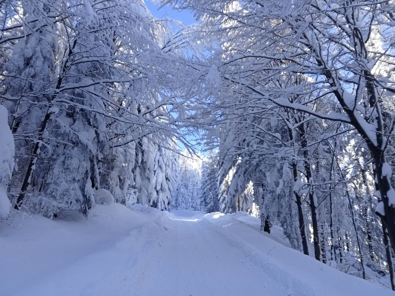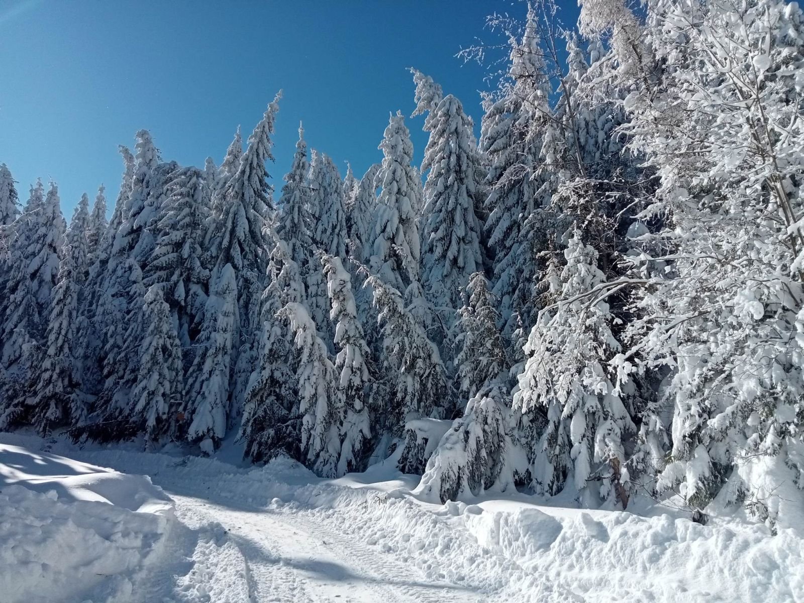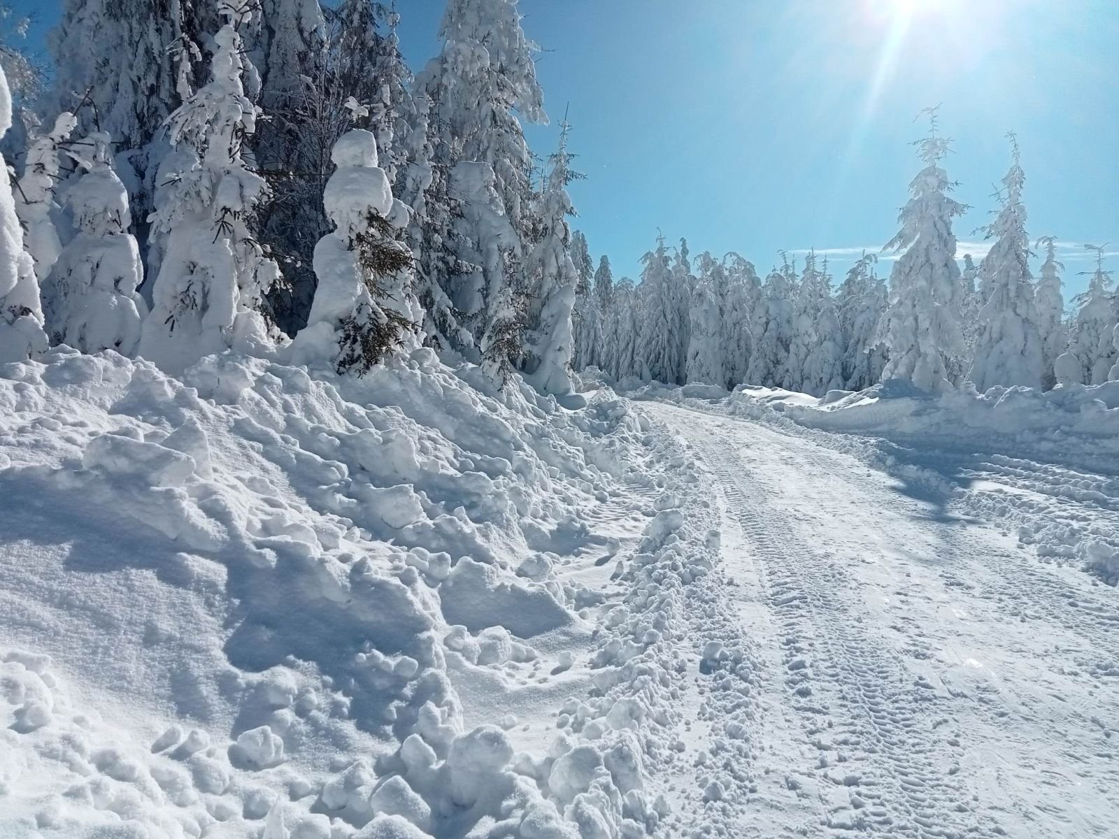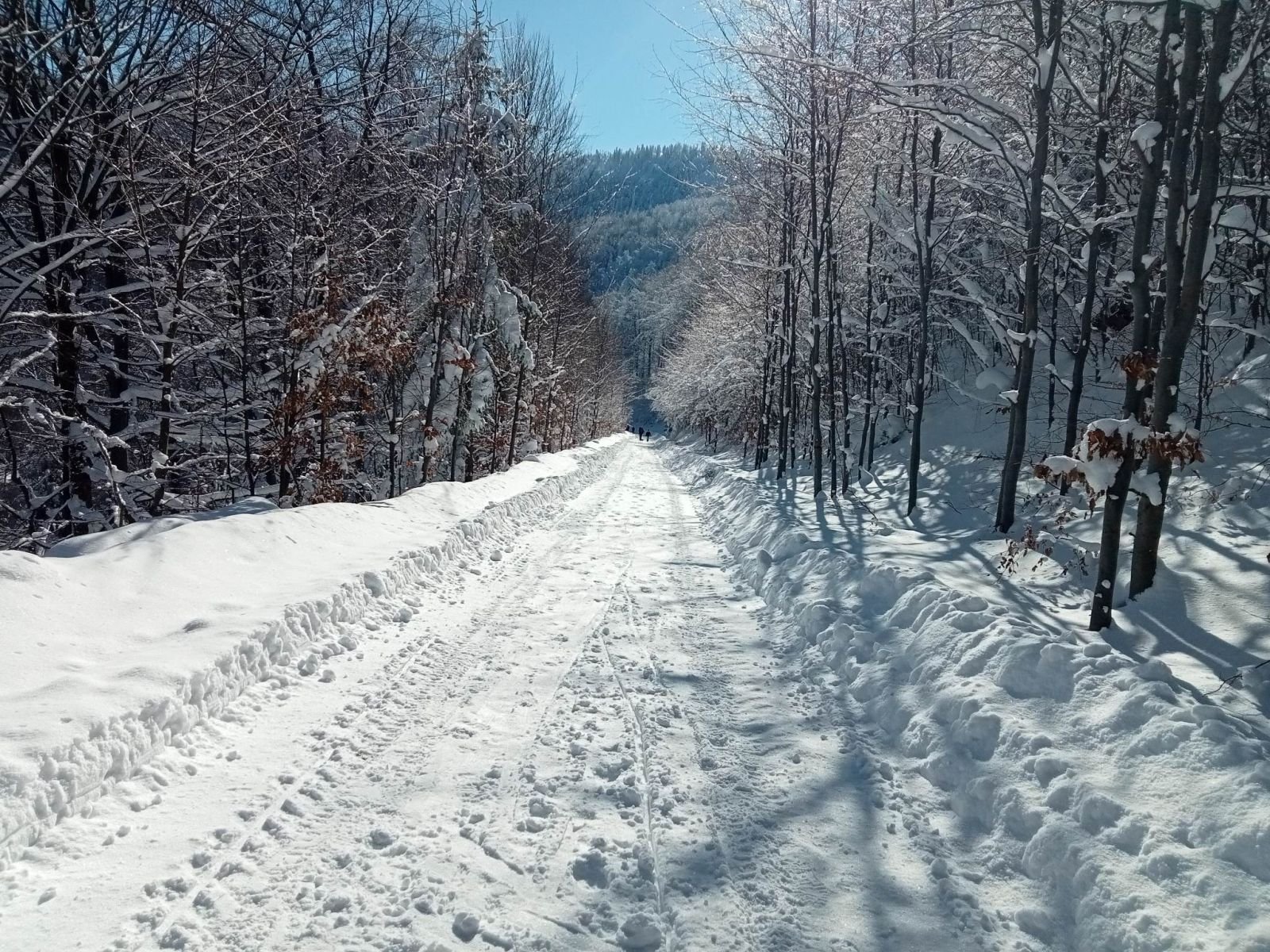 Trasa z Gabonia do Przehyby była przez nas pokonywana wiele razy, zresztą każdy sezon zaczynamy od tego podejścia. W zimie wygląda ona całkiem inaczej niż w sezonie wiosna-lato-jesień, po prostu jakby to było całkiem inne miejsce. Od kilku tygodni nie było w pełni pogodnego dnia i prognozy sprawiały, że zdecydowaliśmy się pierwszy raz wybrać w góry zimą. Na ten sam pomysł wpadli inni turyści i dziesiątki samochodów zapełniły nie tylko parking, ale okolice przystanku w Gaboniu. Tak wielu turystów na tym szlaku nie widzieliśmy jeszcze - nawet przy wysypie grzybów, a ten wśród grzybiarzy jest niezwykle ceniony. Czas ferii zrobił tez swoje, ostatnio Przehyba też przewijała się w mediach co też przypomniało ludziom o tej trasie. temperatura około -12 i pomimo bezchmurnego nieba miejsc gdzie towarzyszy nam słońce - wielu nie ma. Droga do schroniska jest lepiej utrzymana niż nie jeden dojazd w niektórych przysiółkach. Z tego co się dowiedzieliśmy droga w razie potrzeby jest odśnieżana raz dziennie! To nie jest tak, że idziemy po kolana w śniegu, zresztą widać to po zdjęciach. Jest to jedyny szlak w takim stanie, reszta jak czerwony czy zielony do Jazowska jest nieprzetarty śniegu "po pachy". Oczywiście jeżeli są bardzo duże opady warto się wstrzymać z wyjściem - tu zagrożenie ze strony drzew, które mogą opaść na drogę. Warto słuchać aktualnych komunikatów - ostrzeżeń pogodowych. Wyjście na Przehybę zajęło nam niecałe dwie godziny, w schronisku także sporo osób, chwila odpoczynku przy gorącym napoju. Z powrotem bardzo fajnie po śniegu się schodzi, po około 1:30h jesteśmy już z powrotem na parkingu.
