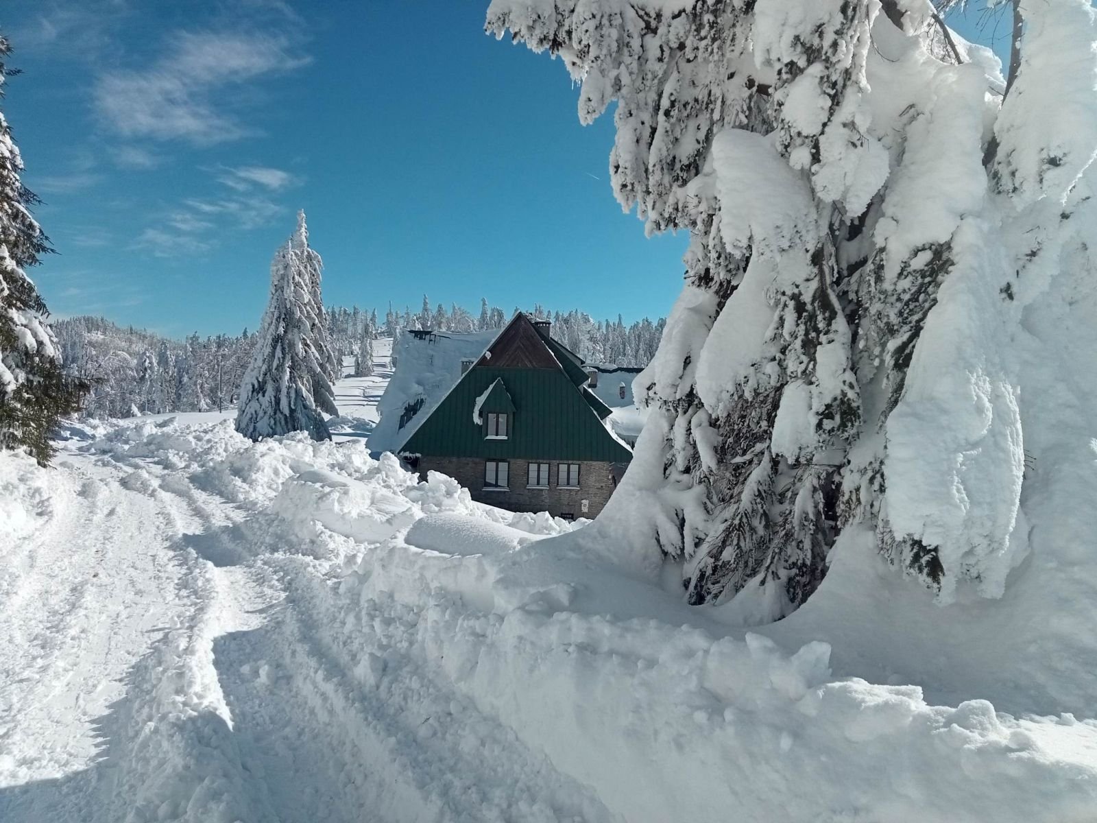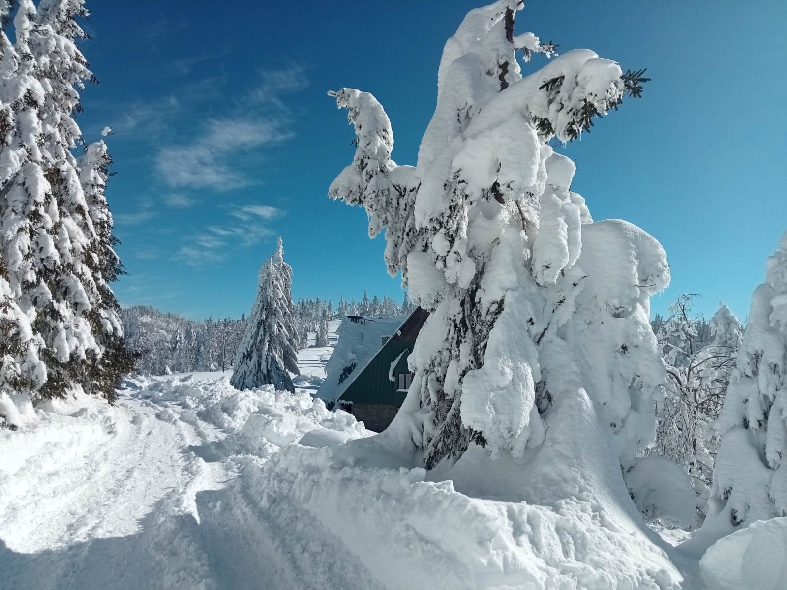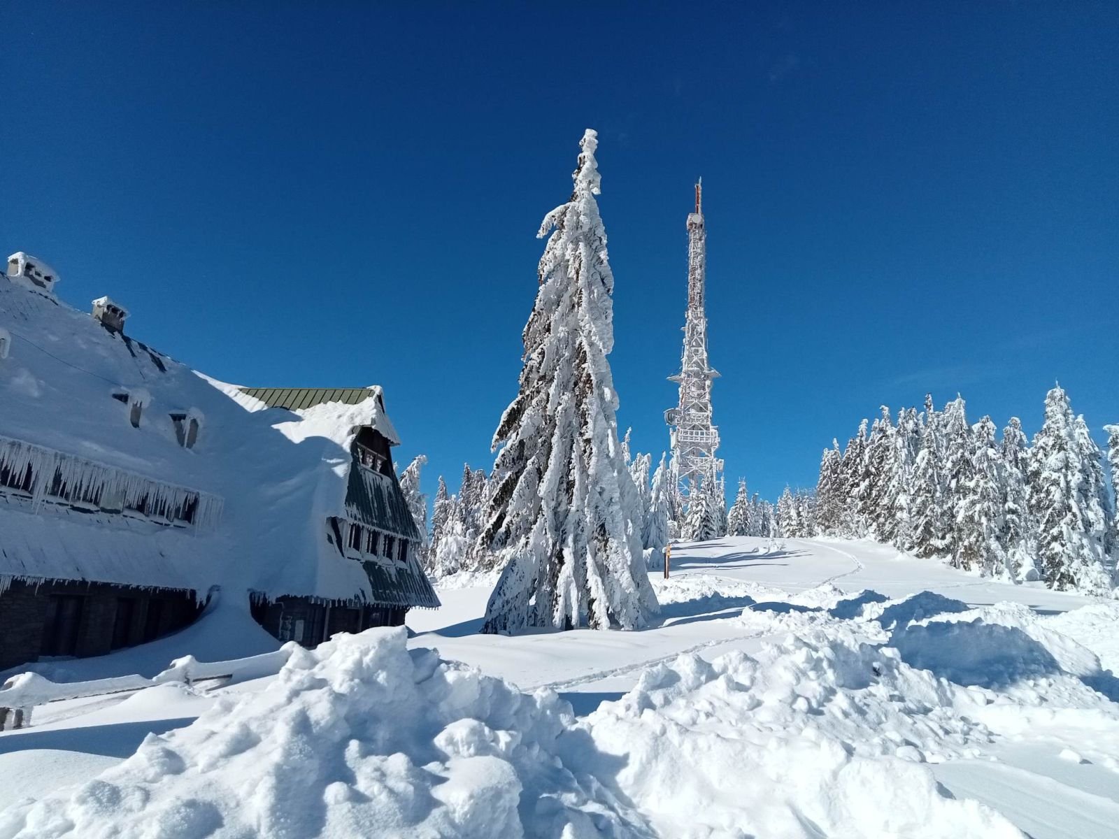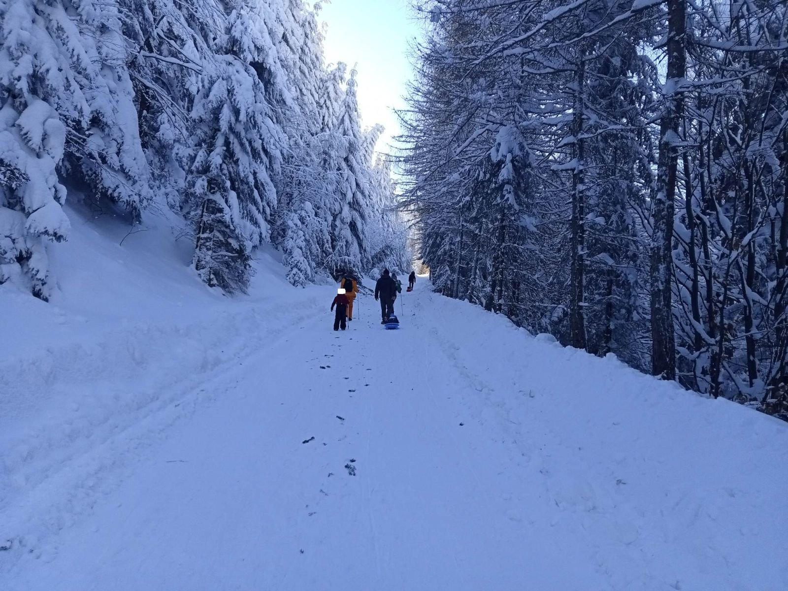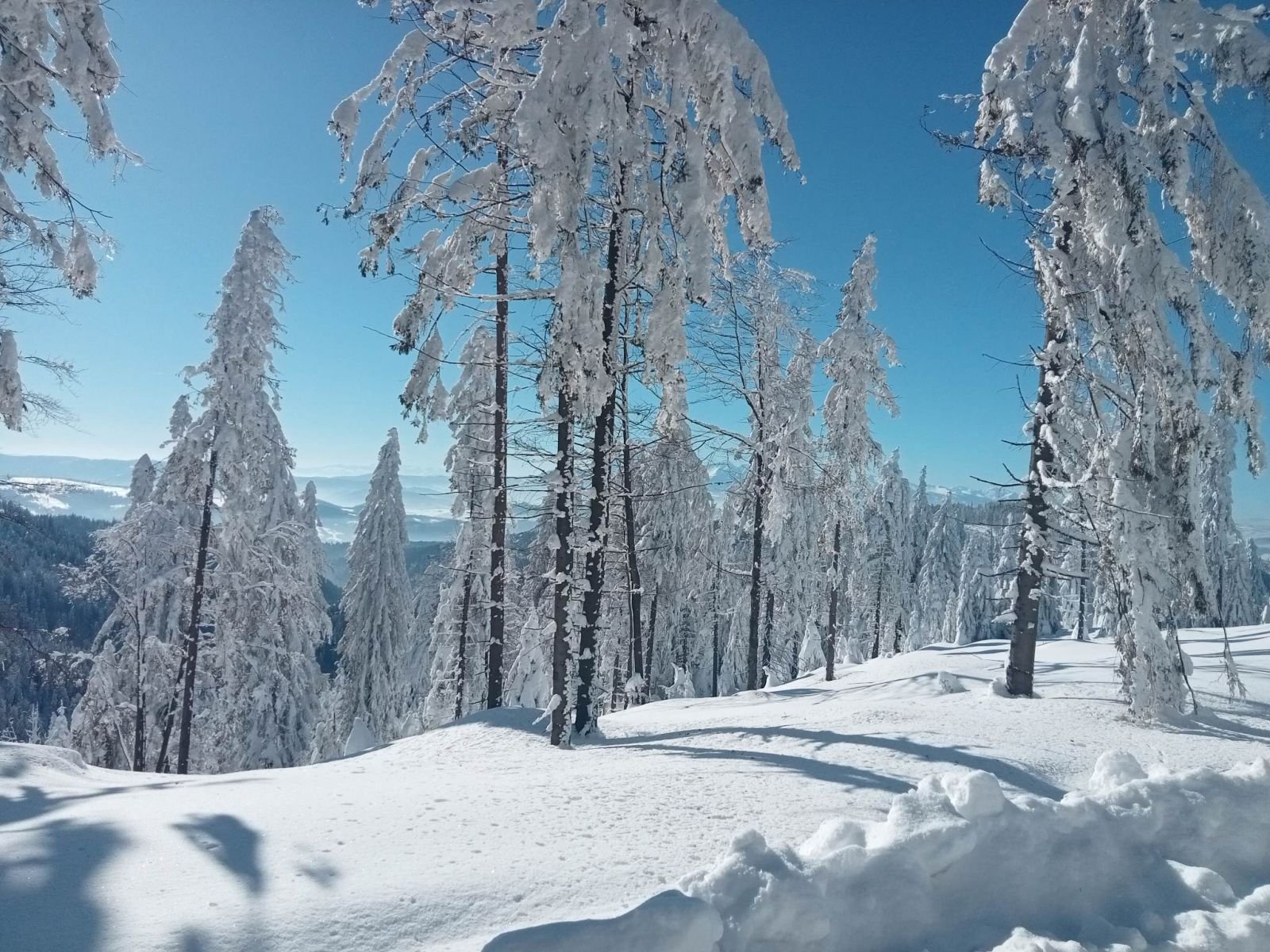 Trasa z Gabonia do Przehyby była przez nas pokonywana wiele razy, zresztą każdy sezon zaczynamy od tego podejścia. W zimie wygląda ona całkiem inaczej niż w sezonie wiosna-lato-jesień, po prostu jakby to było całkiem inne miejsce. Od kilku tygodni nie było w pełni pogodnego dnia i prognozy sprawiały, że zdecydowaliśmy się pierwszy raz wybrać w góry zimą. Na ten sam pomysł wpadli inni turyści i dziesiątki samochodów zapełniły nie tylko parking, ale okolice przystanku w Gaboniu. Tak wielu turystów na tym szlaku nie widzieliśmy jeszcze - nawet przy wysypie grzybów, a ten wśród grzybiarzy jest niezwykle ceniony. Czas ferii zrobił tez swoje, ostatnio Przehyba też przewijała się w mediach co też przypomniało ludziom o tej trasie. temperatura około -12 i pomimo bezchmurnego nieba miejsc gdzie towarzyszy nam słońce - wielu nie ma. Droga do schroniska jest lepiej utrzymana niż nie jeden dojazd w niektórych przysiółkach. Z tego co się dowiedzieliśmy droga w razie potrzeby jest odśnieżana raz dziennie! To nie jest tak, że idziemy po kolana w śniegu, zresztą widać to po zdjęciach. Jest to jedyny szlak w takim stanie, reszta jak czerwony czy zielony do Jazowska jest nieprzetarty śniegu "po pachy". Oczywiście jeżeli są bardzo duże opady warto się wstrzymać z wyjściem - tu zagrożenie ze strony drzew, które mogą opaść na drogę. Warto słuchać aktualnych komunikatów - ostrzeżeń pogodowych. Wyjście na Przehybę zajęło nam niecałe dwie godziny, w schronisku także sporo osób, chwila odpoczynku przy gorącym napoju. Z powrotem bardzo fajnie po śniegu się schodzi, po około 1:30h jesteśmy już z powrotem na parkingu.