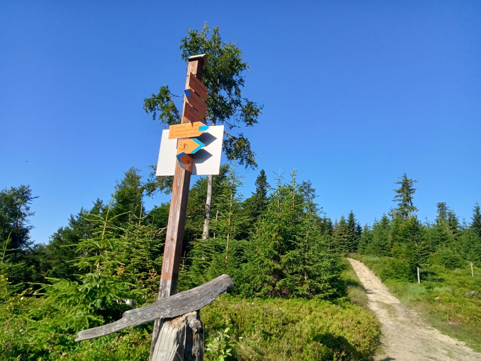 Tuż przed samą Przehybą mniej więcej na wysokości nadajnika skręcamy na niebieski szlak do Szczawnicy. Niebieski szlak równolegle biegnie z zielonym , czas dojścia wyznaczono taki sam - 3 godziny. Natomiast z Jazowska 3:30 mniej więcej do tego miejsca, nam udało to się pokonać w około 2:30 i znowu nie jest to jakiś extra wynik.