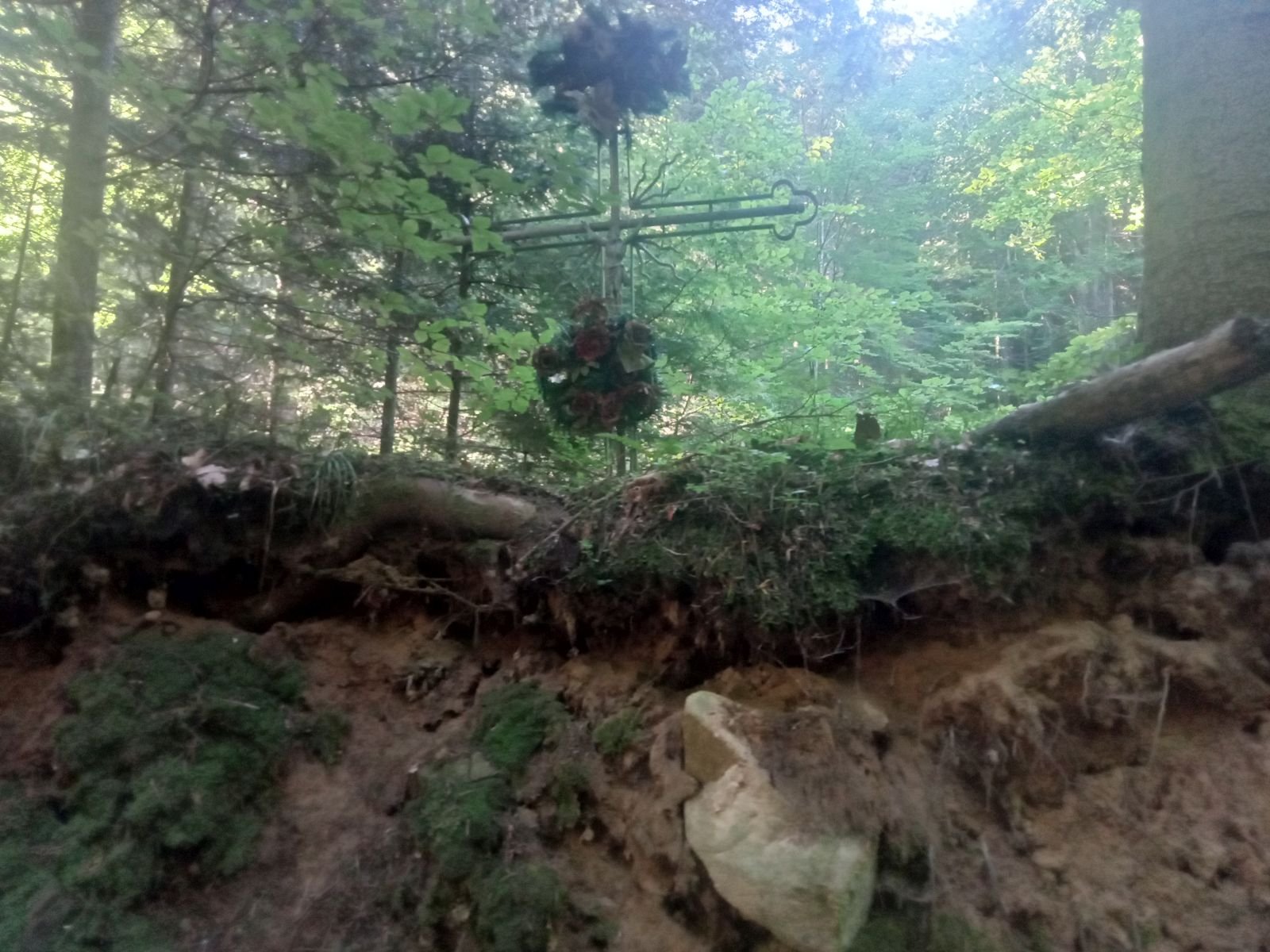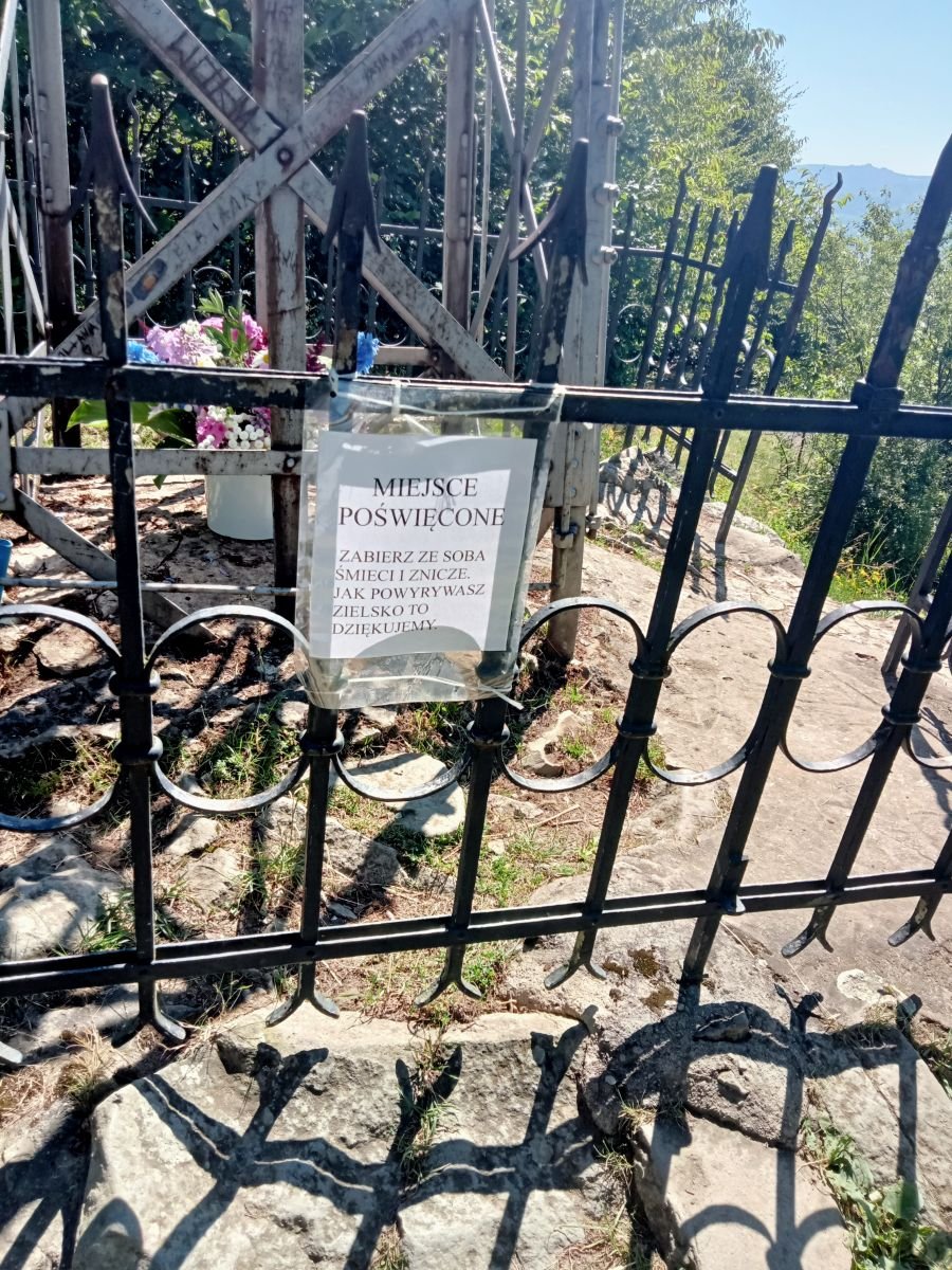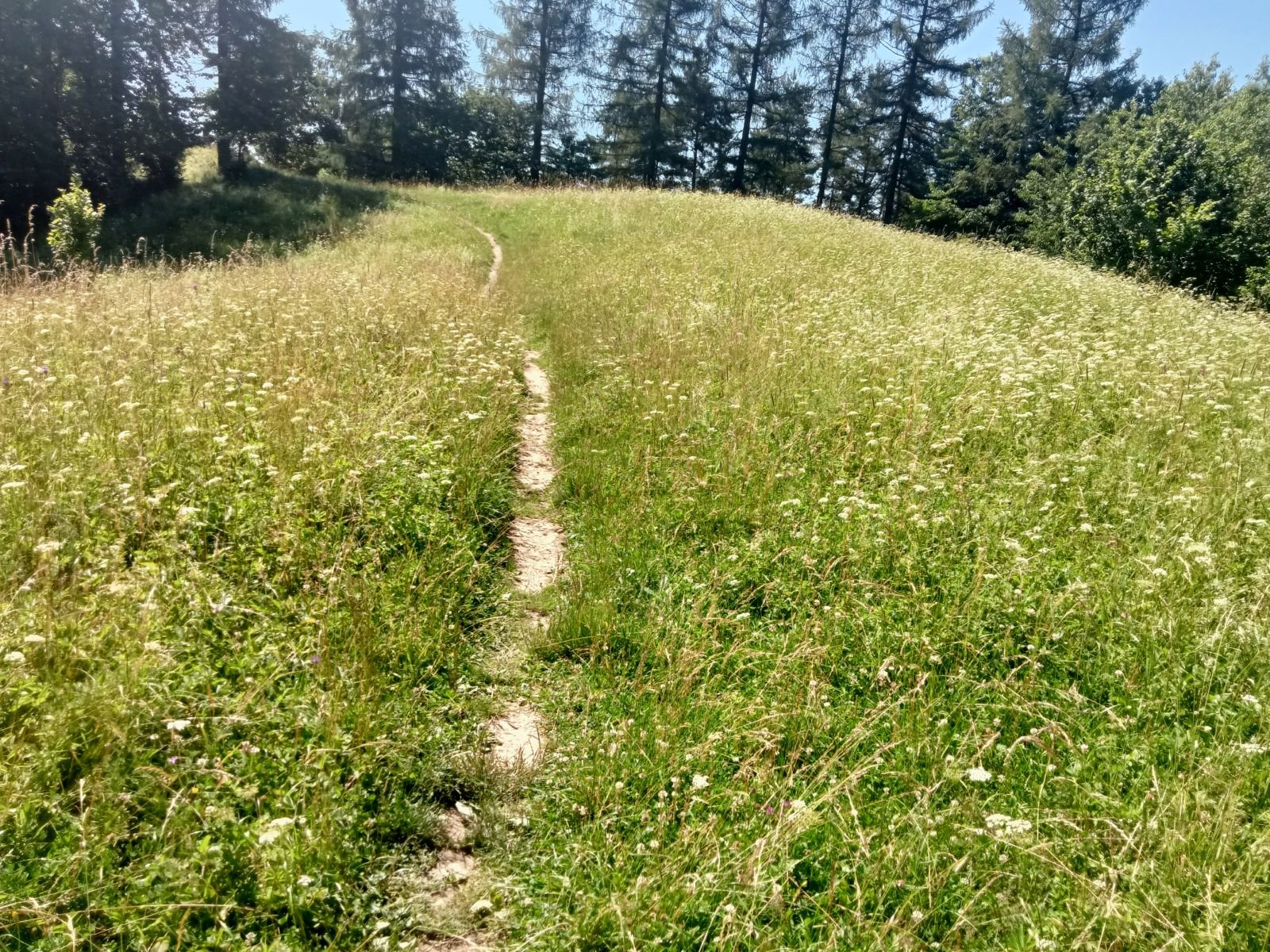 Do Krzyża na Bryjarce nie szliśmy żółtym szlakiem lecz taka fajną ścieżką po łące. Od schroniska kilkanaście minut. Następnie w prawo zejście na żółty szlak i kierunek Plac Dietla. Nie widać tego na zdjęciu, ale sporo osób wokół.