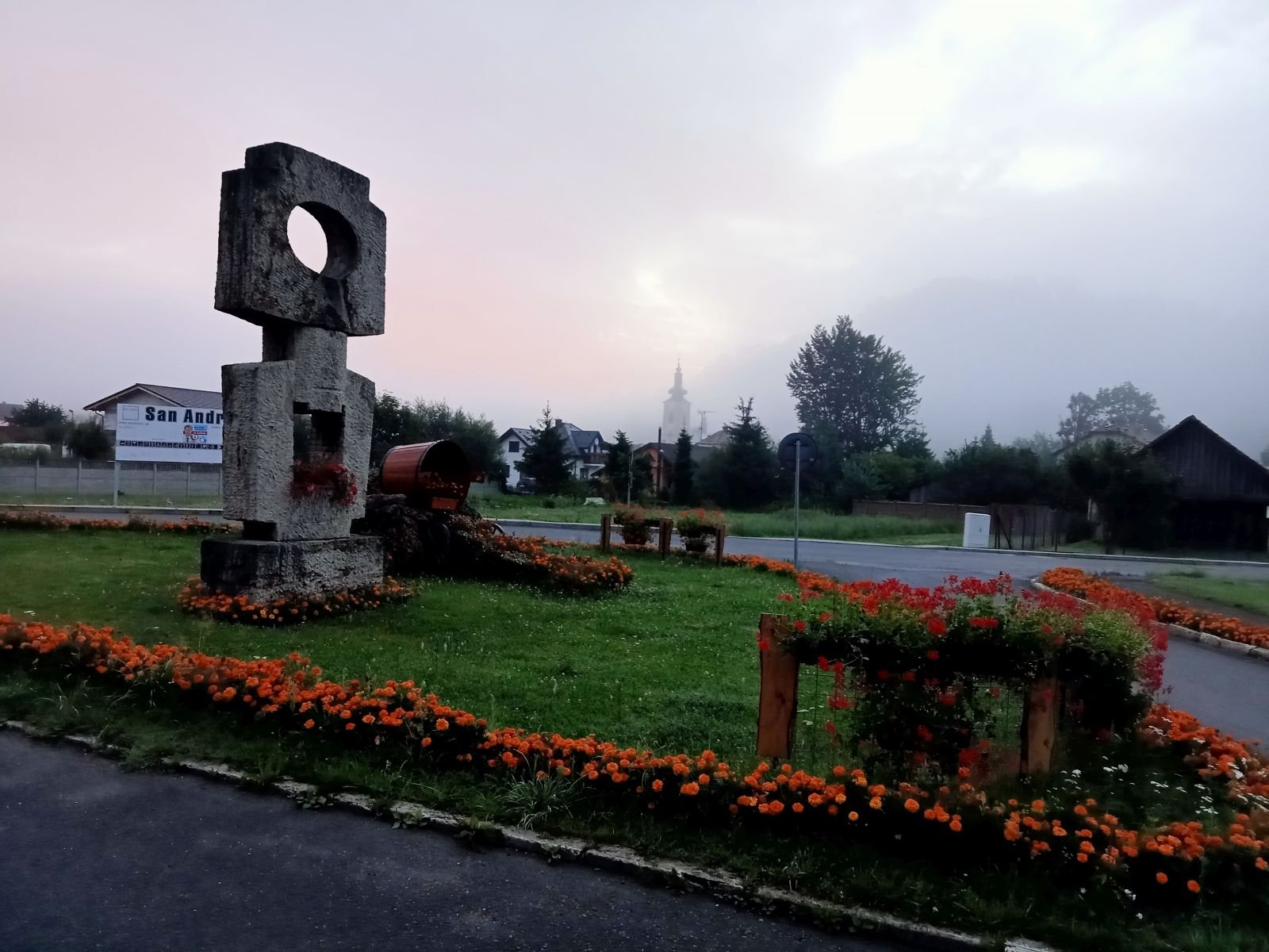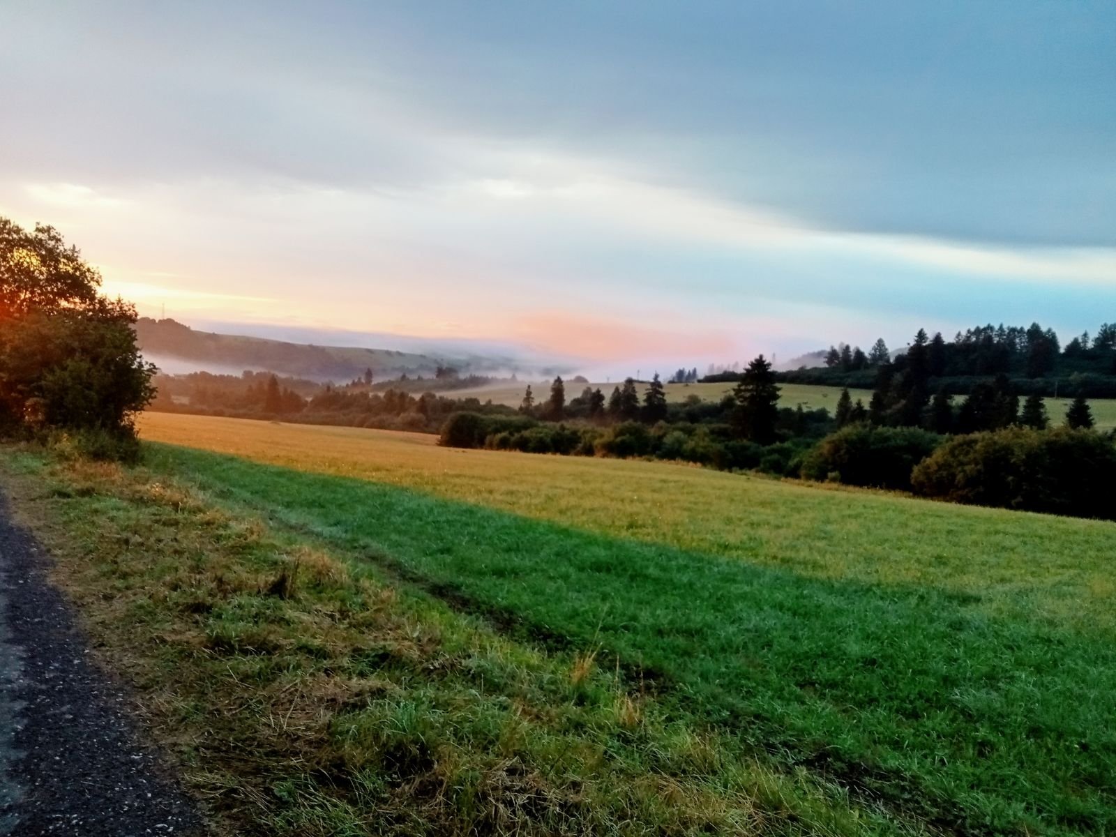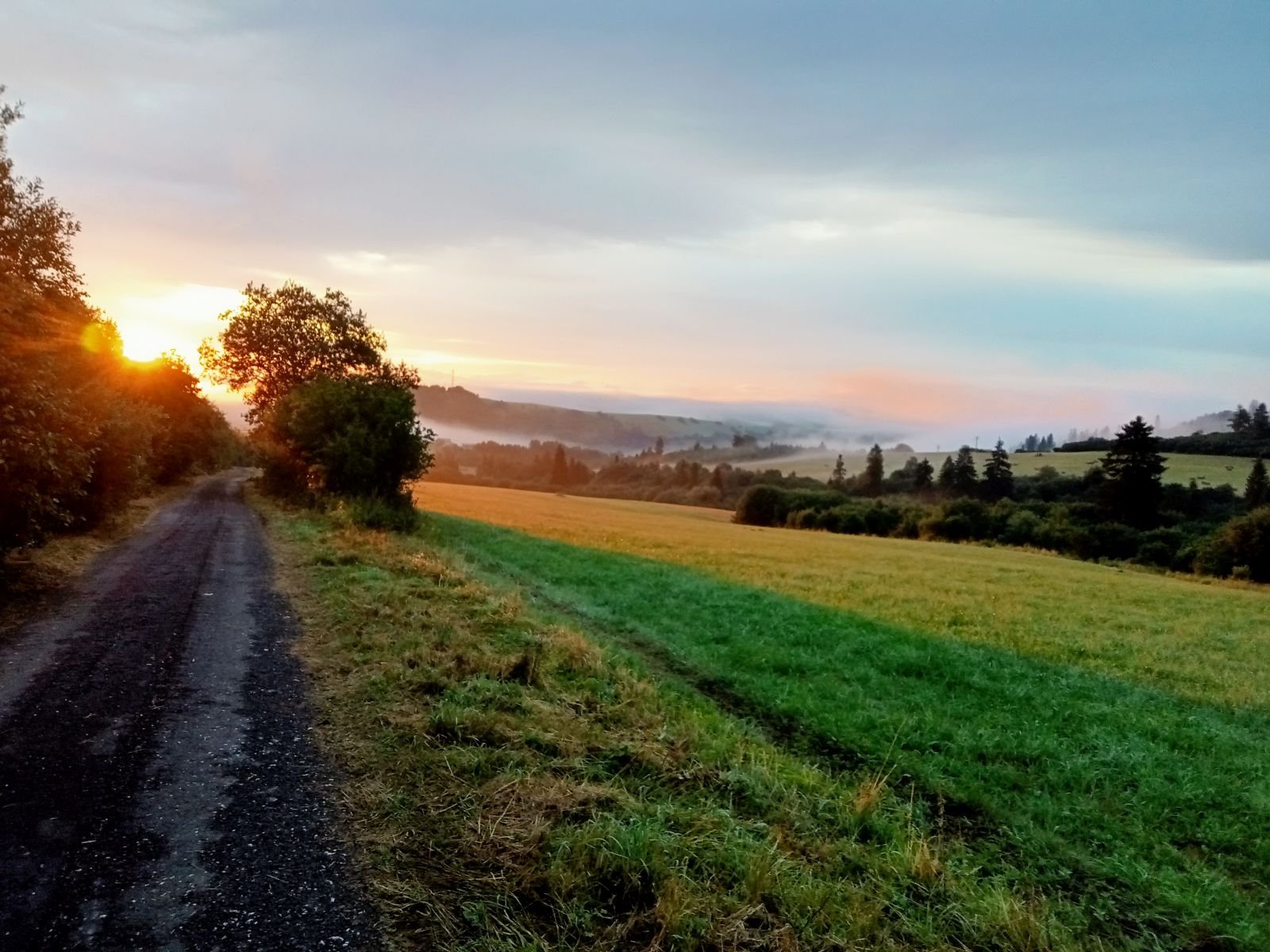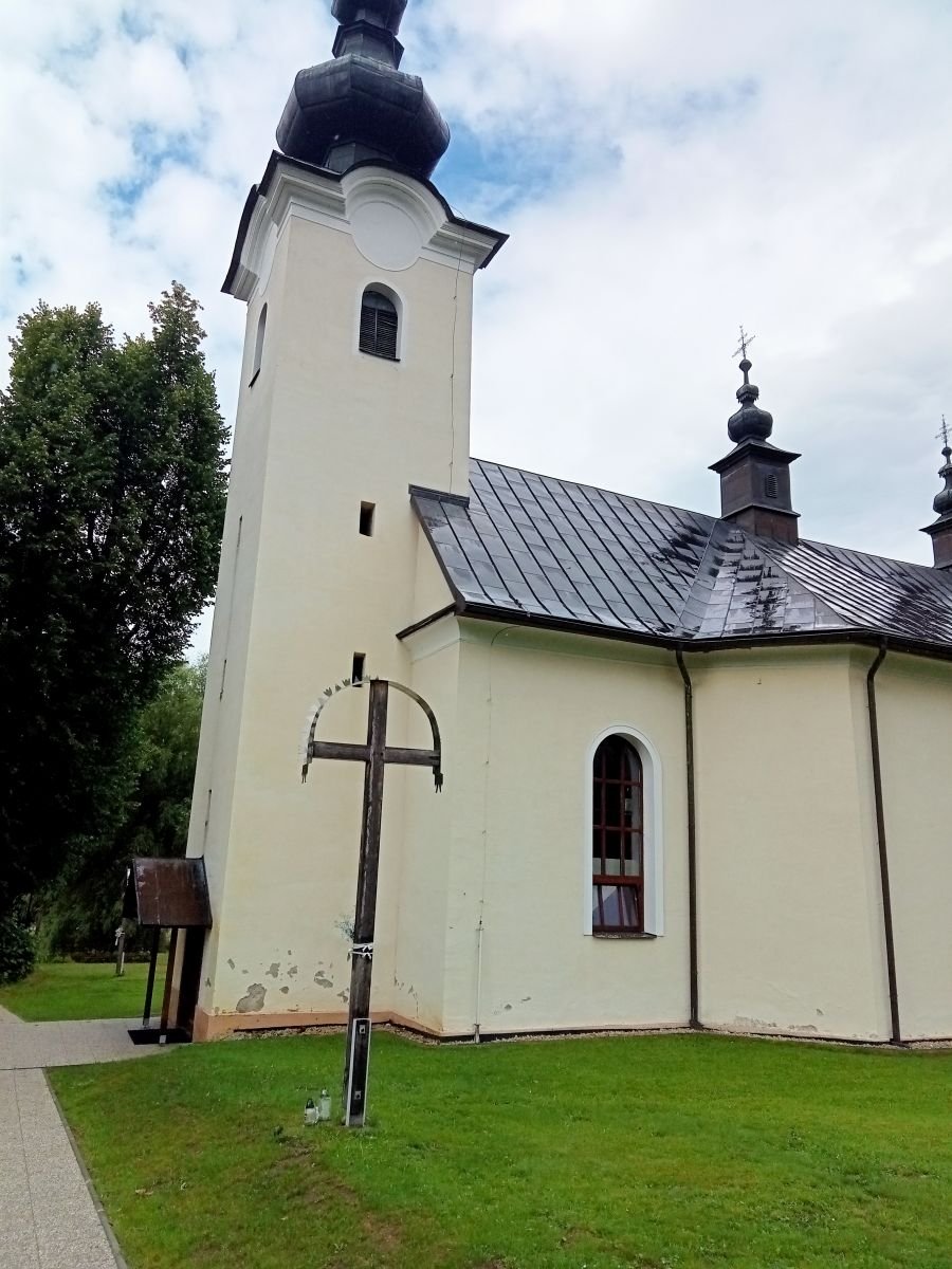 Po noclegu, pobudka o 4:00 i wyruszamy o 5:00. Buty po poprzednim dniu dalej całe mokre. Dobrze, że mamy ze sobą po kilka par zapasowych skarpet. Ciepły poranek, jest mgła. Nie ma żywej duszy w zadbanym centrum choć i może pamiętającym poprzednią epokę. Nie ma co nas cieszy.... psów ;) Kościół uroczo chowa się za mgłą wchodzimy na szlak do Podolinca.