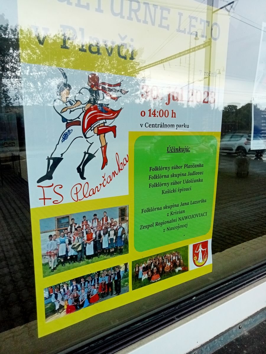 Kulturalne lato. W tym dniu swój występ zaplanowany miał Zespół Regionalny Nawojawiacy z Nawojowej. Plakaty wywieszony na szybie dworca. Przy tej stacji dawniej było przejście graniczne Muszyna-Plaveč o czym można szerzej przeczytać - kliknij