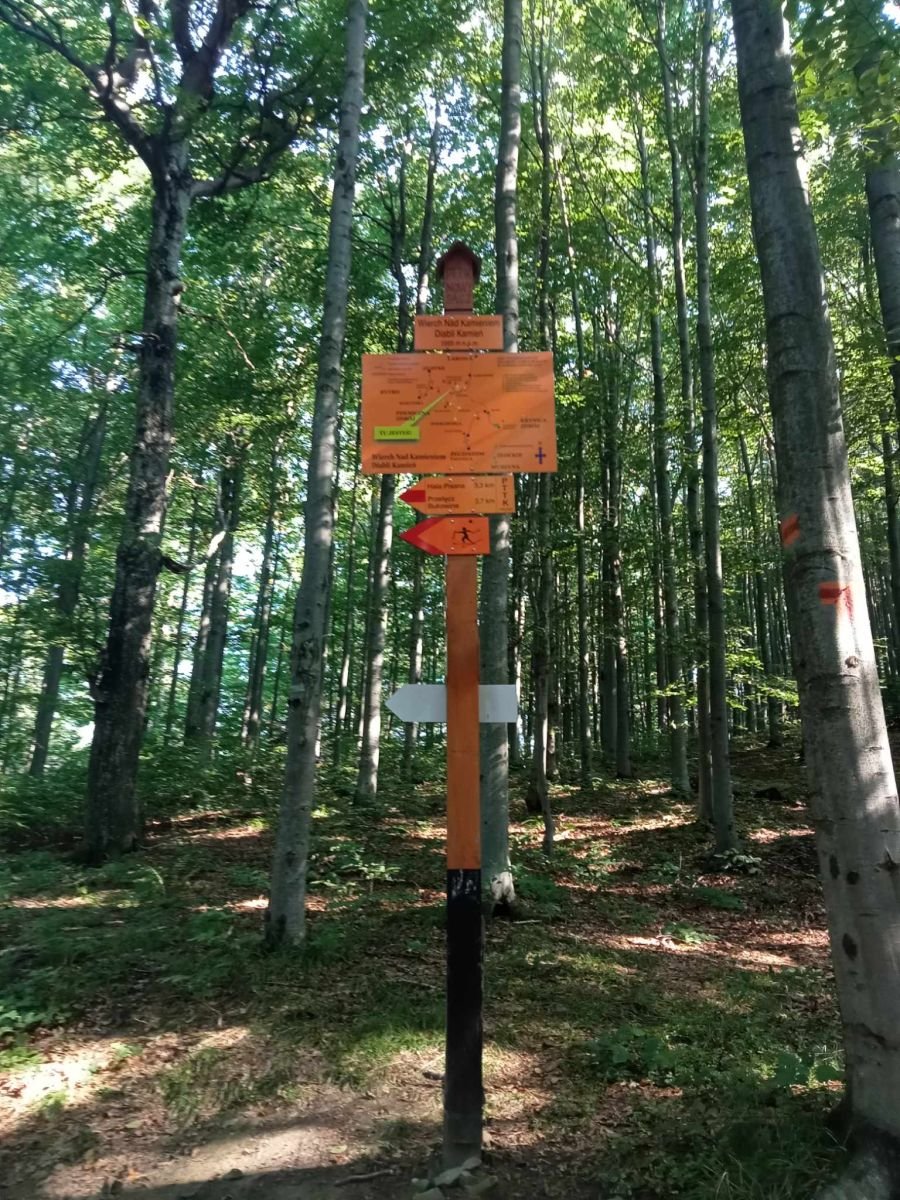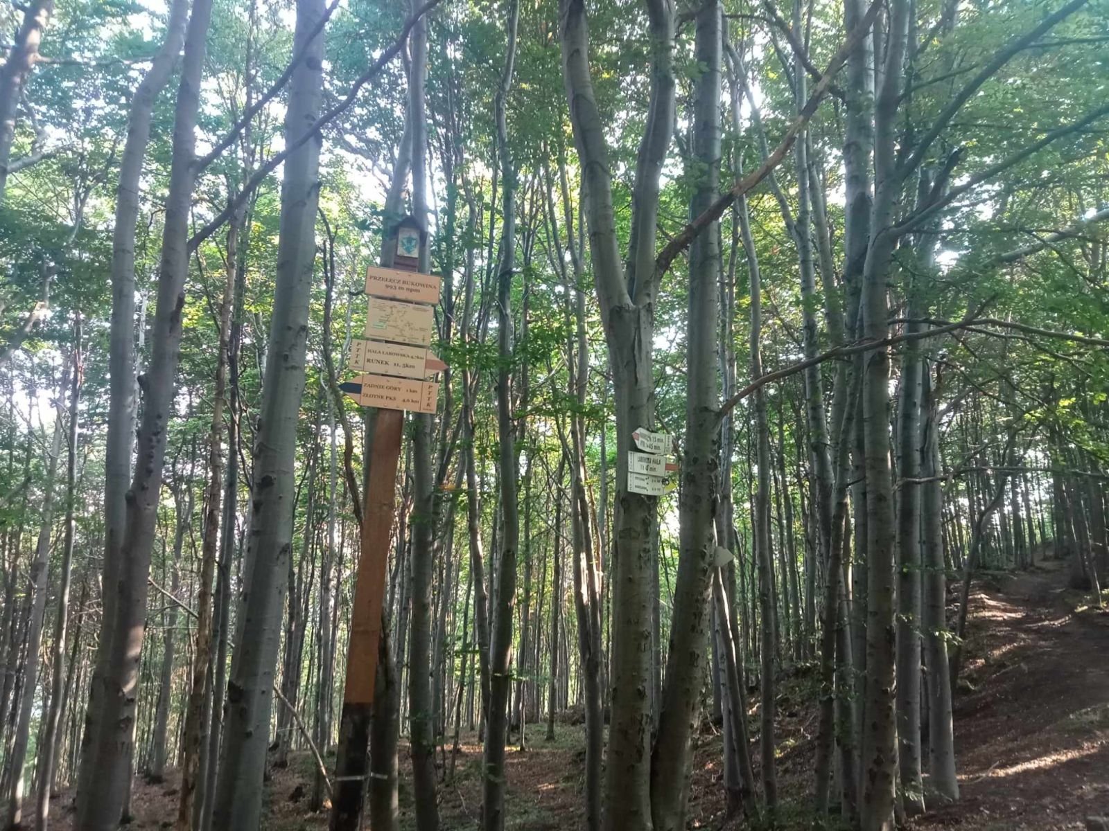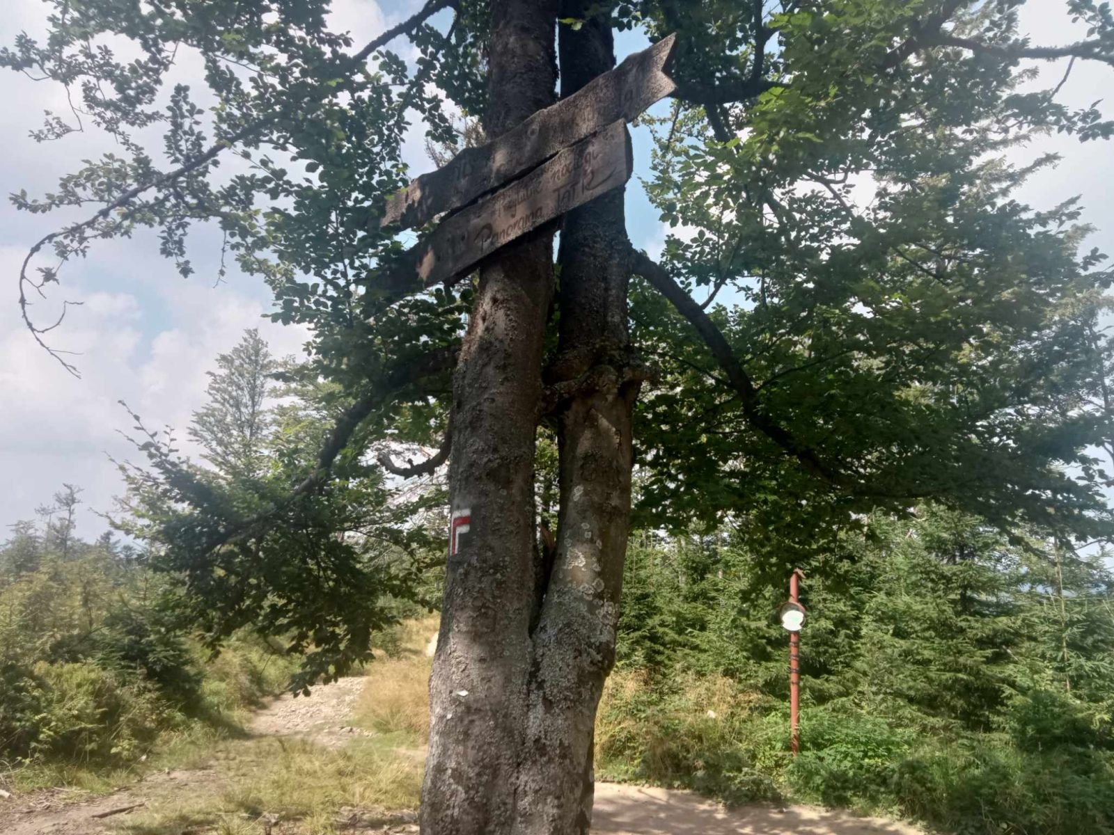 Tabliczki na przełęczy Bukowina. Sama Przełęcz Bukowina jest porośnięta lasem, znajduje się tutaj rozwidlenie szlaków pieszych. Pomiędzy bukowinami kończy się szlak żółty, przez przełęcz przebiega Główny Szlak Beskidzki (GSB) /beskidsadeck.ieu/