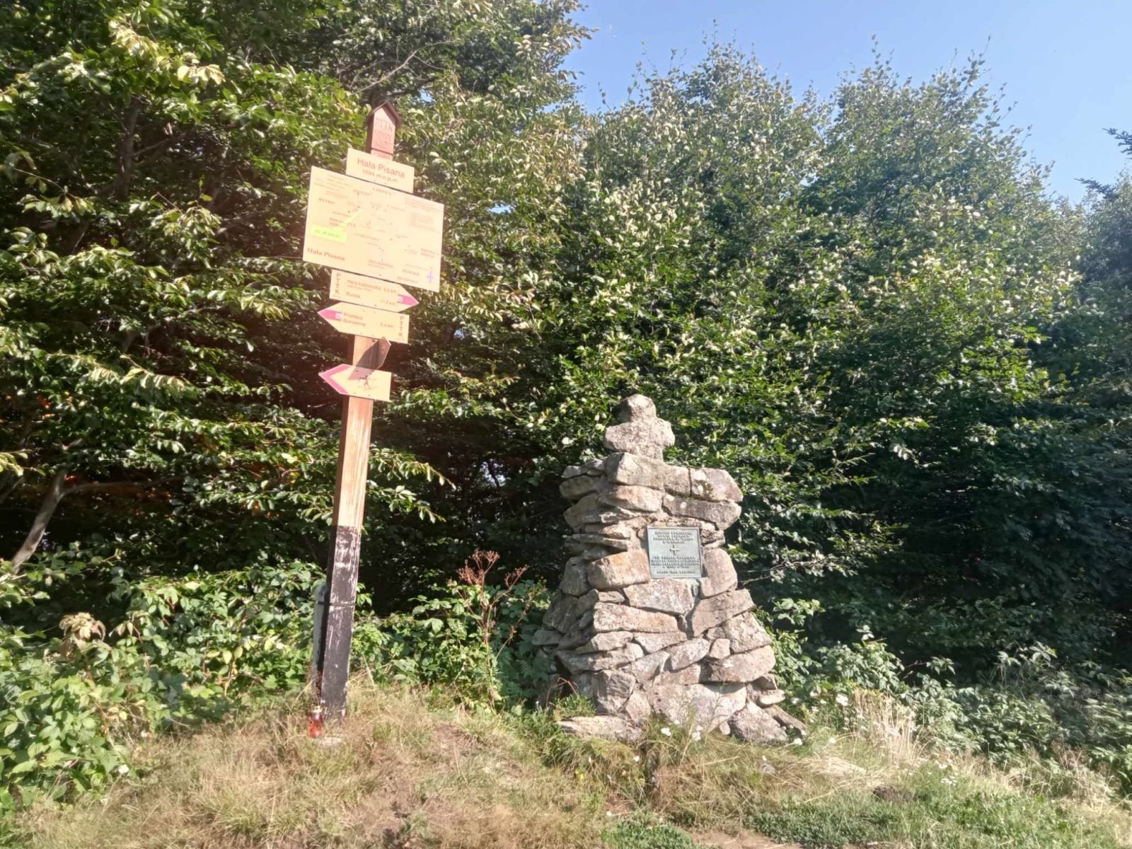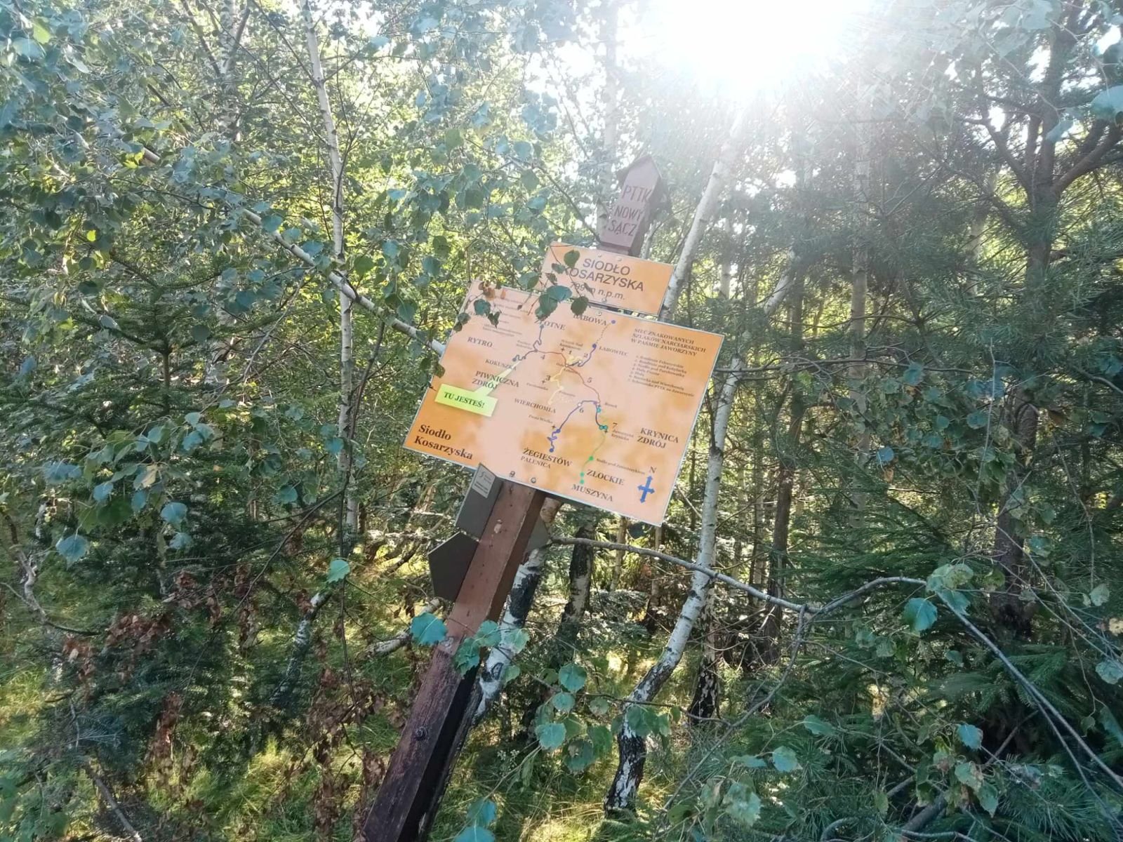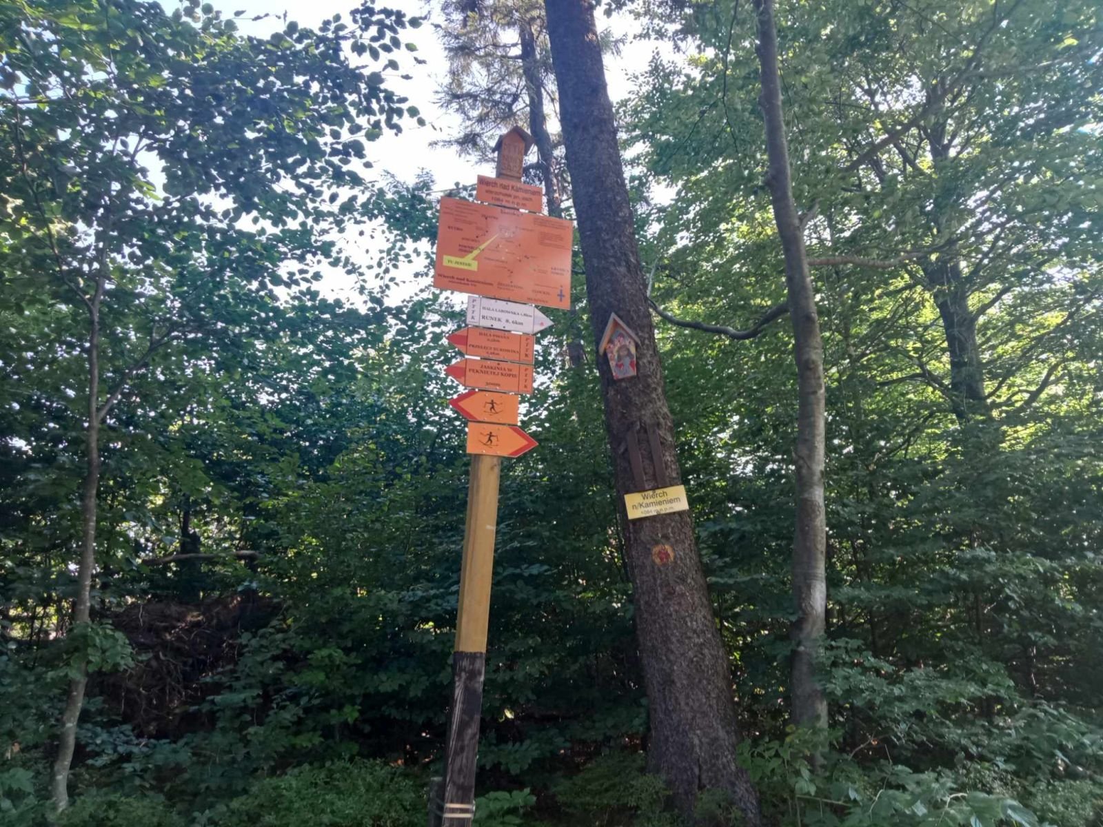 Tabliczki na przełęczy Bukowina. Sama Przełęcz Bukowina jest porośnięta lasem, znajduje się tutaj rozwidlenie szlaków pieszych. Pomiędzy bukowinami kończy się szlak żółty, przez przełęcz przebiega Główny Szlak Beskidzki (GSB) /beskidsadeck.ieu/